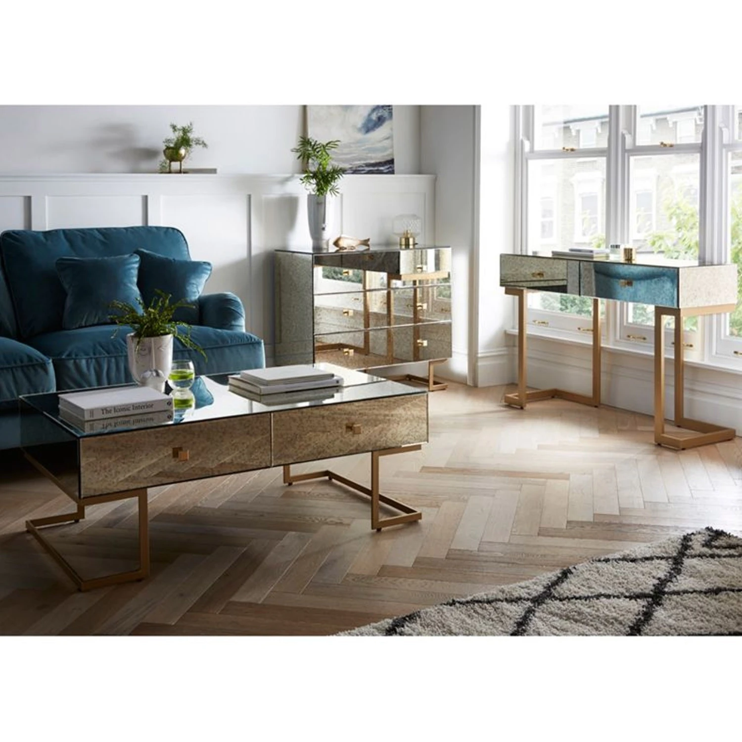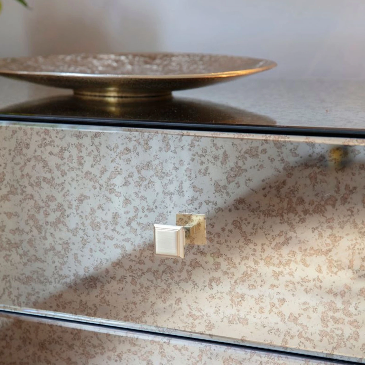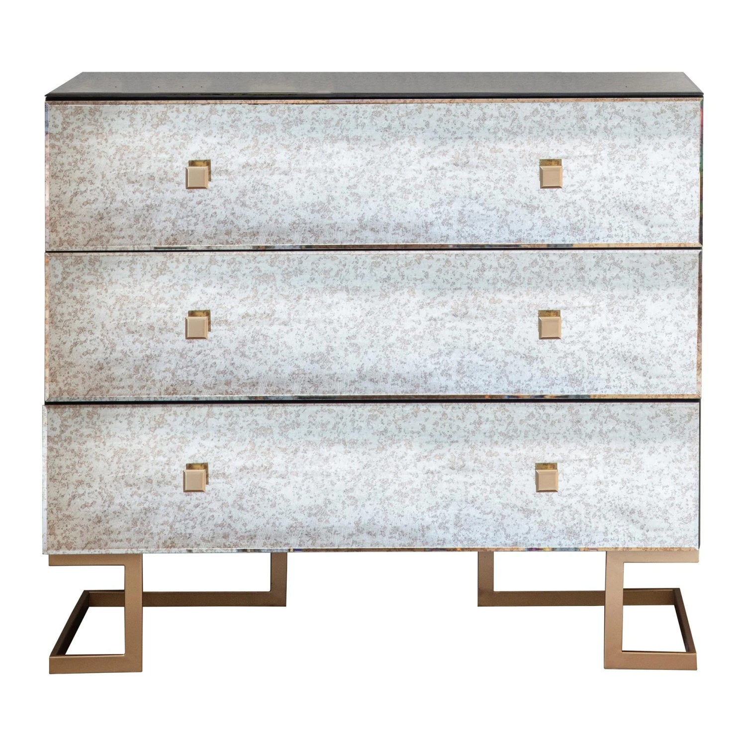 The Amberley 3 Drawer Wide Chest is the latest addition to our range of modern furniture. Finished in an antiqued mirror, this stylish chest of drawers has gold accent handles in a square design and contemporary gold geometric statement legs. With three spacious drawers providing ample storage, this beautiful chest is practical without having to compromise on style.