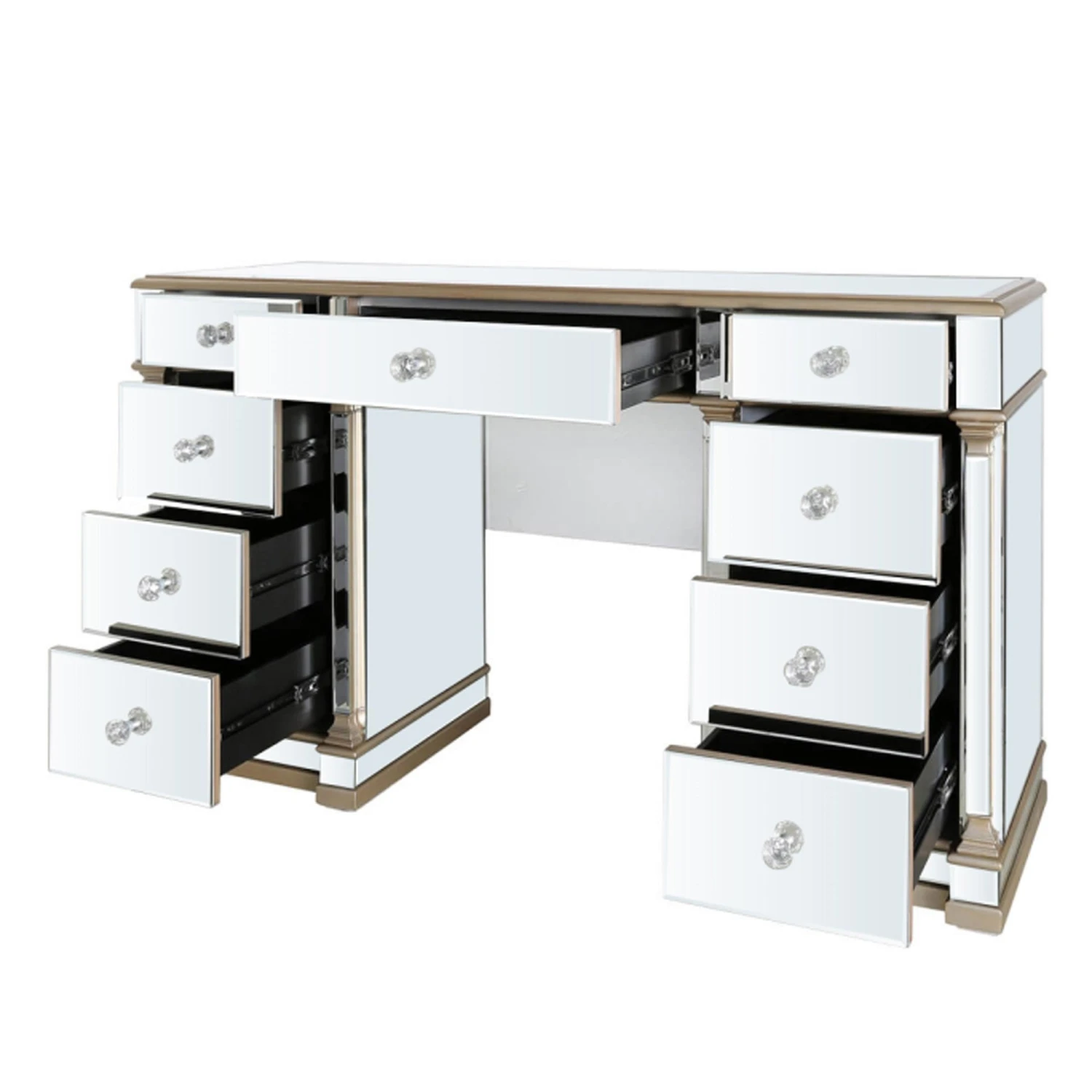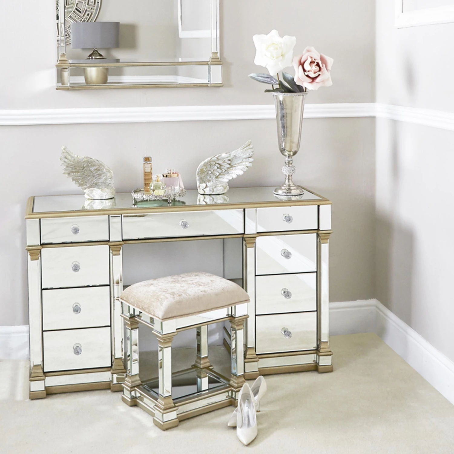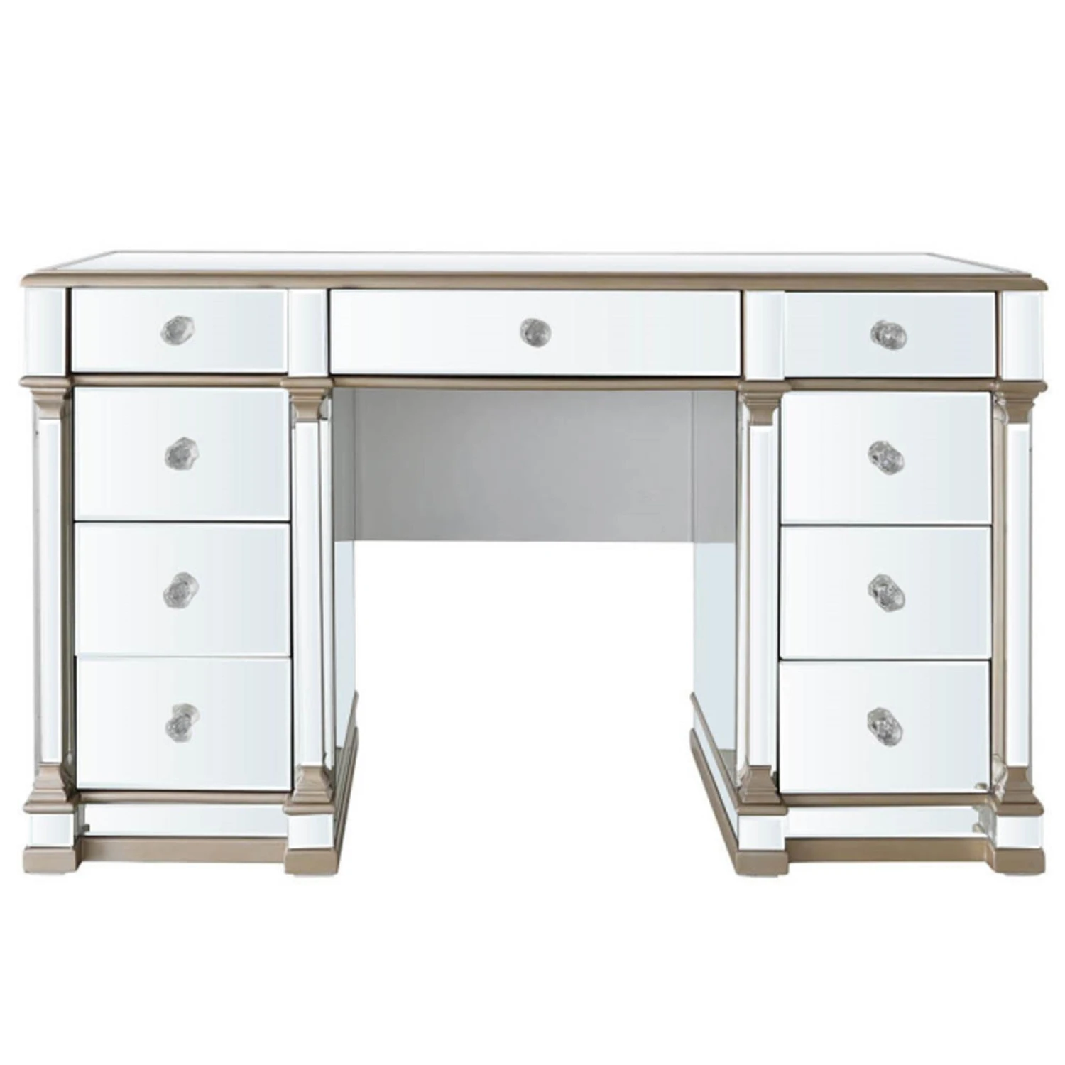 Bring the glam to your bedroom with this Apollo 9 Drawer Mirror Champagne dressing Table . The design features an all over mirror design, trimmed with champagne coloured trim and finished with crystal handles. The dressing table has 9 spacious drawers giving you plenty of storages. Style with a mirror of your choice and matching stool.
