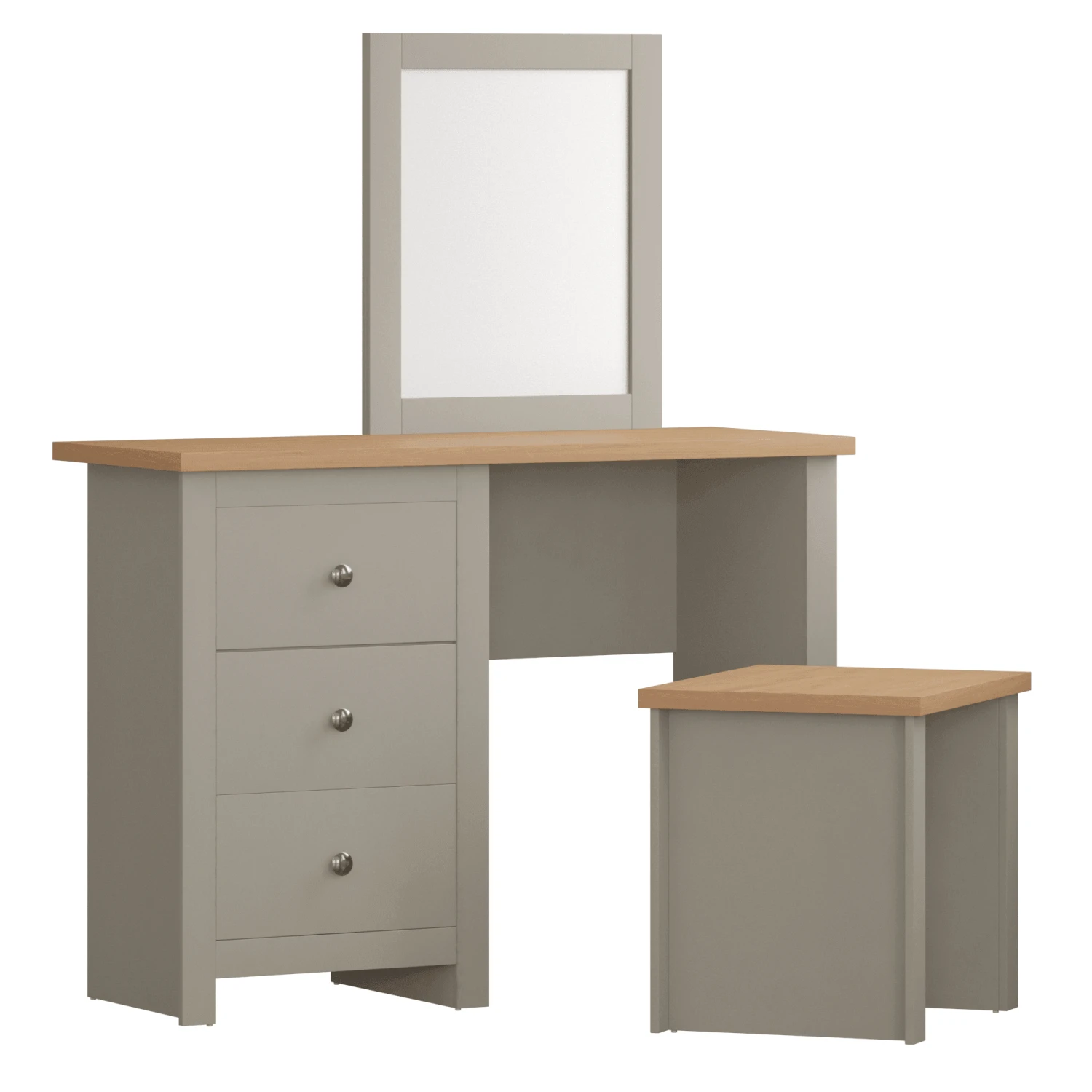 To add to your modern bedroom furniture collection, look no further than the Arlington grey dressing table set. Designed with a square mirror and 3 drawer storage, this is the perfect dressing table to get yourself ready at and store all your makeup and hair accessories. Crafted from a beautiful pine wood and set with a painted grey finish, this dressing table comes complete with a wooden box style stool. A simple but powerful design that will draw attention when entering the room.