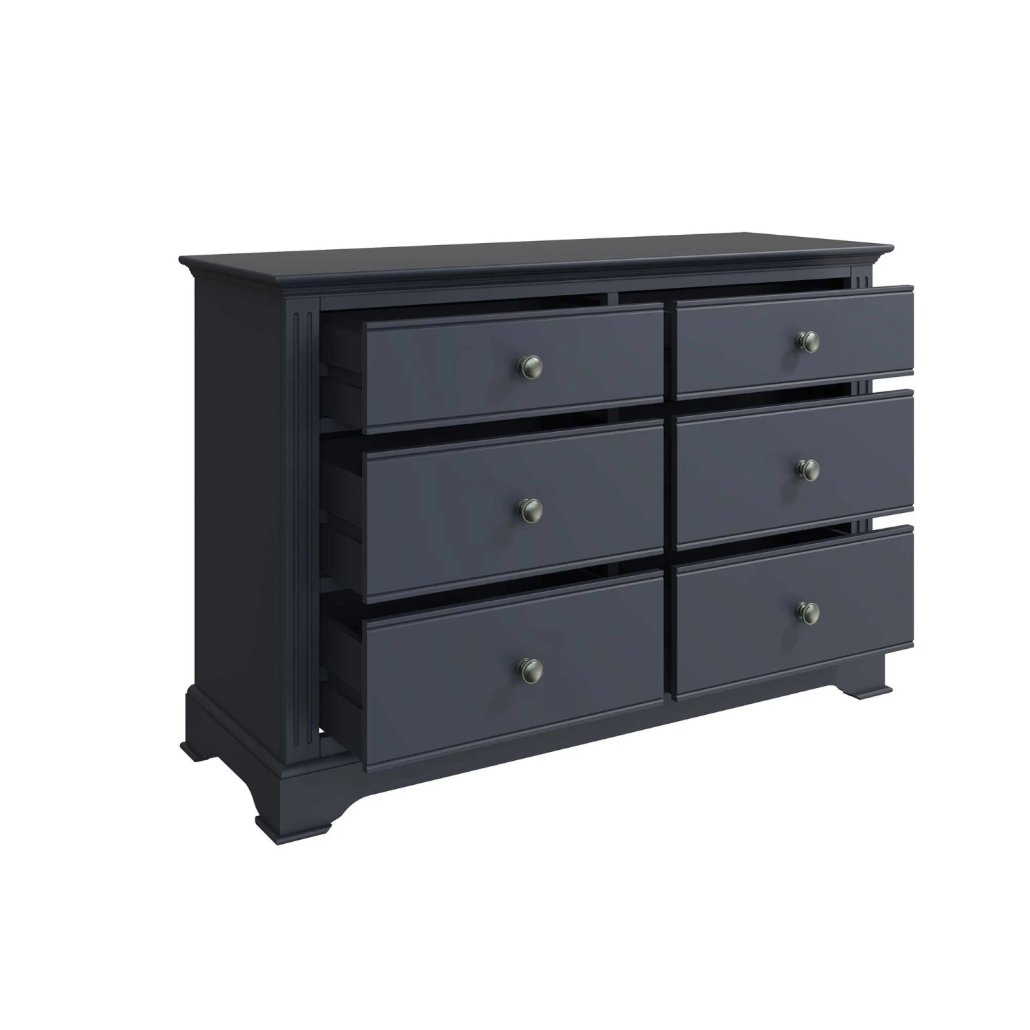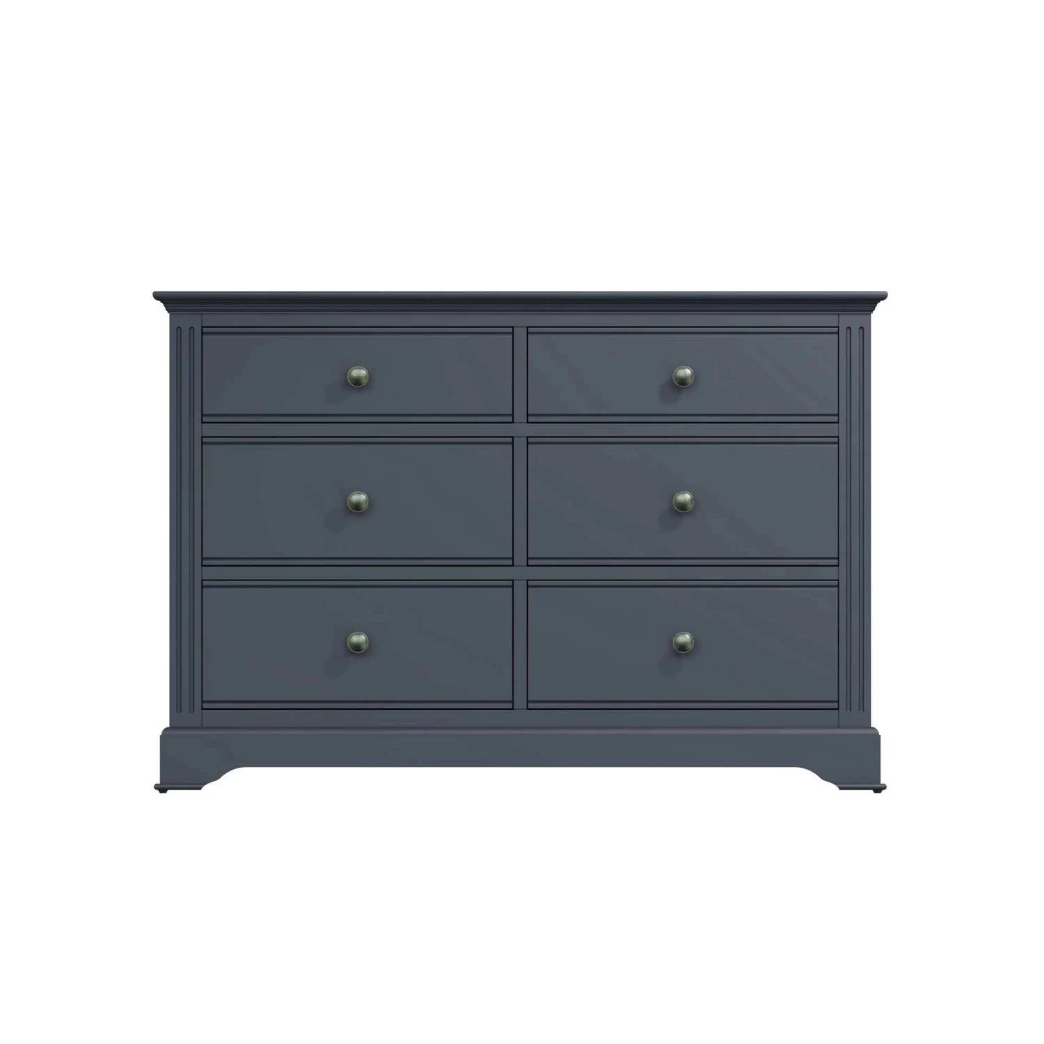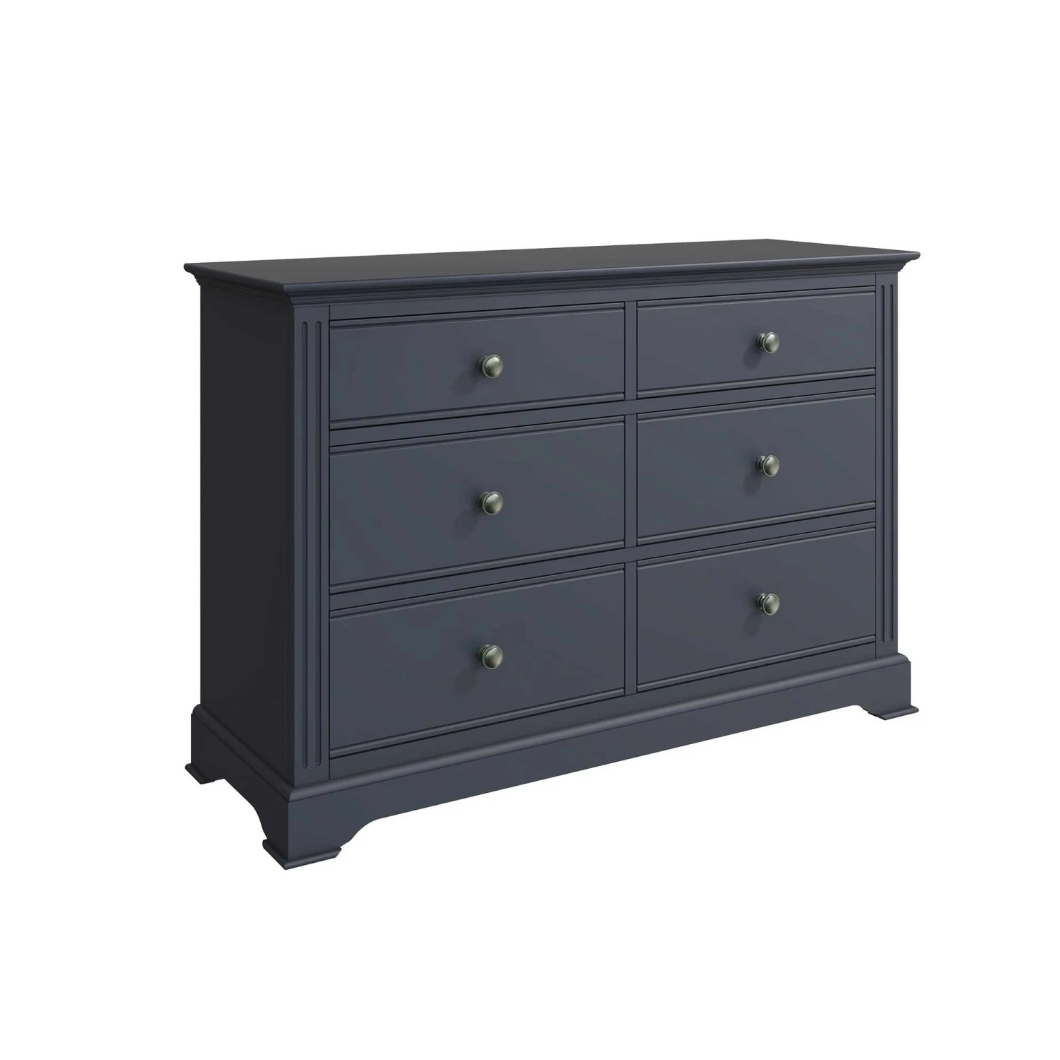 Complete the contemporary look in your modern bedroom with this Burlington Midnight Grey 6 Drawer Chest! This 6 drawer chest features linear ridged detail and aged pewter drawer handles famously known to the Burlington Midnight Grey Bedroom Collection. With 6 spacious drawers, this chest will provide plenty of storage for all your bedding, towels and clothing. Complete with sculpted cornices and a midnight grey finish. Matching items available.