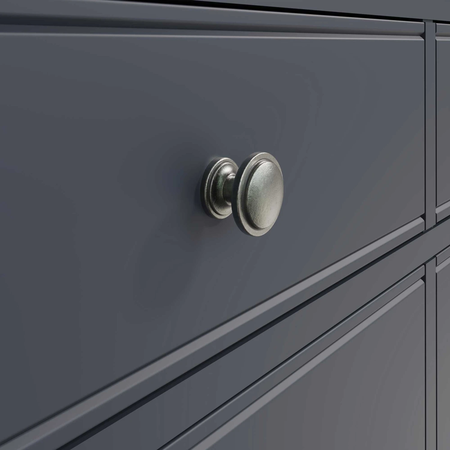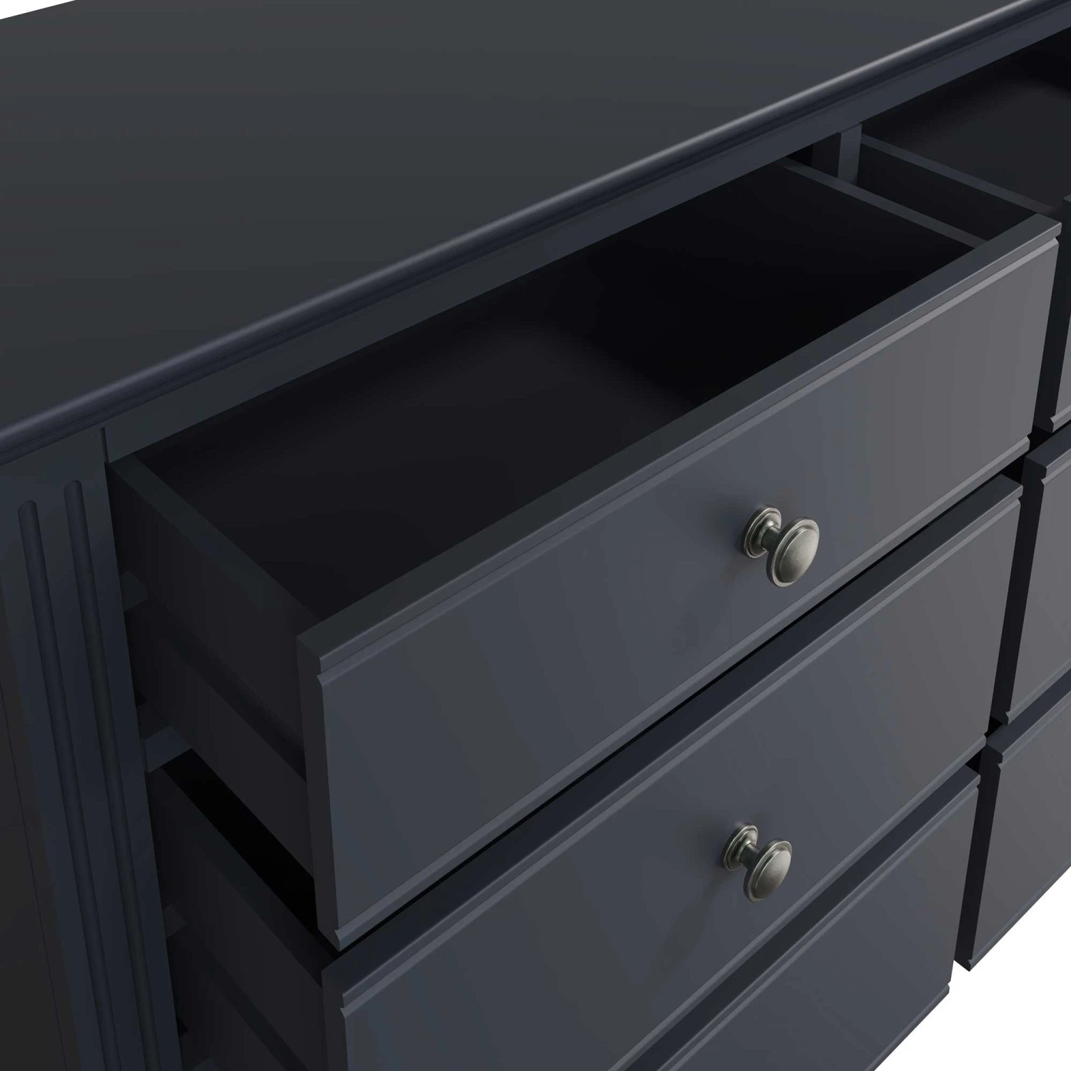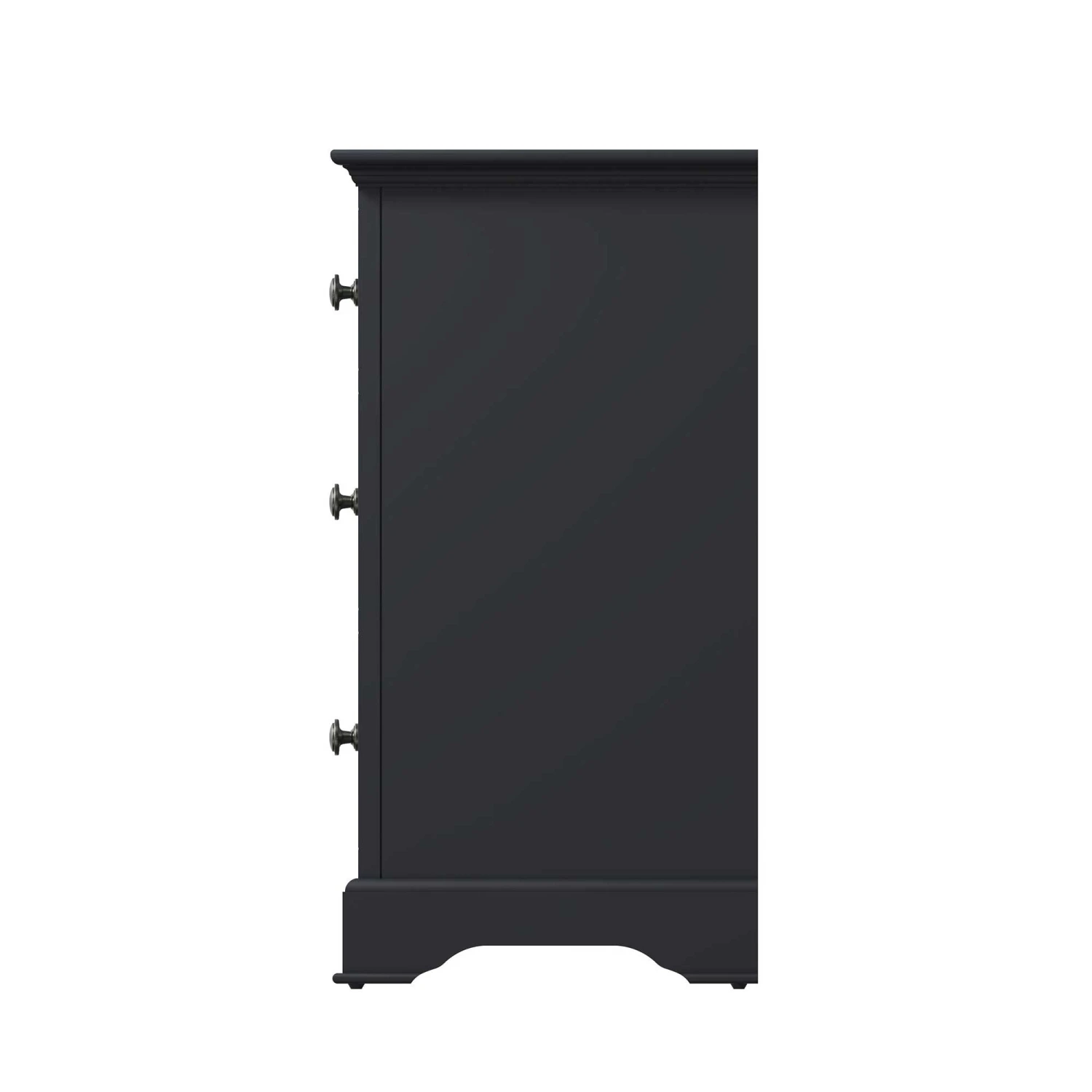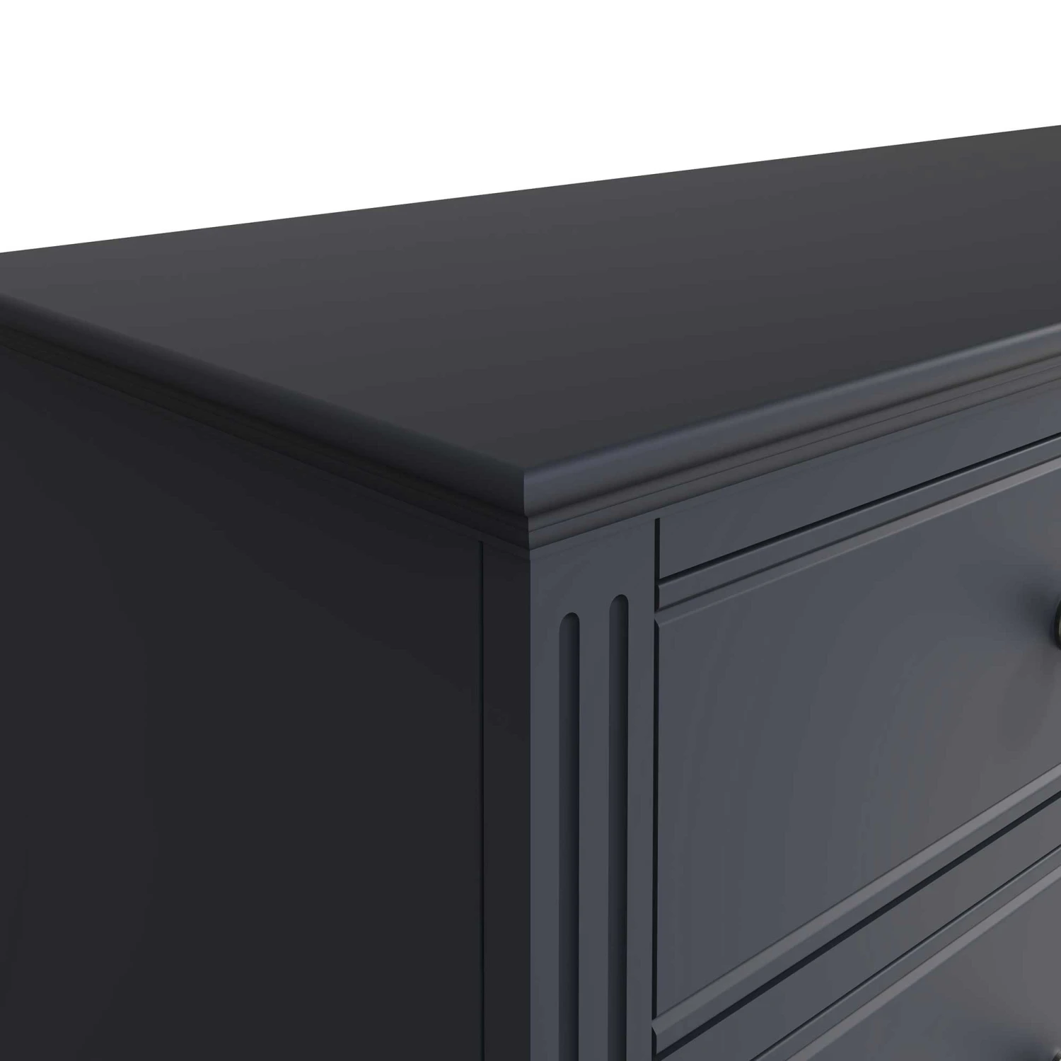 Complete the contemporary look in your modern bedroom with this Burlington Midnight Grey 6 Drawer Chest! This 6 drawer chest features linear ridged detail and aged pewter drawer handles famously known to the Burlington Midnight Grey Bedroom Collection. With 6 spacious drawers, this chest will provide plenty of storage for all your bedding, towels and clothing. Complete with sculpted cornices and a midnight grey finish. Matching items available.