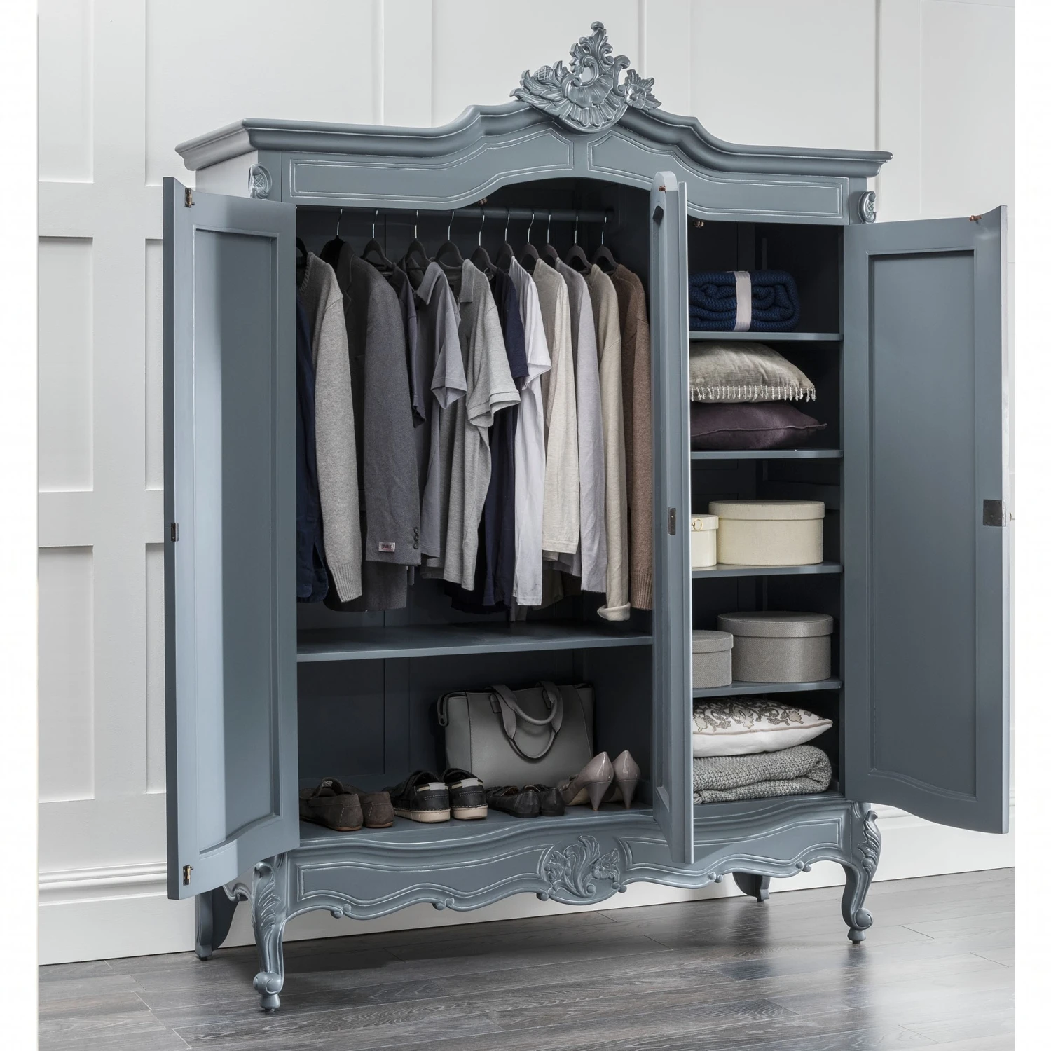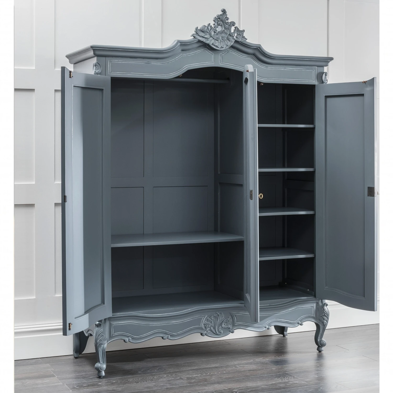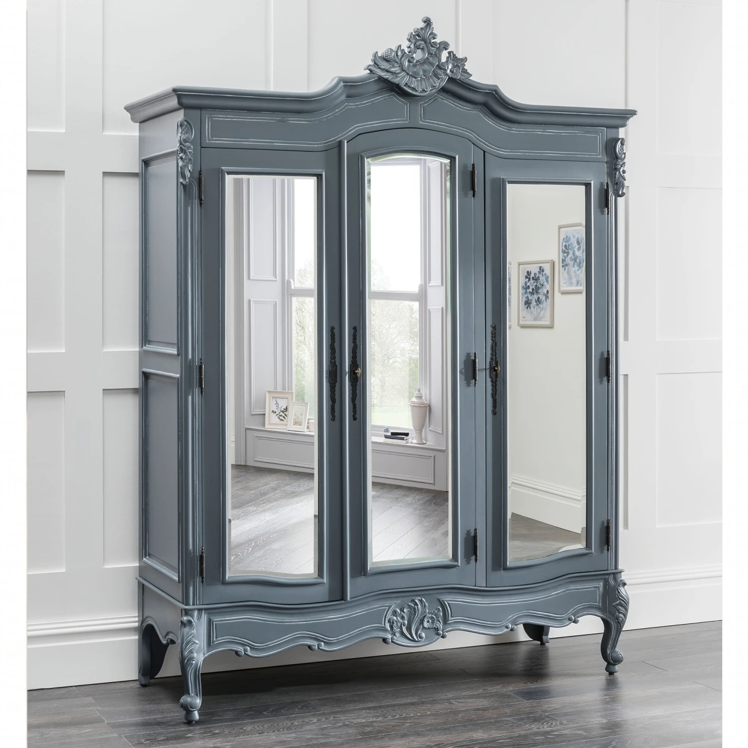 Hand carved from mahogany and finished in a delightful grey, comes this exceptional antique French style grey triple wardrobe from our range of grey furniture. Featuring 3 mirrored doors with plenty of interior space, this beautiful French style wardrobe will provide elegance and style in any home bedroom setting.