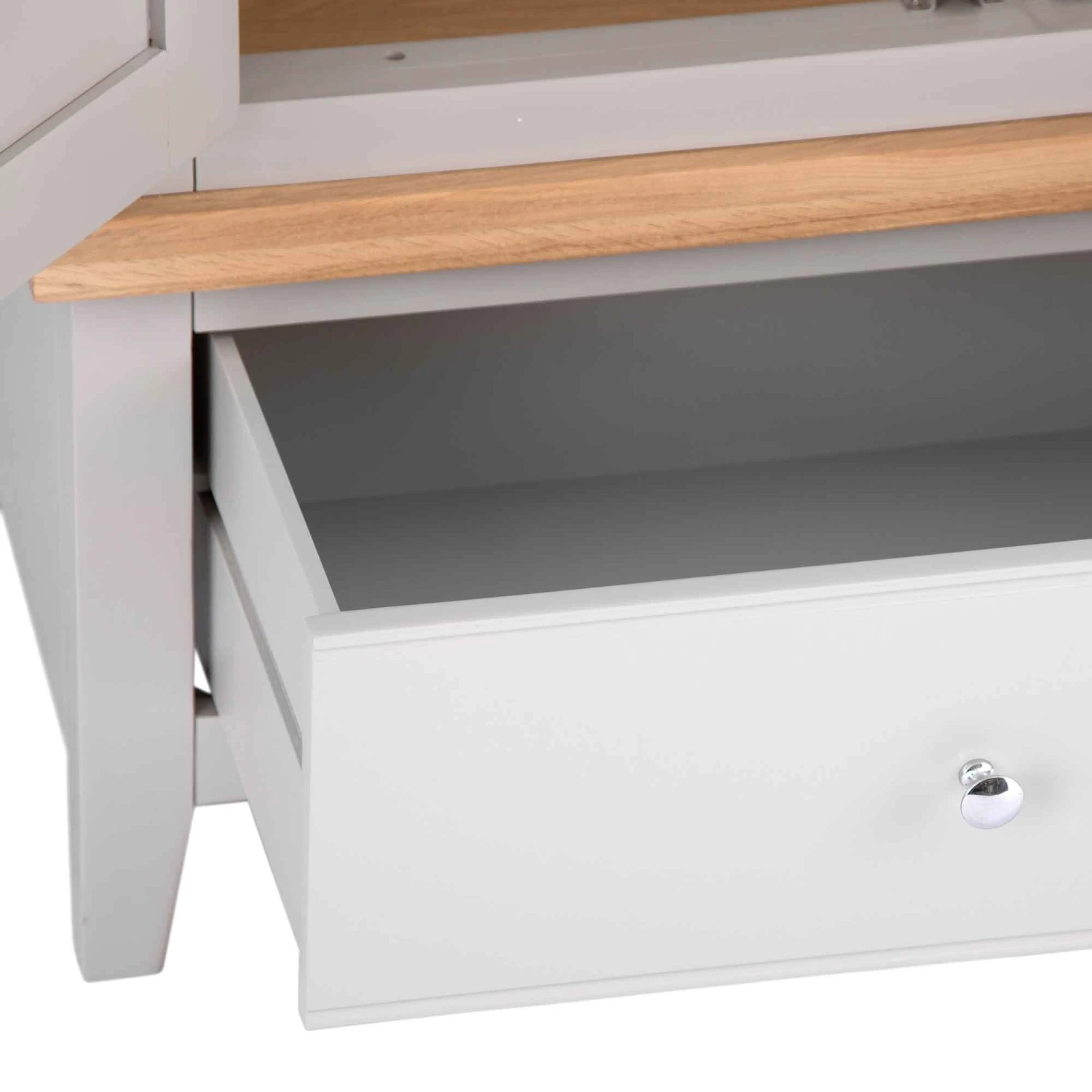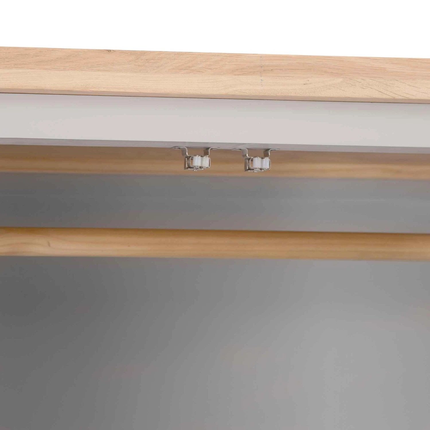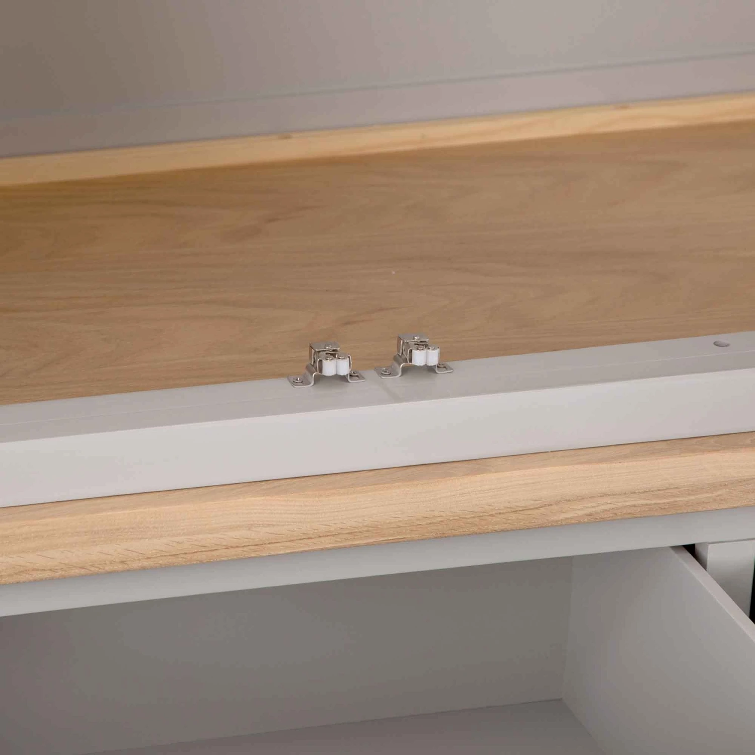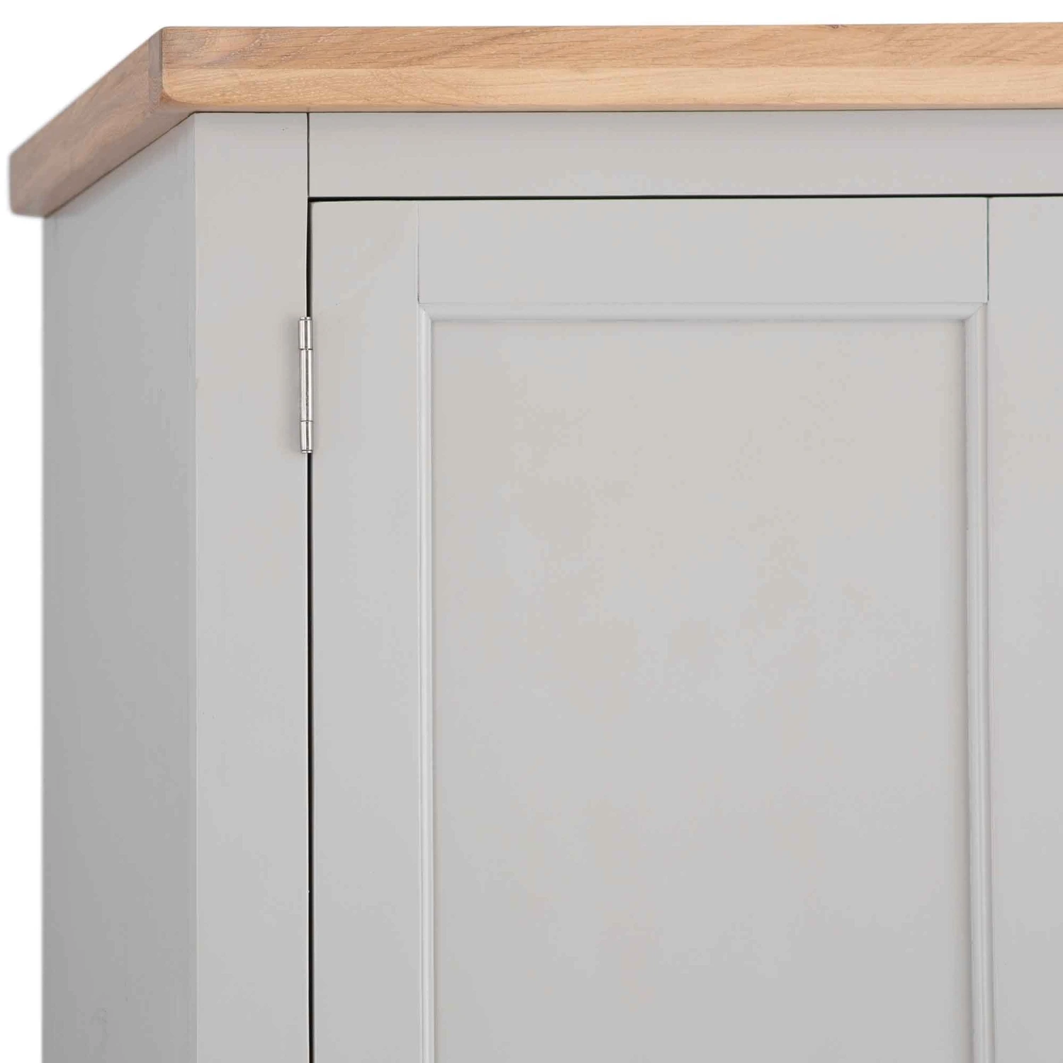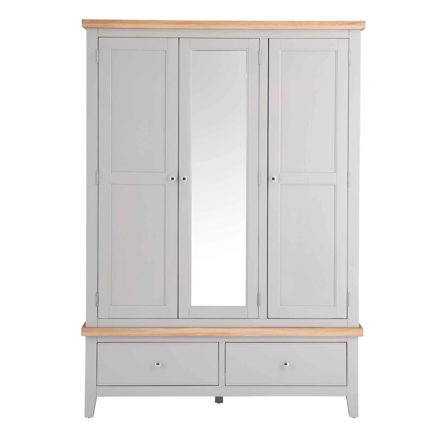 The Eastbury Grey 3 Door Wardrobe seamlessly blends rustic warmth with a contemporary design, the wardrobe is finished with a stunning grey paint and trimmed with washed oak top and detailing as well as the hanging rail inside. For extra storage there is 2 spacious drawers to the bottom and 3 doors for the wardrobe with the middle door featuring a full length mirror. The drawers and 3 doors are compete with small chrome handles that fit seamlessly with the design. Display this beautiful designed wardrobe with matching items from the Eastbury Grey Bedroom Collection.