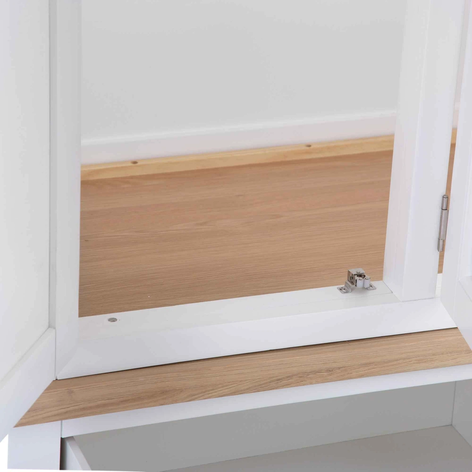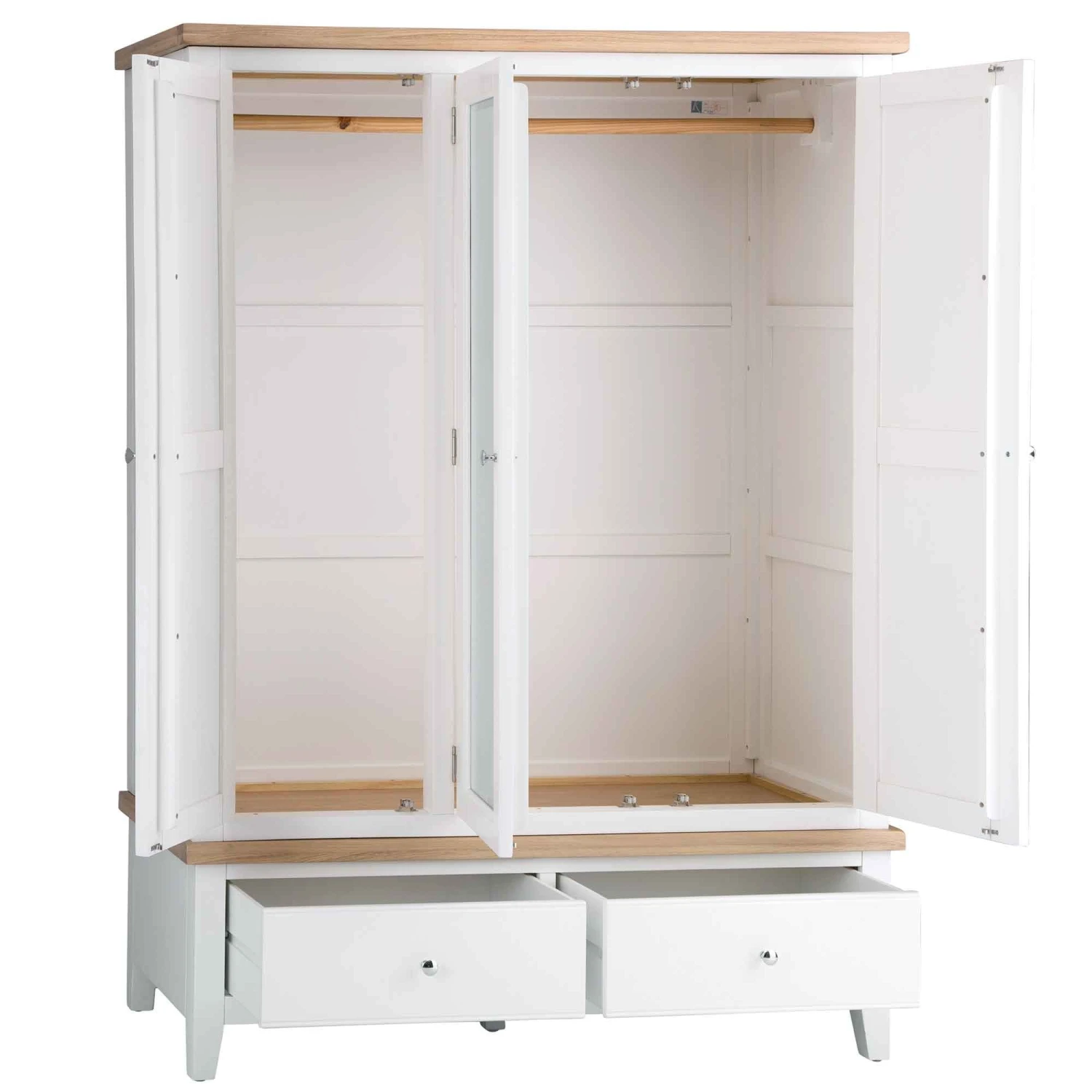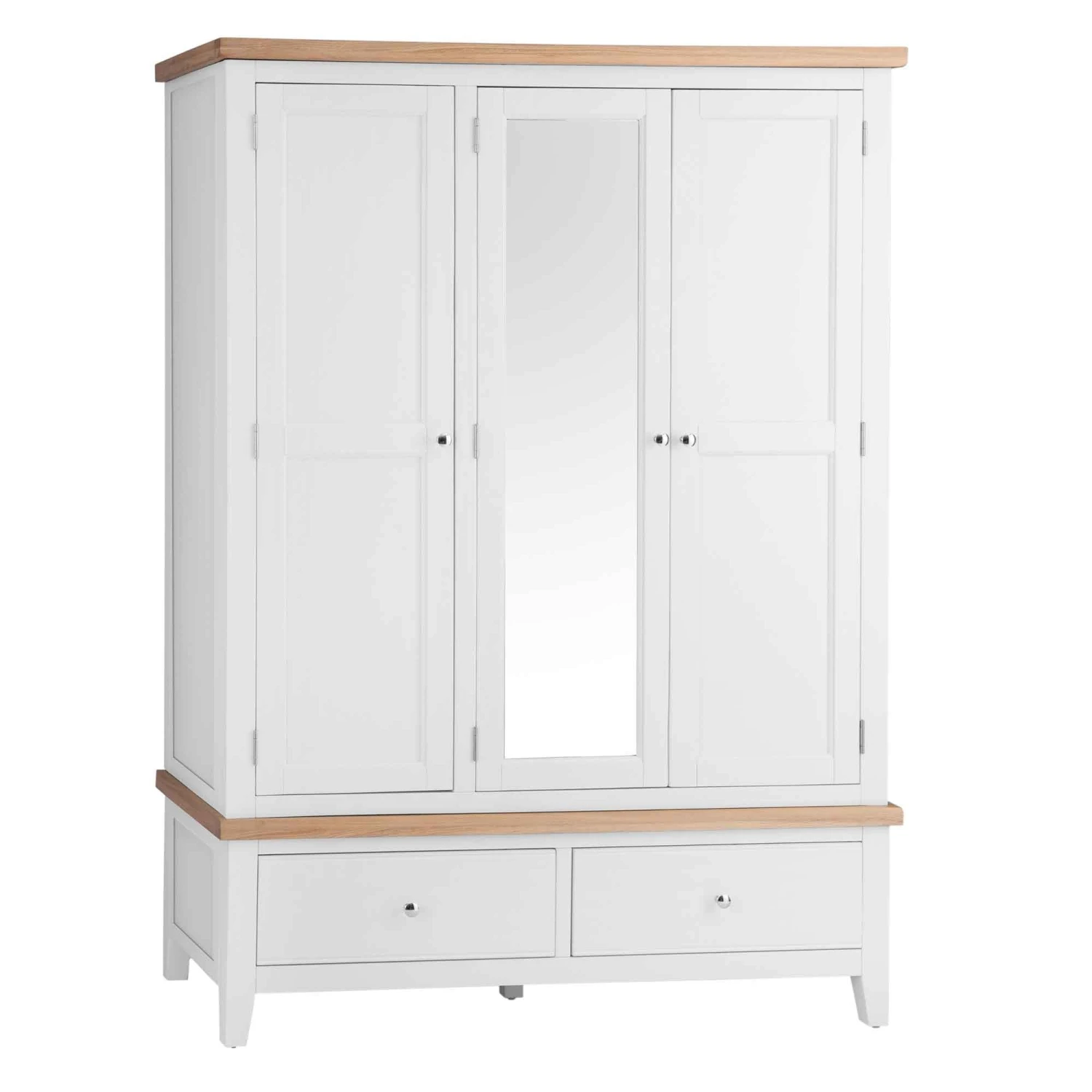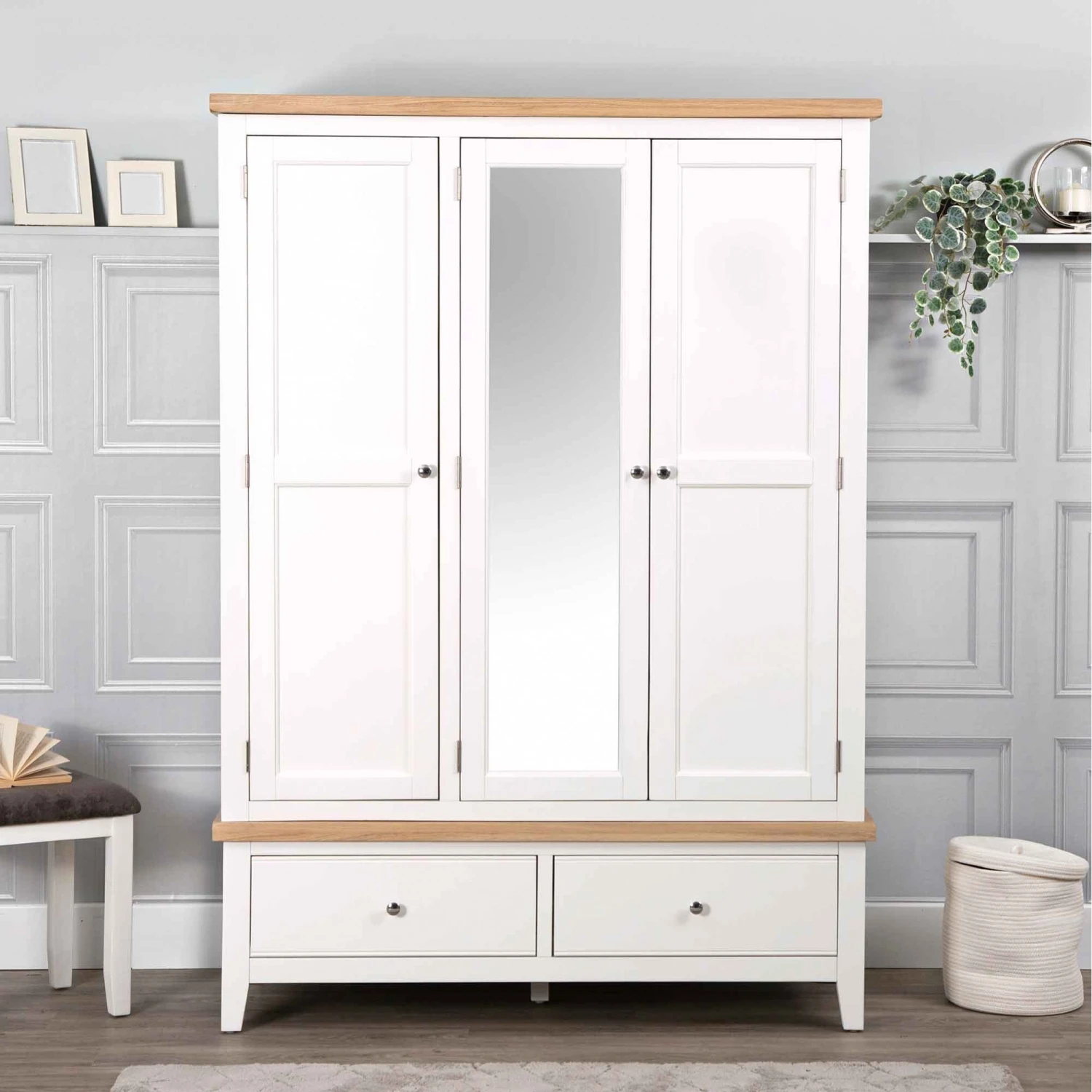 The Eastbury White 3 Door Wardrobe seamlessly blends rustic warmth with a contemporary design, the wardrobe is finished with a stunning bright white paint and trimmed with washed oak top and detailing as well as the hanging rail inside. For extra storage there is 2 spacious drawers to the bottom and 3 doors for the wardrobe with the middle door featuring a full length mirror. The drawers and 3 doors are compete with small chrome handles that fit seamlessly with the design. Display this beautiful designed wardrobe with matching items from the Eastbury White Bedroom Collection.