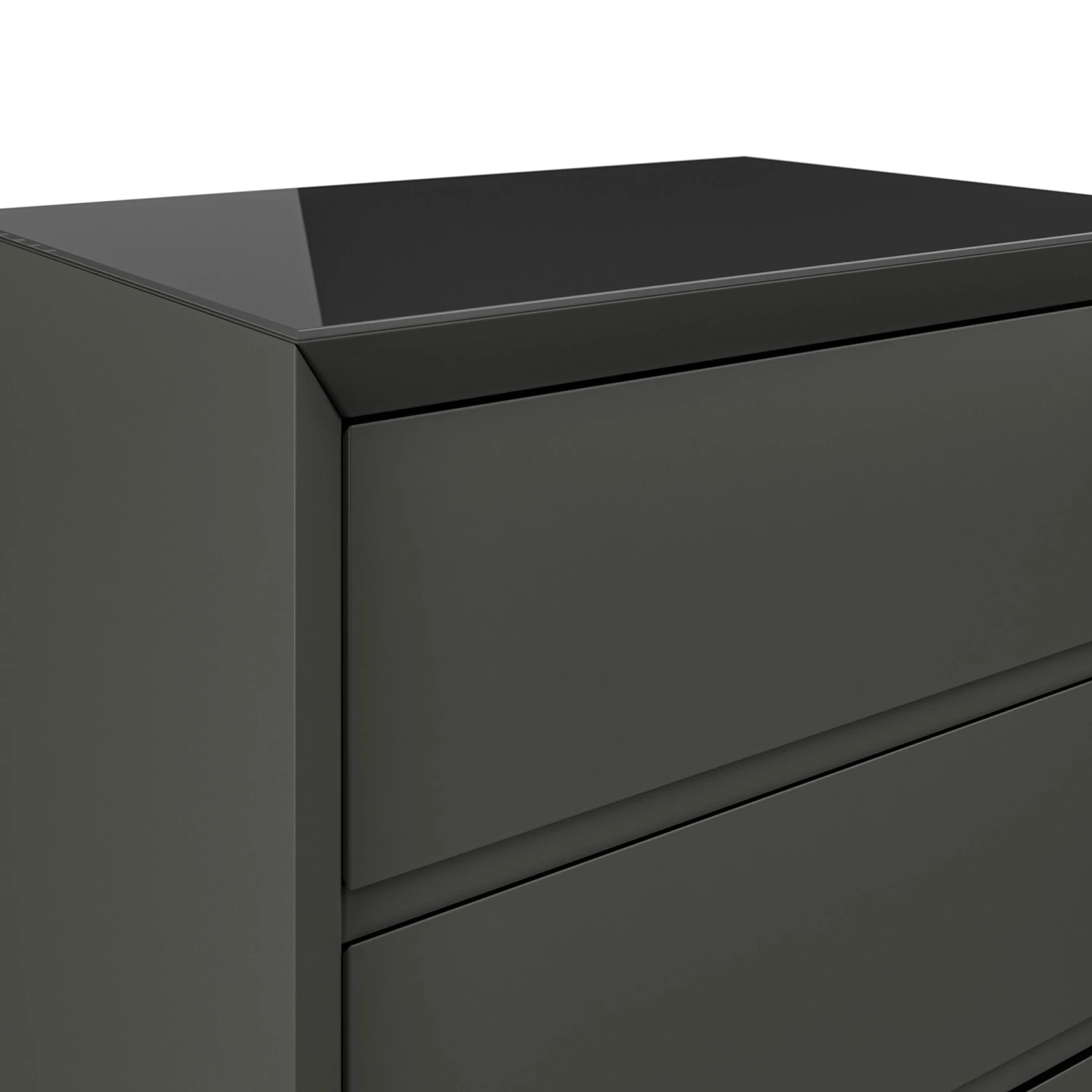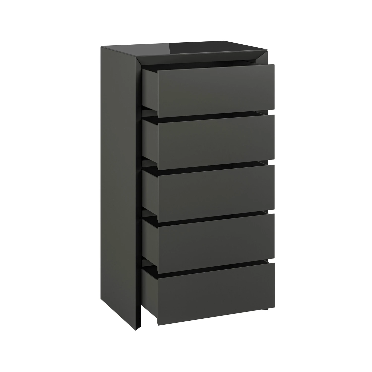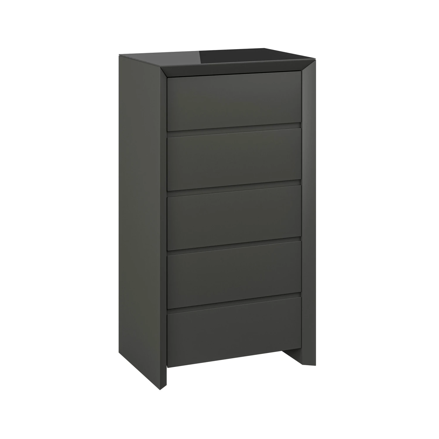 Adding a modern design to your bedroom with this Elstrow Grey Matt Dark Grey 5 Drawer Narrow Chest. The chest of drawers is crafted with high quality wood in a stunning dark grey tone. With 5 spacious drawers you’ll have plenty of storage in your bedroom. Complete your room with the Elstrow Grey Collection and add a uniform look to your home.