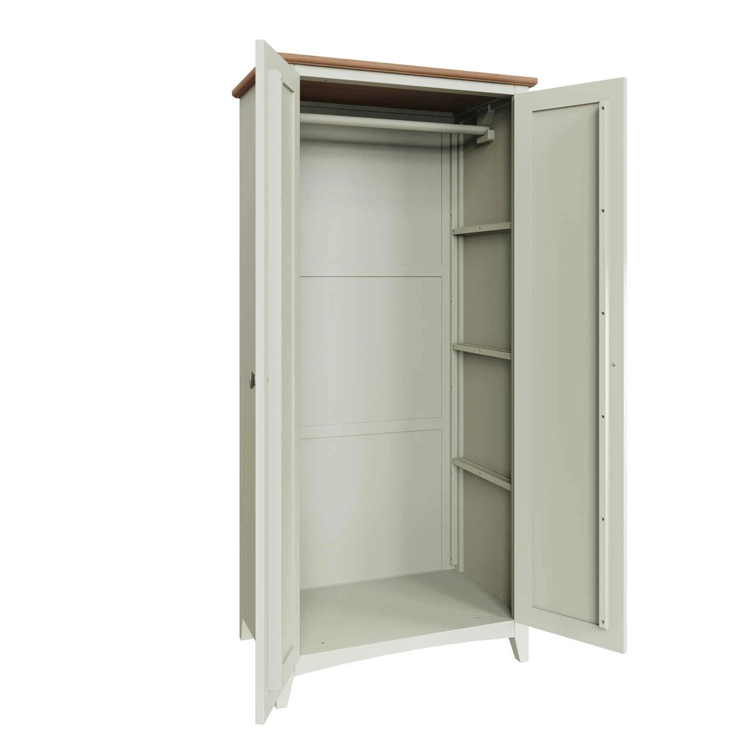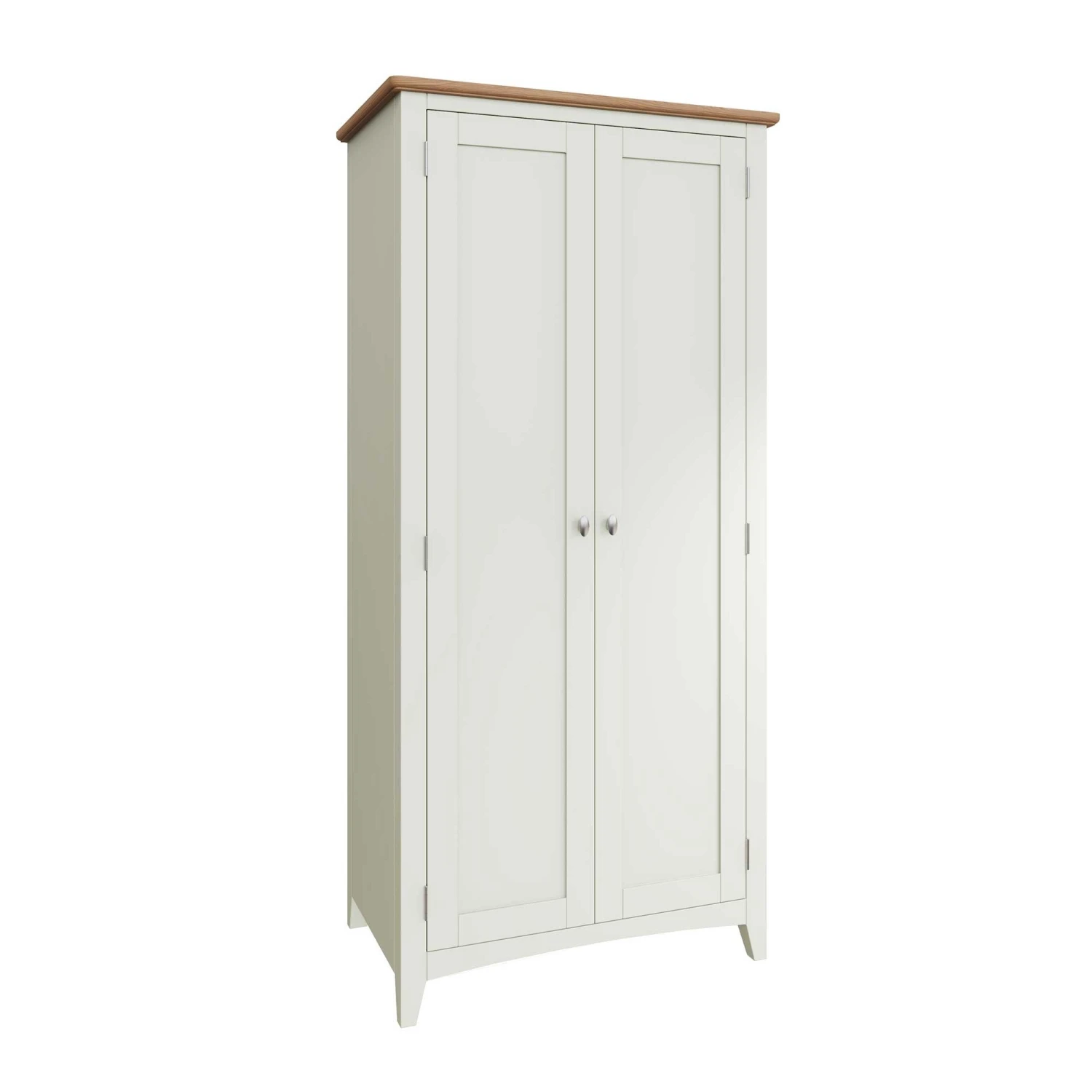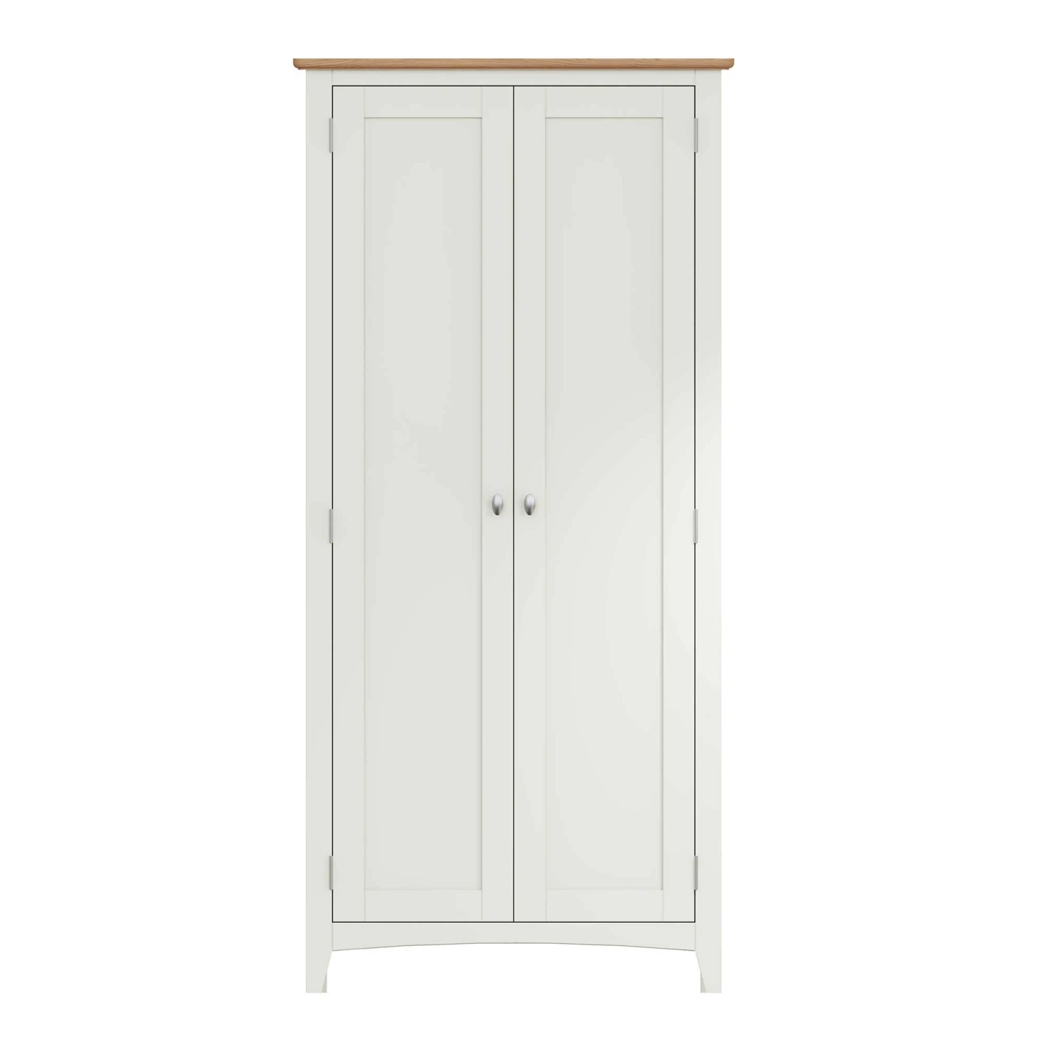 Hang all your long coats and jackets in this Granada White 2 Door Full Hanging Wardrobe! This full hanging wardrobe provides plenty of storage space and a large hanging area for your clothes collection! This 2 door wardrobe has a pure white painted finish and is complete with a light oak top and brushed metal handles. Matching items available.