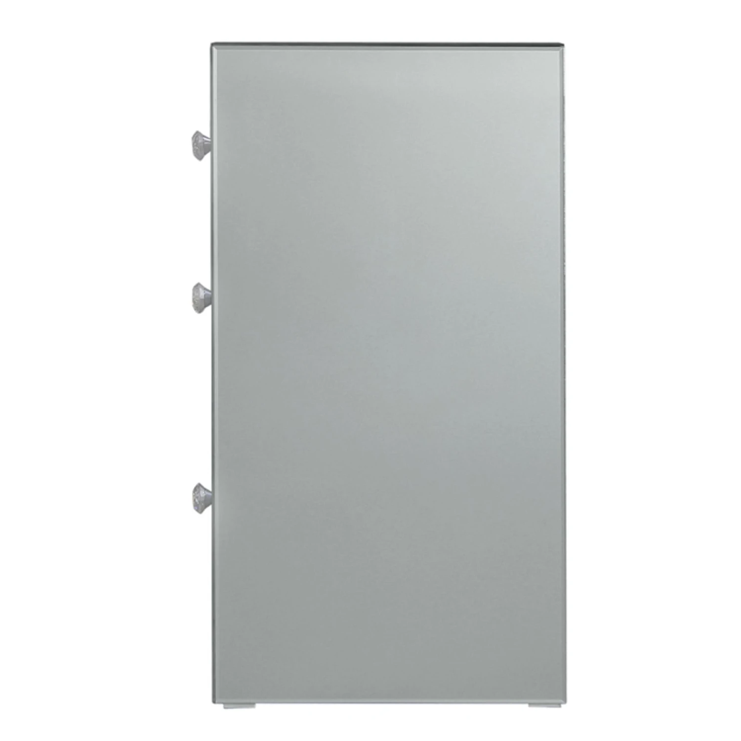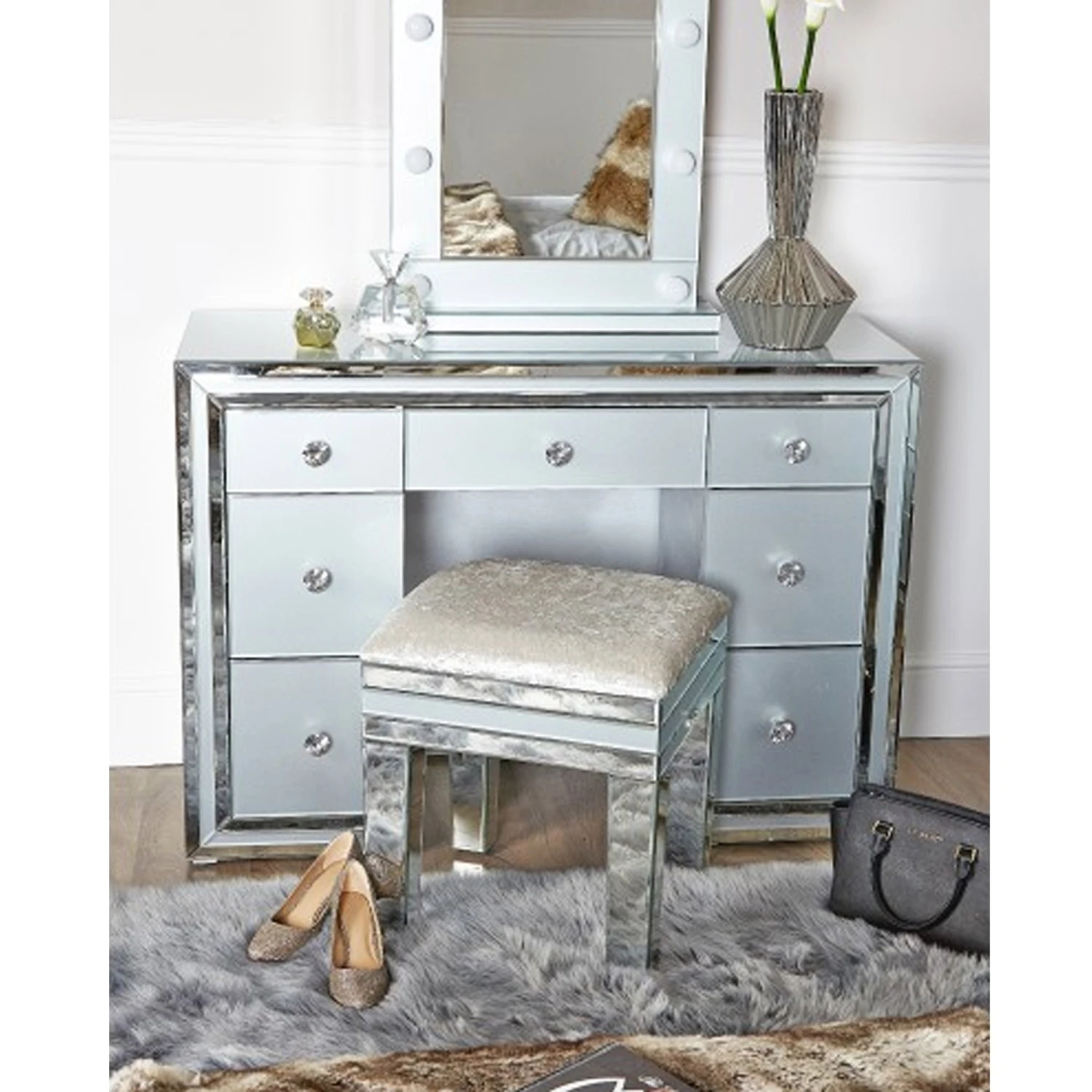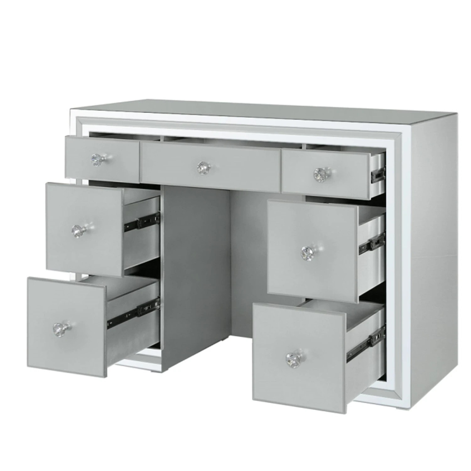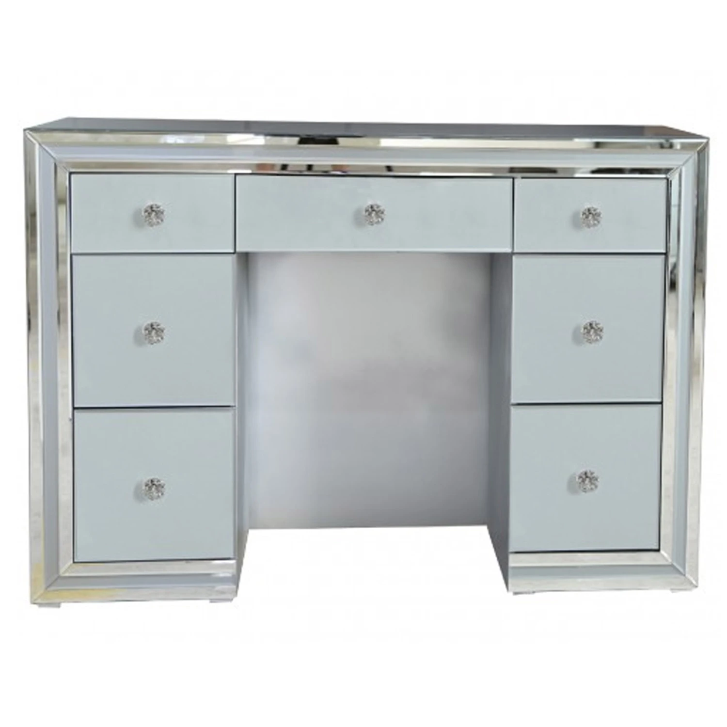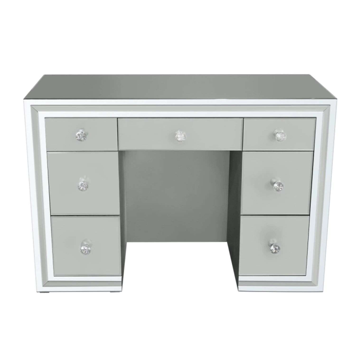 Complete the contemporary look in your home by presenting the incredible Grey Manhattan Mirror Dressing Table. This piece features a combination of grey and clear panels that look very modern and stylish. This piece also has 7 drawers that include crystal handles to enhance the charming design.
