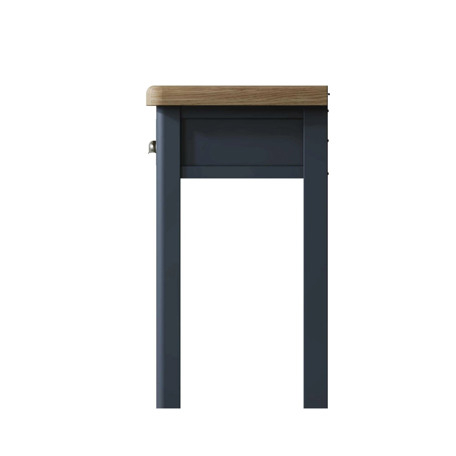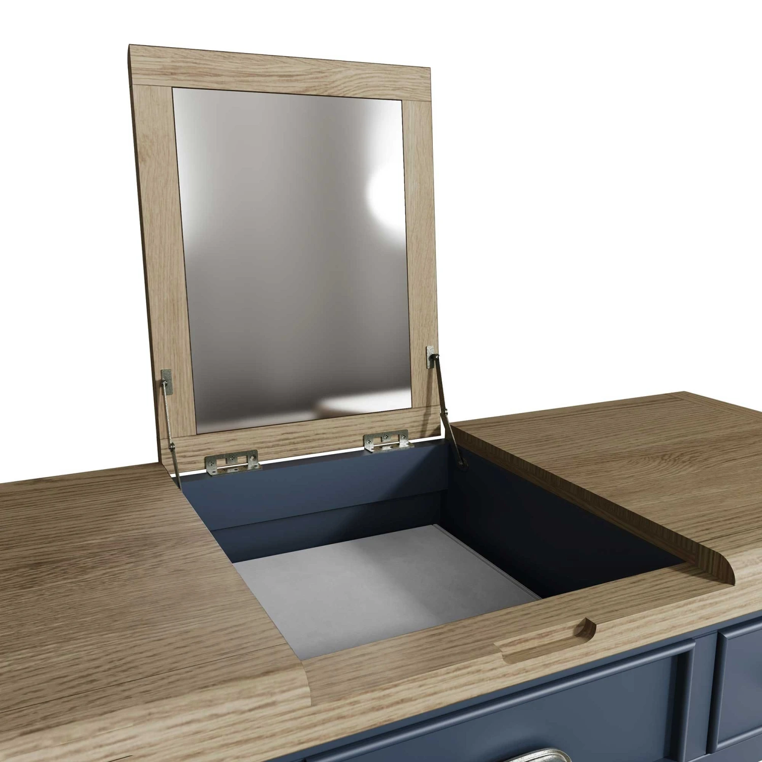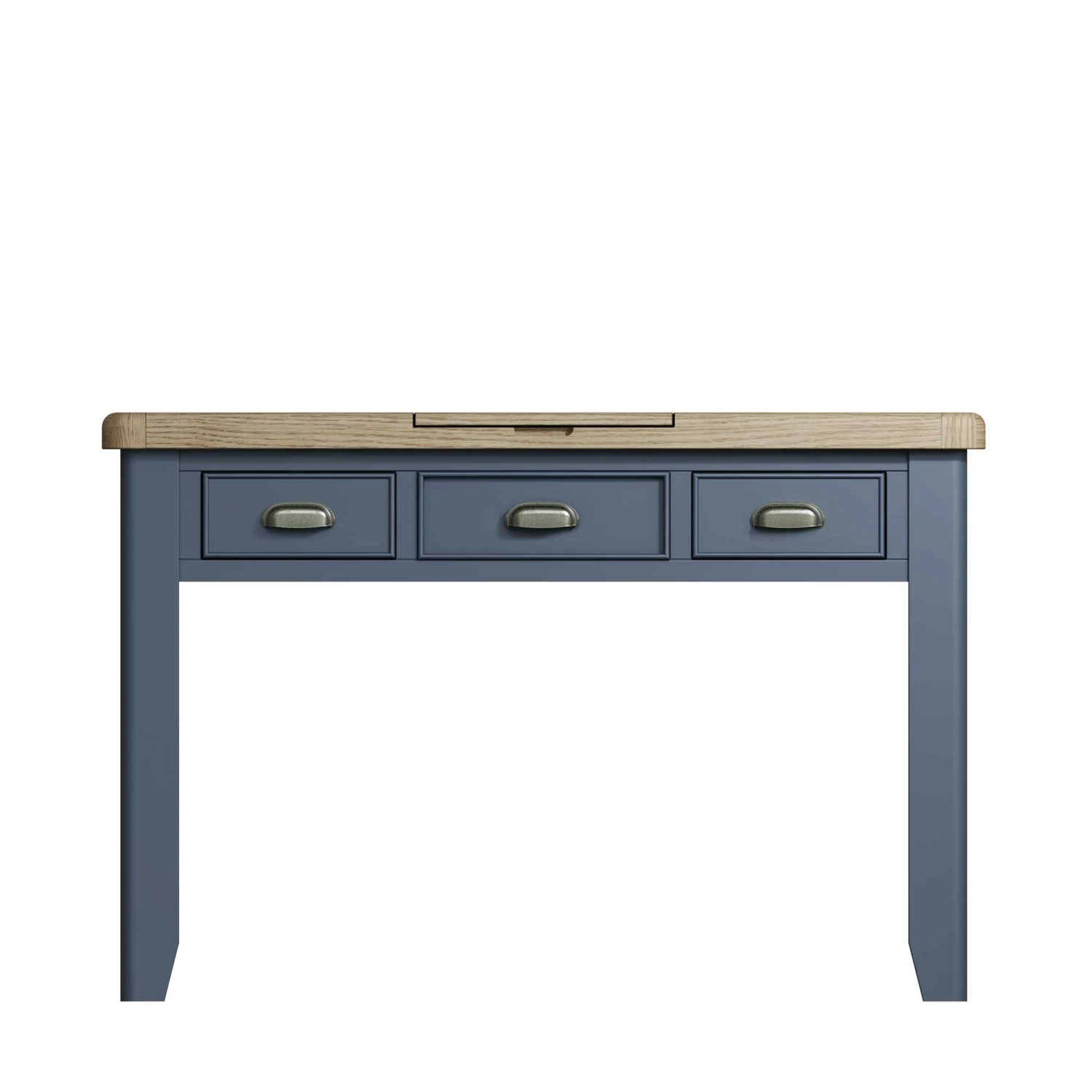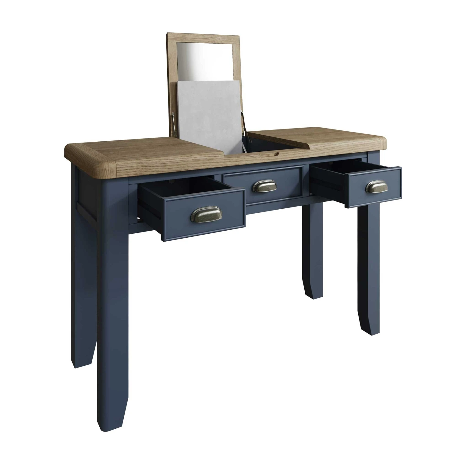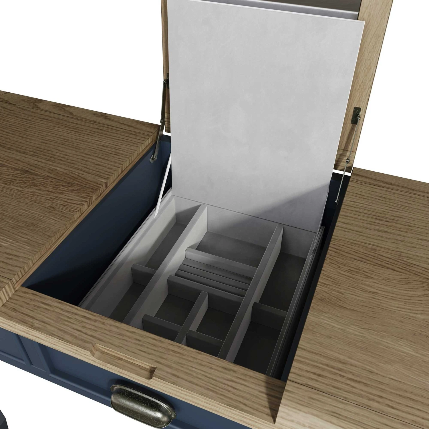 This Hopton Blue Dressing Table will look stunning in any modern home interior! This dressing table features a sumptuous and elegant traditional design and even hides a handy mirror and secret compartment in the thick oak table top! Complete with 3 drawers, this dressing table will provide storage for convenient items and make-up! Matching items available.