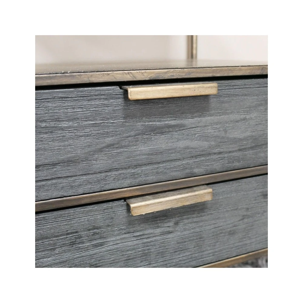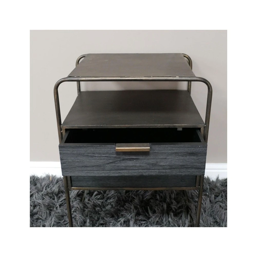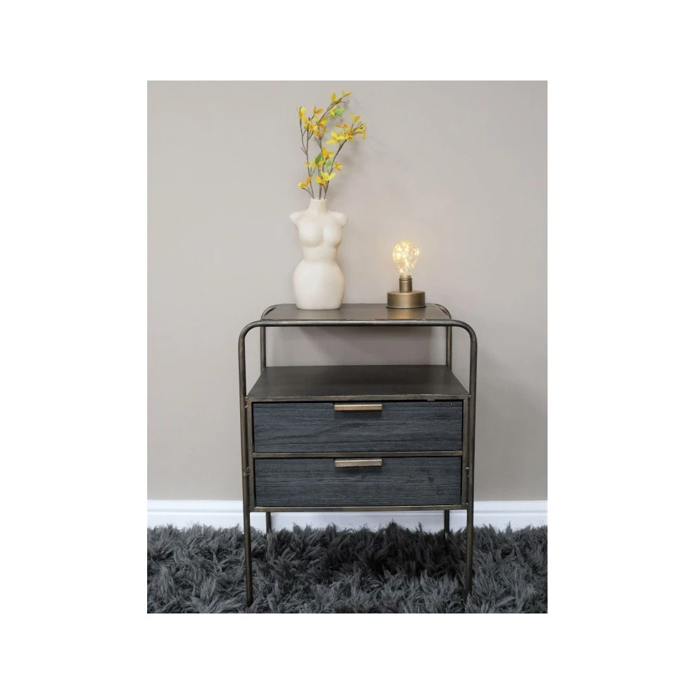 The Industrial Bronze Metal Bedside Cabinet are crafted with a metal frame finished with a bronze tone. The bedside cabinet features 2 drawers with grey wooden fronts, a shelf above and a curved table top design. This rustic design will add an industrial feel to your bedroom whilst adding a little extra storage space. Â