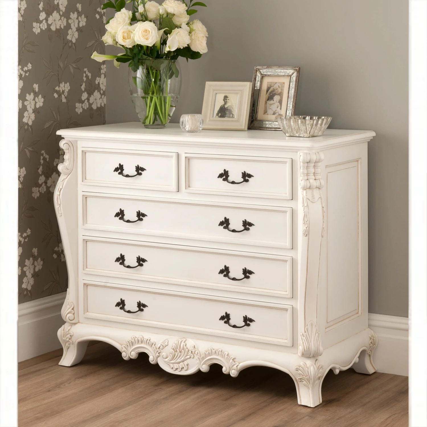 Featured here we have the marvelous La Rochelle Antique French style chest of drawers, beautifully hand carved from mahogany and completed in a stunning antique white finish. As one of our most popular ranges the La Rochelle collection,Β from our French furniture and shabby chic furniture range ensures elegance and the utmost quality, and as seen here this Antique French Chest displays smooth curves with intricate ornate design allowing you to achieve that perfect French boudoir feel. Whether this shabby chic furniture chest is by itself or as part of our stunning shabby chic furniture, we guarantee you’re going to be pleased with this stunning French style chest of drawers.