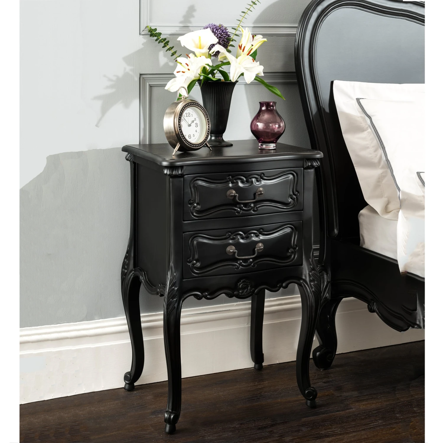 Featured here we have the La Rochelle Antique French Bedside, every aspect hand carved from long lasting high quality mahogany, and completed in a stunning antique black finish. As one of our most popular ranges the La Rochelle collection ensures elegance and the utmost quality, and as seen here this Bedside displays smooth curves with intricate ornate design allowing you to achieve that perfect Shabby Chic feel. Whether this bedside is by itself or as part of the full breath taking La Rochelle bedroom set, we guarantee you’re going to be pleased.