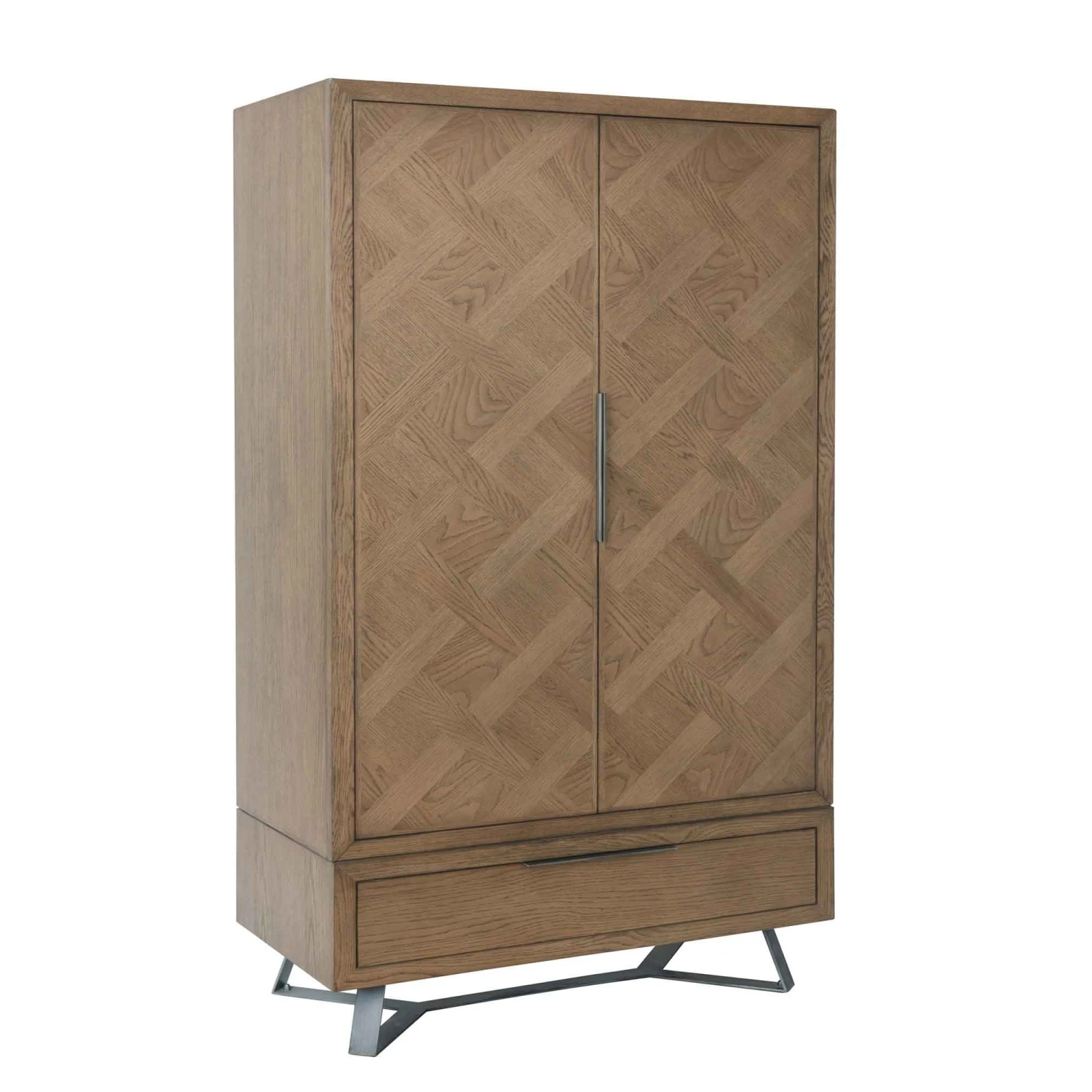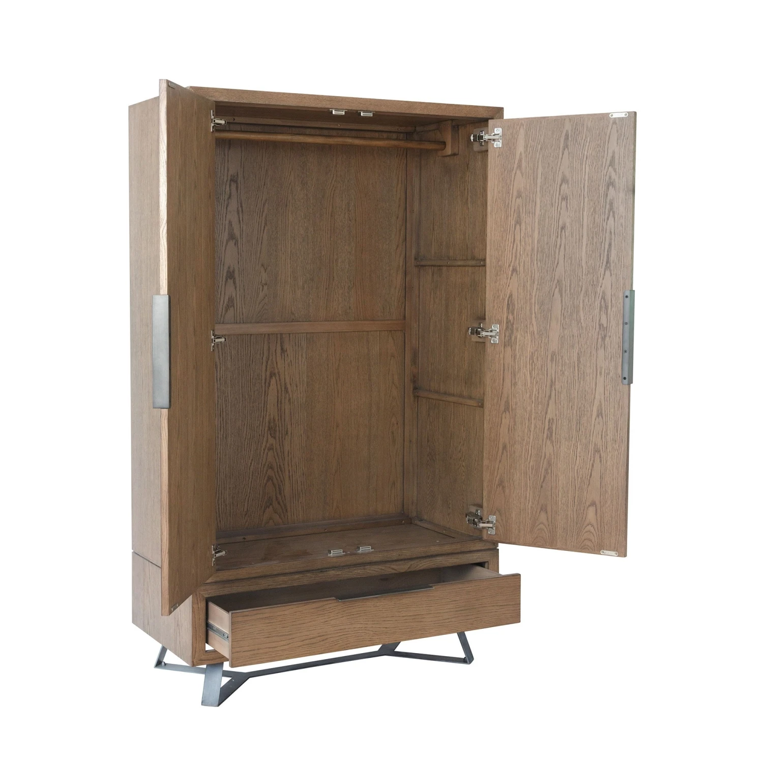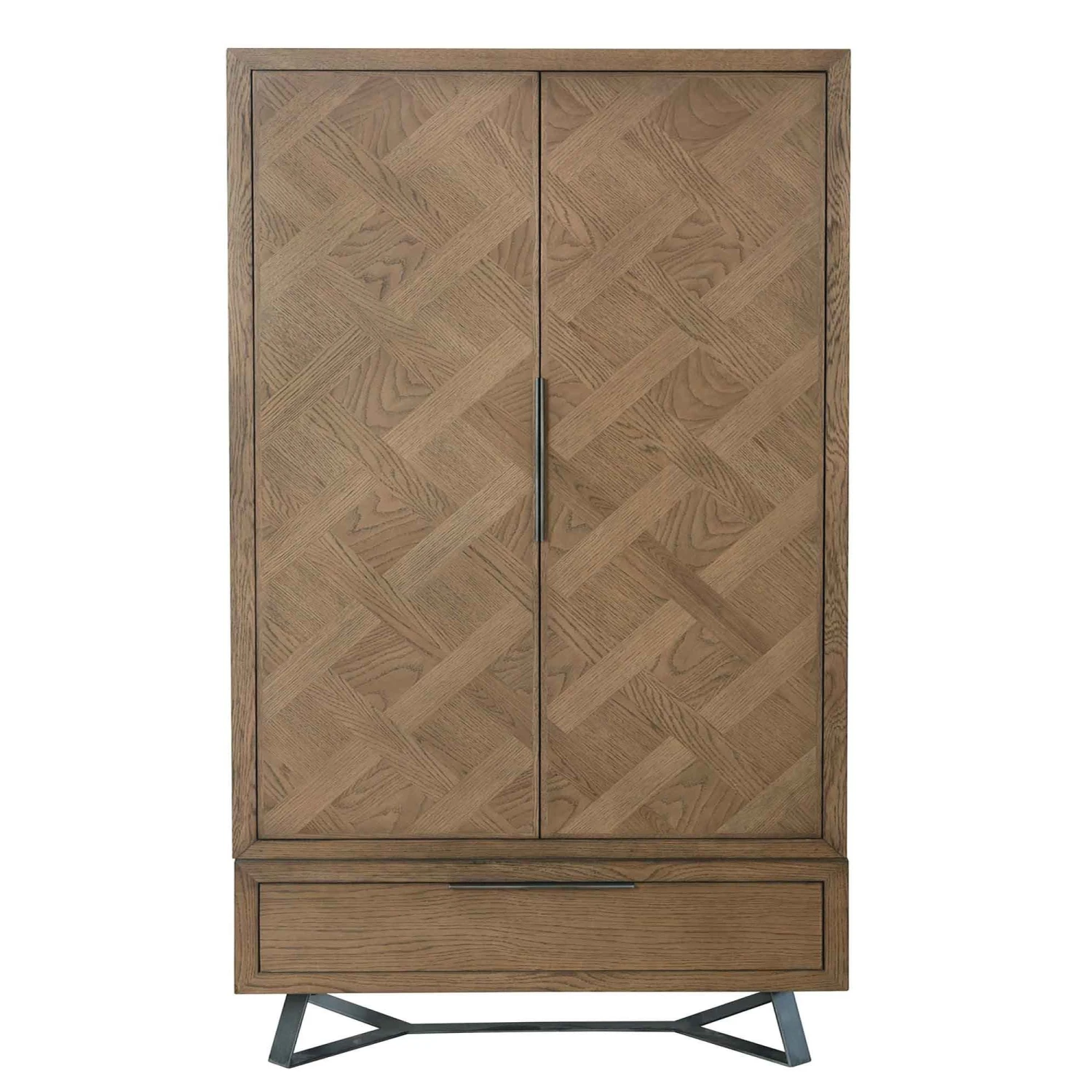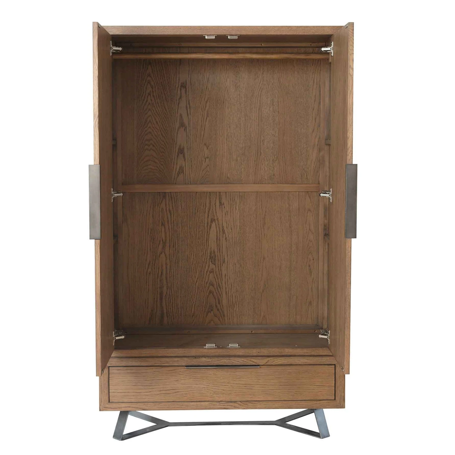 Add to your bedroom furniture with this Lenox 2 Door Wardrobe. Providing plenty of storage space for all your clothes and garments, it comes in a natural finish, manufactured from solid oak wood. With 2 doors that offer plenty of hanging space, it also features a 1 drawer design at the bottom. Positioned on top of grey metal angled legs, it adds a contemporary look to this modern wardrobe, providing a high-quality finish that features a parquet inlay on the wardrobe front. Complete the set with matching items available from our Lenox Bedroom Range.