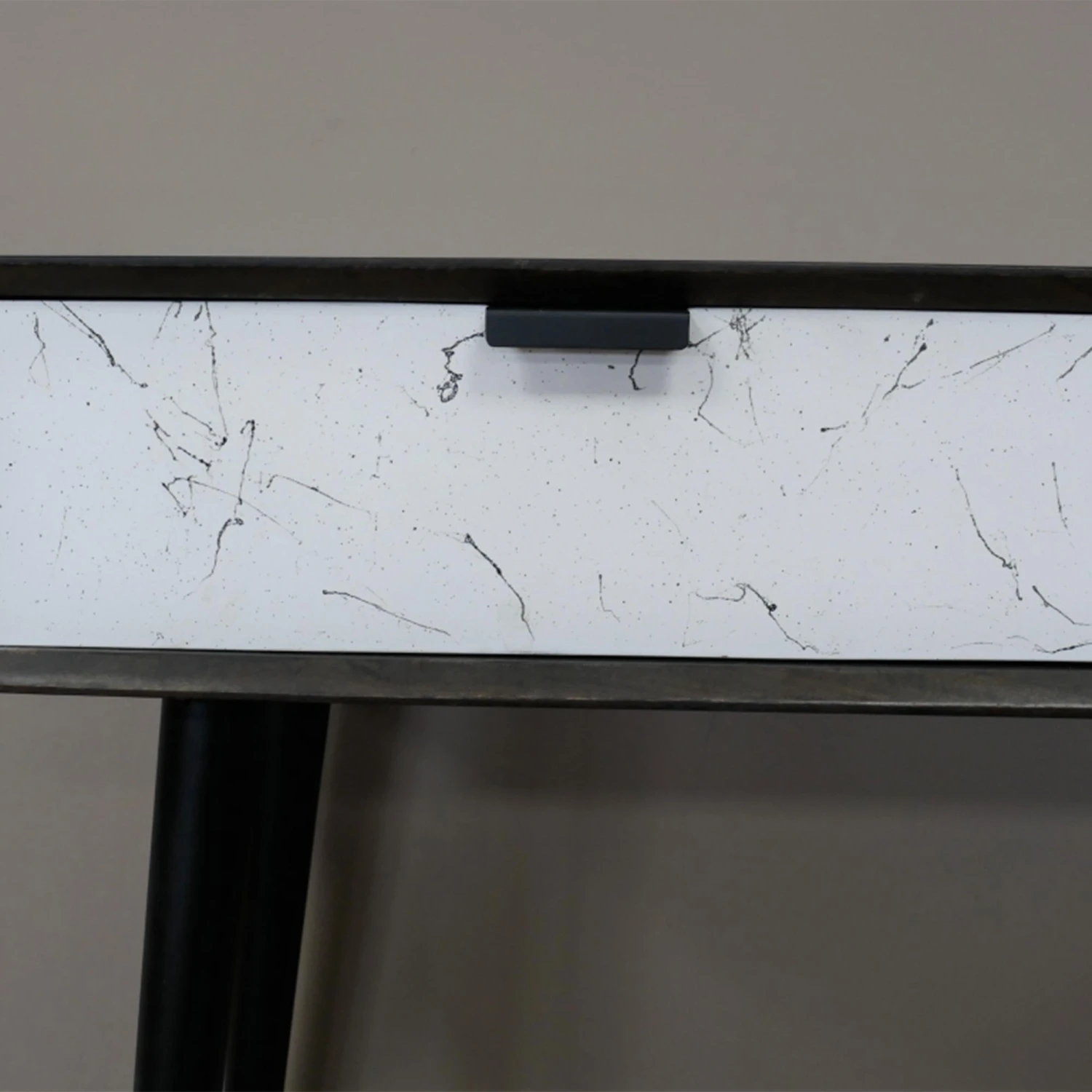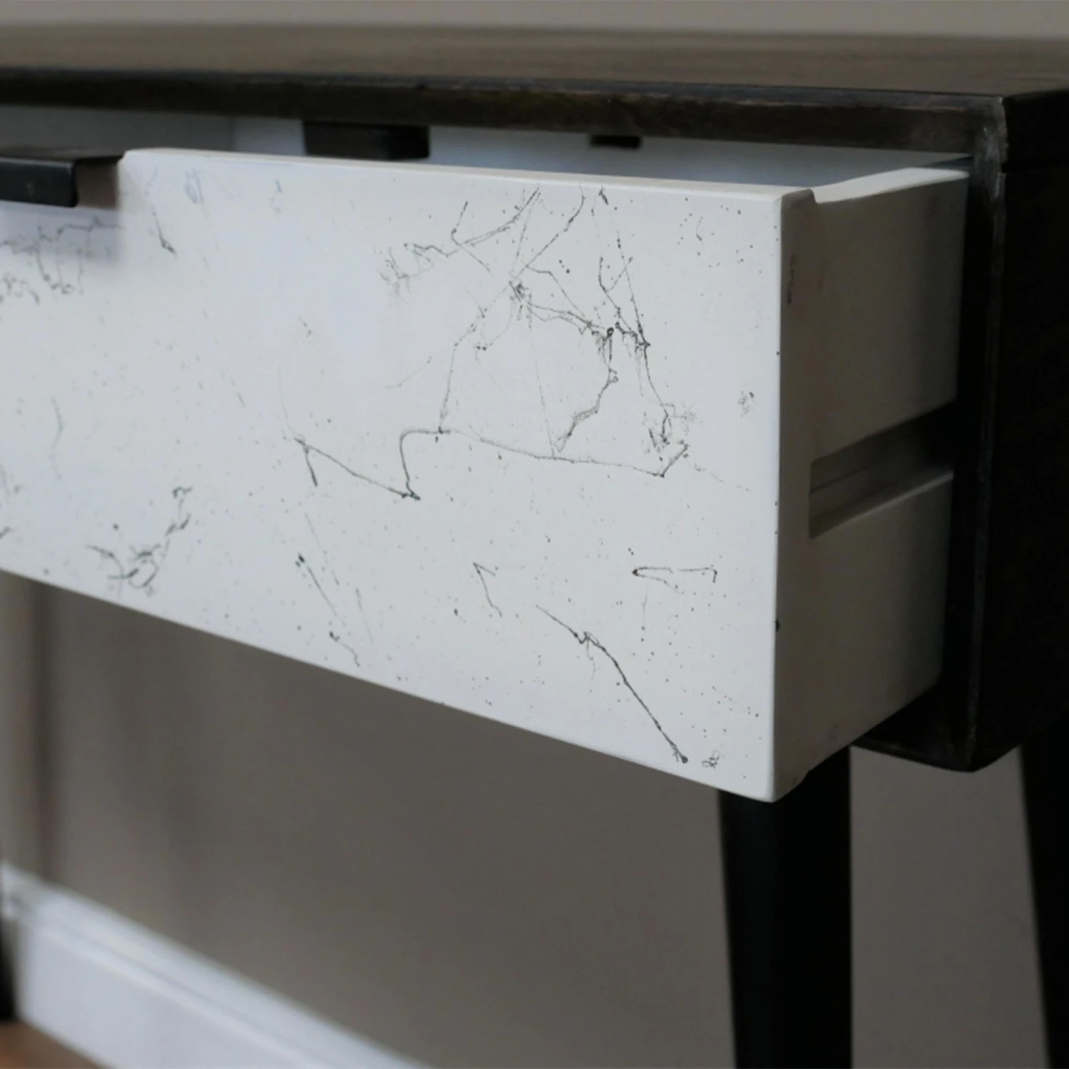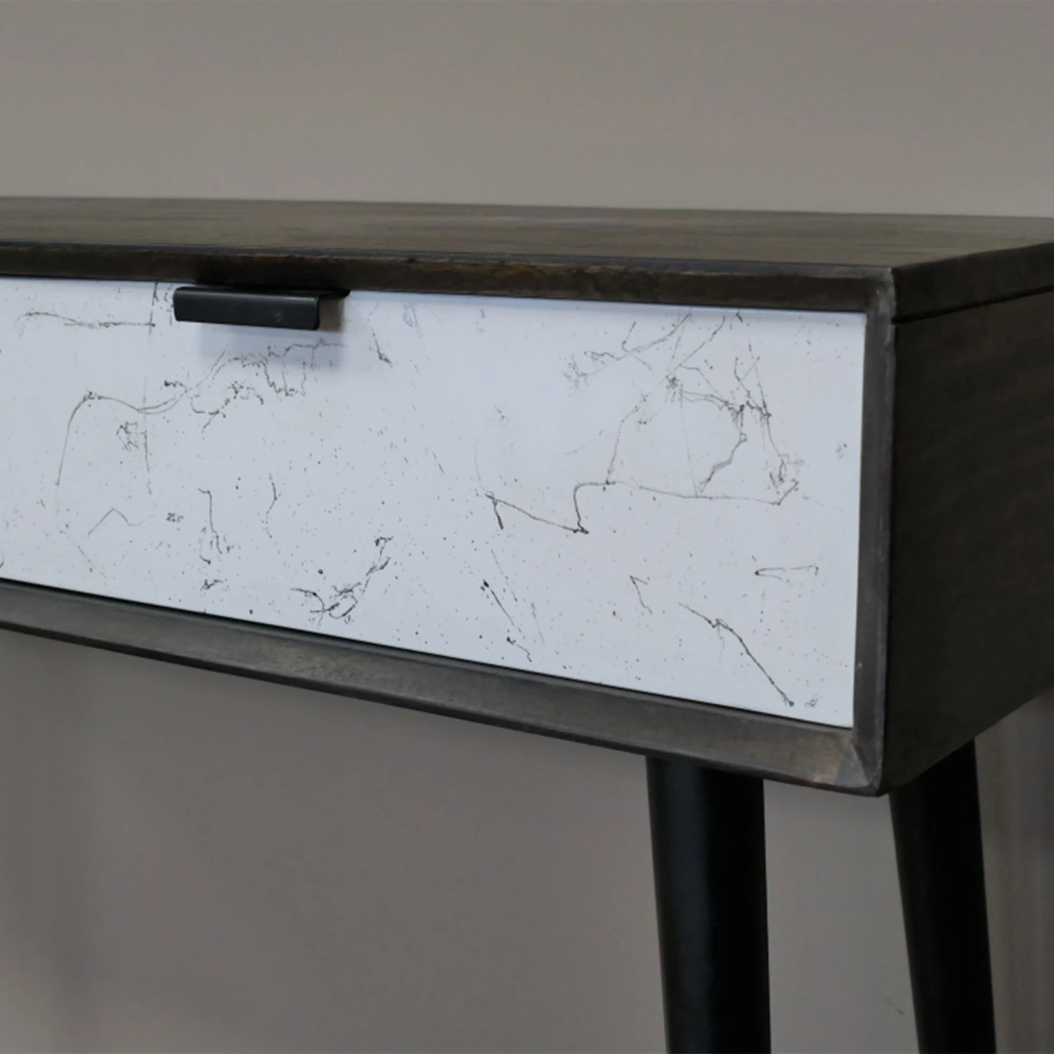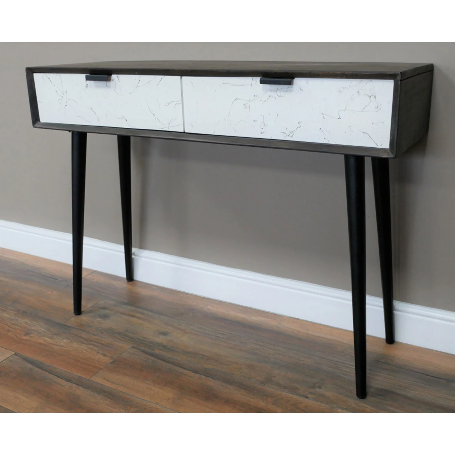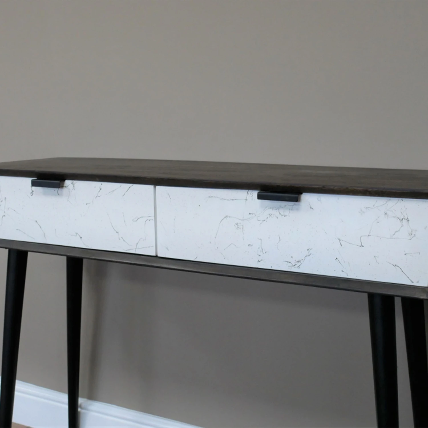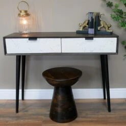 A perfect addition to your office space as a desk or in your bedroom used as a dressing table, the Mango Wood & Iron Marble Effect Venice Desk or Dressing Table is practical yet stylish. The desk/dressing table features a dark brown mango wood frame with 2 white iron marble effect drawers for storage. The desk/dressing table sits on tapered black metal legs and complete with 2 subtle black metal handles. Style with a matching chair or stool to suit your style.