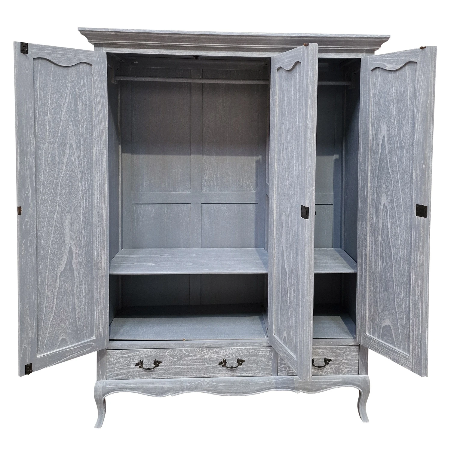 Give your clothing collection a new home with this Montpellier Blanc Grey 3 Door Wardrobe! Ideal for bedrooms looking for a large storage space, this 3 door wardrobe is the perfect answer! Complete with 3 doors, 2 drawers, a hanging rail and shelving space, this large wardrobe will not disappoint! Made from solid Mindi wood with a grey finish.