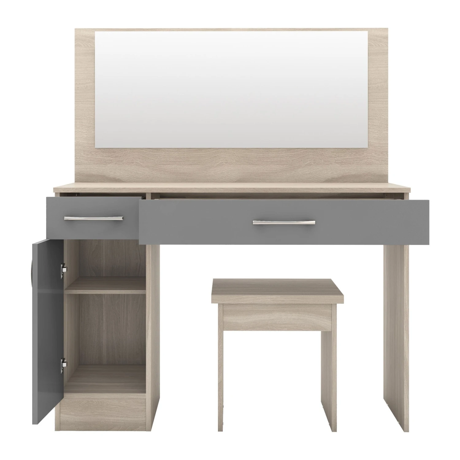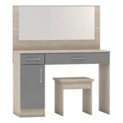 Make your bedroom the place to get ready when you organise all your makeup, hair care and styling products inside or on top of this modern Nevada Grey Gloss & Light Oak Veneer Vanity/Dressing Table Set. Beautifully crafted from wooden materials with a glass mirror included, it comes with 2 drawers and 1 door of storage. The perfect bedroom furniture that will make getting ready in the morning that bit better.