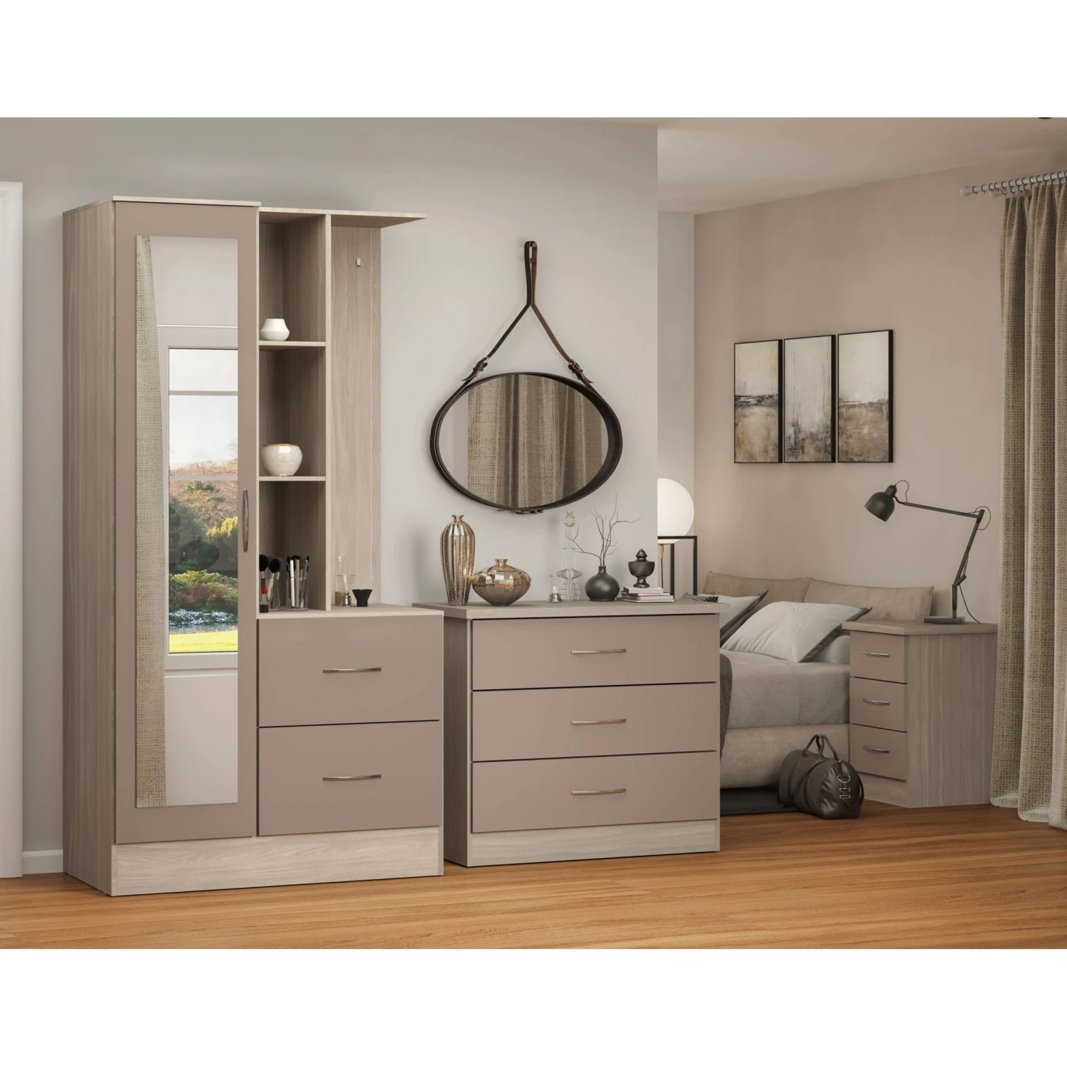 The Nevada Oyster Gloss/Light Oak Effect Veneer Mirrored Open Shelf Wardrobe provides your bedroom with a variety of storage solutions ranging from 1 door with hanging rail, 2 drawers and 2 shelves. Perfect for storing your perfumes, hair care and makeup, it also holds your clothing items, making it a versatile wardrobe that is contemporary in design with a beautiful oyster gloss and light oak veneer finish. Complete with a mirrored front, it makes getting ready in the morning easier, selecting an item from inside and checking it out in the mirror provided.