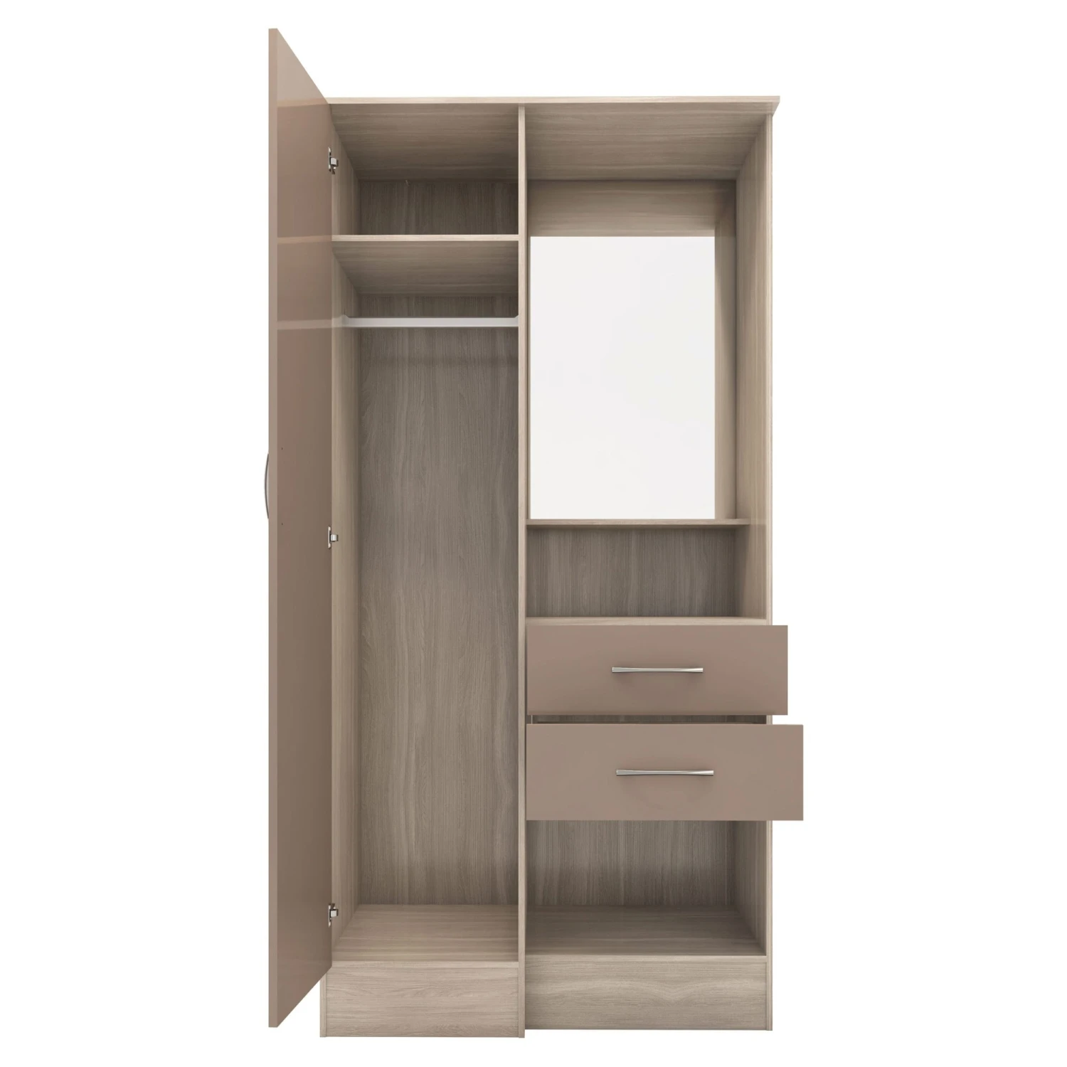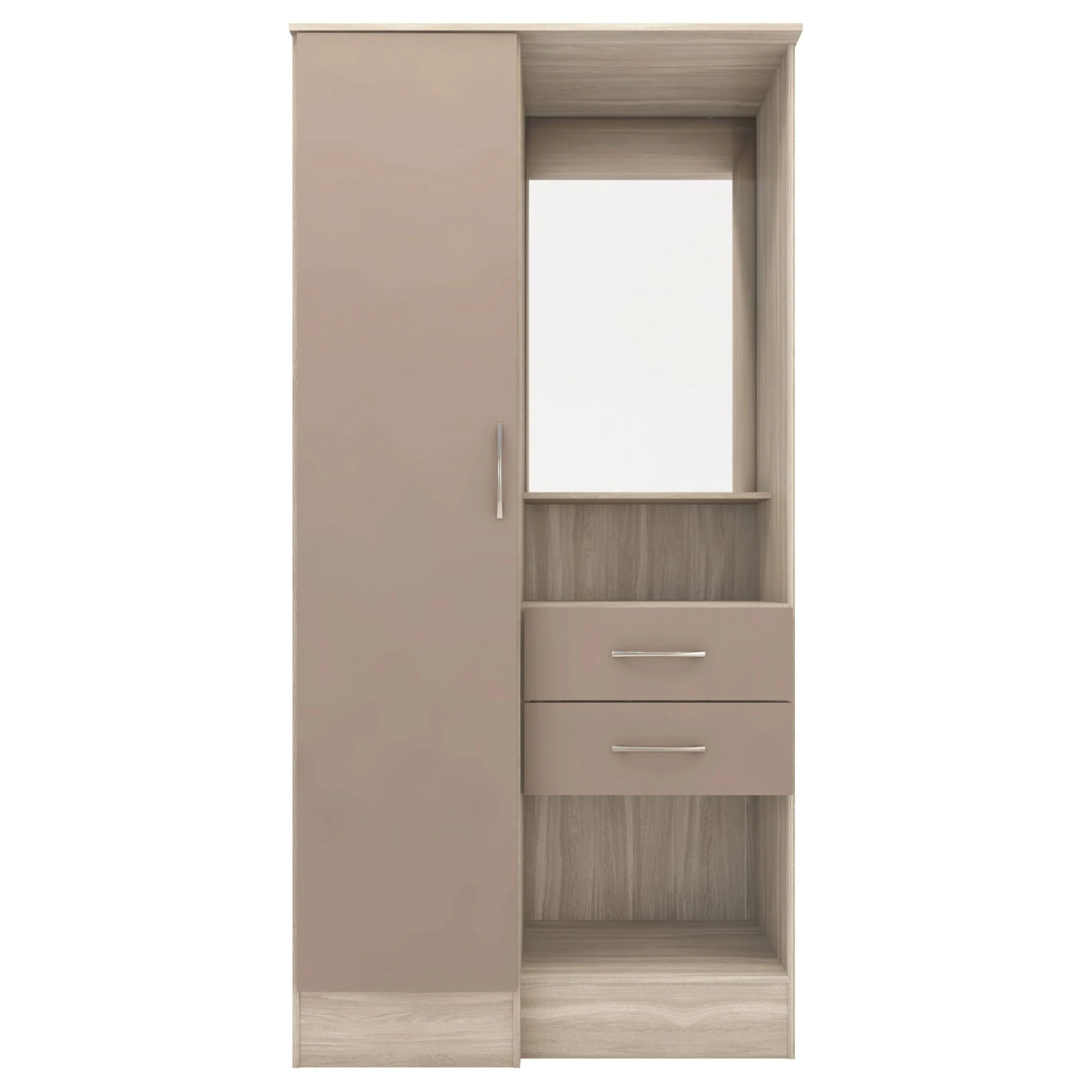 Manufactured with high quality materials, the Nevada Oyster Gloss/Light Oak Effect Veneer Vanity 1 Door Wardrobe makes for a contemporary bedroom furniture piece that offers storage solutions alongside style and practicality.
