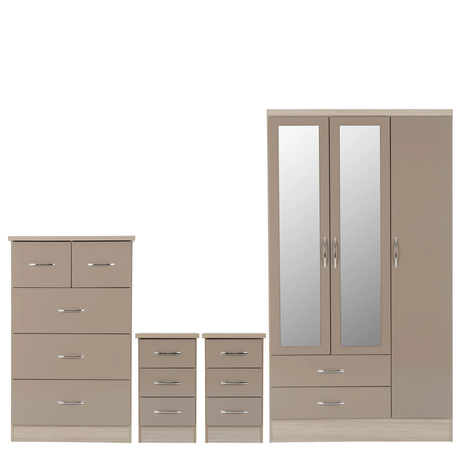 A great set-up for a modern styled home, this Nevada Oyster & Light Oak 3 Door 2 Drawer Mirrored Wardrobe Bedroom Set is a complete set of furniture consisting of a wardrobe, chest of drawers and bedside tables. With a mirror panelling design on the wardrobe, it makes getting ready in the morning that bit easier and comes in an oyster gloss and light oak finish for a sleek, elegant look. As a complete set, it will keep your furniture matching and has been manufactured with the highest quality of materials to ensure a long-lasting build. Offering a vast amount of storage space, even the savviest of fashionistas will have trouble running out!