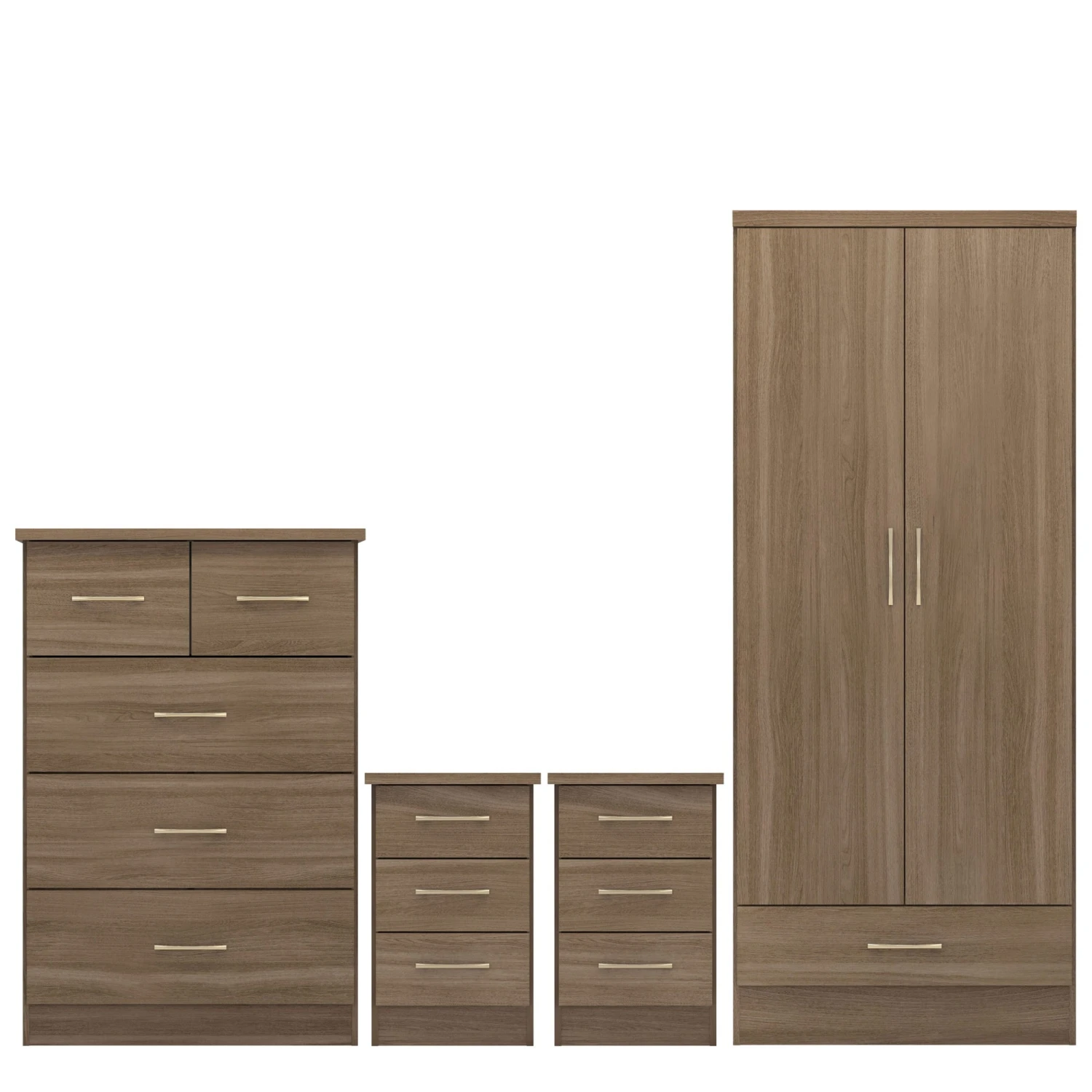 Make your bedroom match with this Nevada Rustic Oak 2 Door 1 Drawer Wardrobe Bedroom Set. Complete with a large wardrobe, chest of drawers and 2 bedside tables, it will complete your full room in an instant. With a contemporary design, it has a rustic oak effect finish adding character and will compliment a wide range of modern interiors, ensuring a practical and functional furniture set. Effortlessly stylish, it’s an easy way to ensure plenty of storage space for your clothing items and bedroom essentials, making sure your room is kept neat and tidy from clutter.