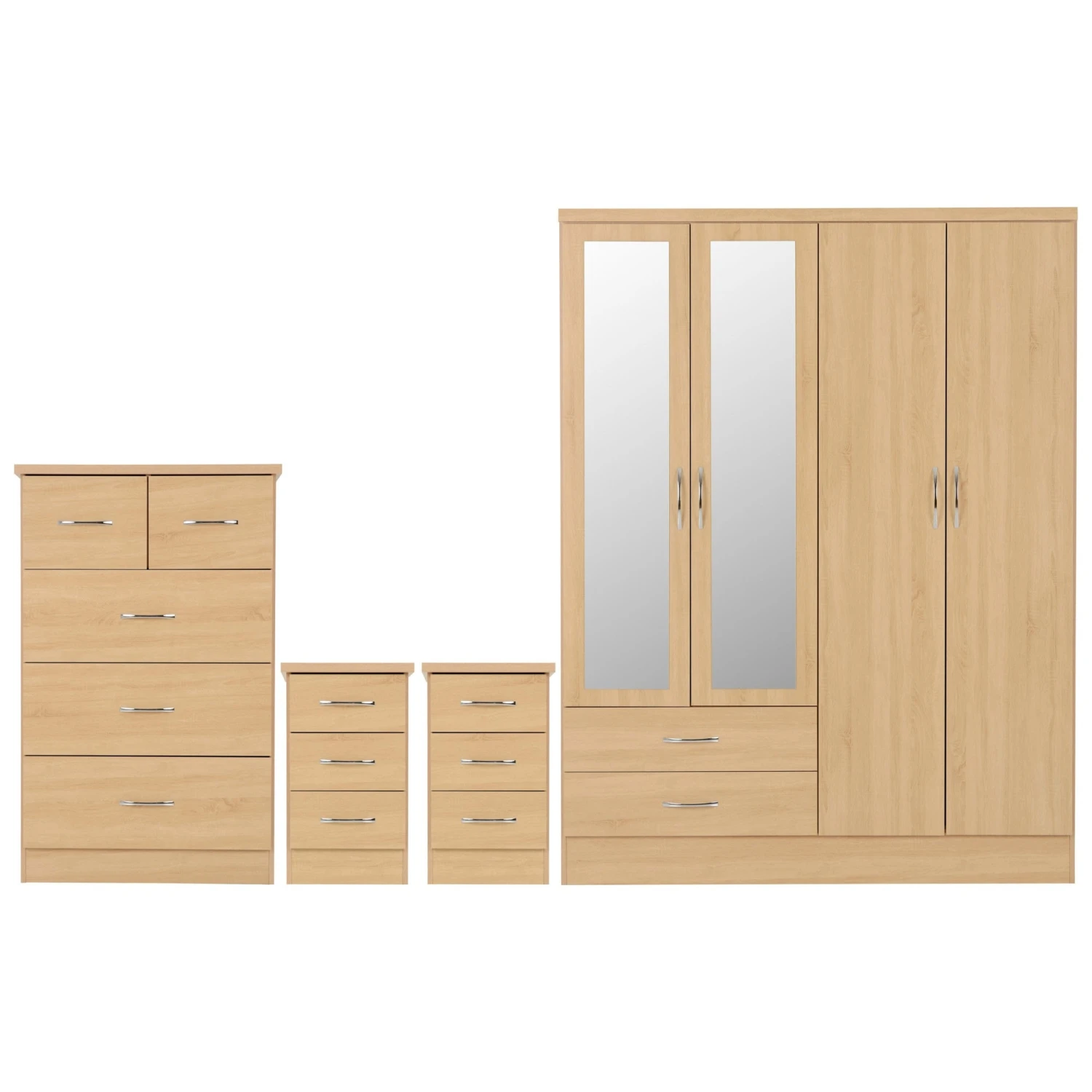 Get the full package when decorating your bedroom at home with this Nevada Sonoma Oak 4 Door 2 Drawer Mirrored Wardrobe Bedroom Set. Designed with a contemporary design in a beautiful Sonoma Oak Finish, it’s easily blendable to any interior decor, giving you plenty of choice on how to decorate. A 3-piece bedroom set that comes with a chest of drawers, 2 bedside tables and a mirrored wardrobe with 4 doors and 2 drawers, it provides generous storage, so you never run out! Purchase this matching set all in one go, making it fuss-free and easy.