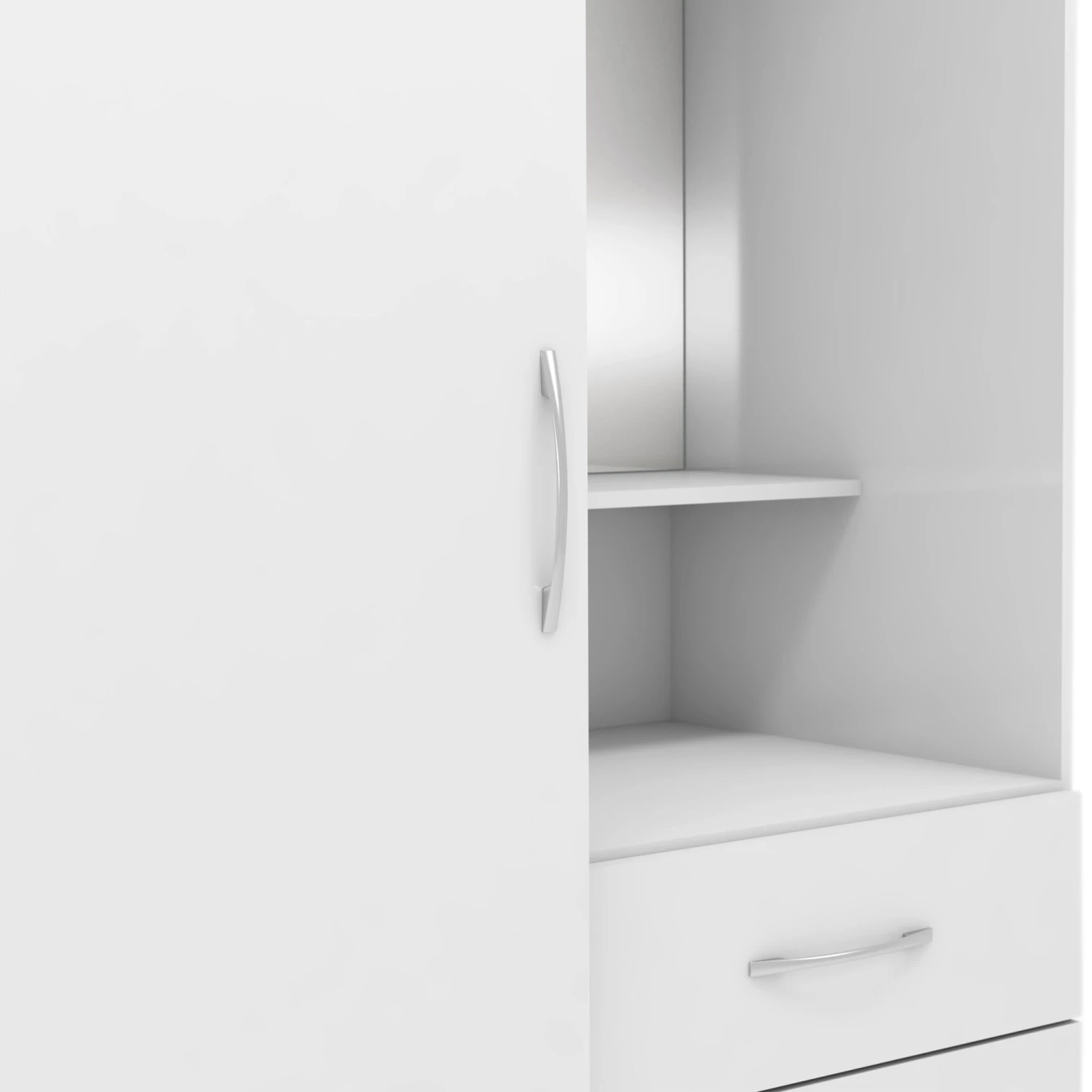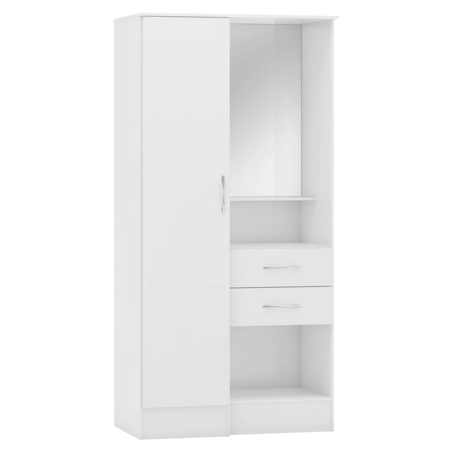 Uniquely crafted with a 2 in 1 design, this Nevada White Gloss Vanity 1 Door Wardrobe cleverly allows you to use its 1 door wardrobe for hanging clothing items whilst the other side is used as a vanity unit. Complete with a hanging rail and internal shelf, it also has 3 shelf spaces and 2 drawers, with a mirror included for getting ready in front of. Coming in a white gloss finish, manufactured from high quality wooden materials, it’s sturdily built for a long-lasting finish and makes a versatile and practical addition, boosting storage space and adding to your bedroom furniture.Â