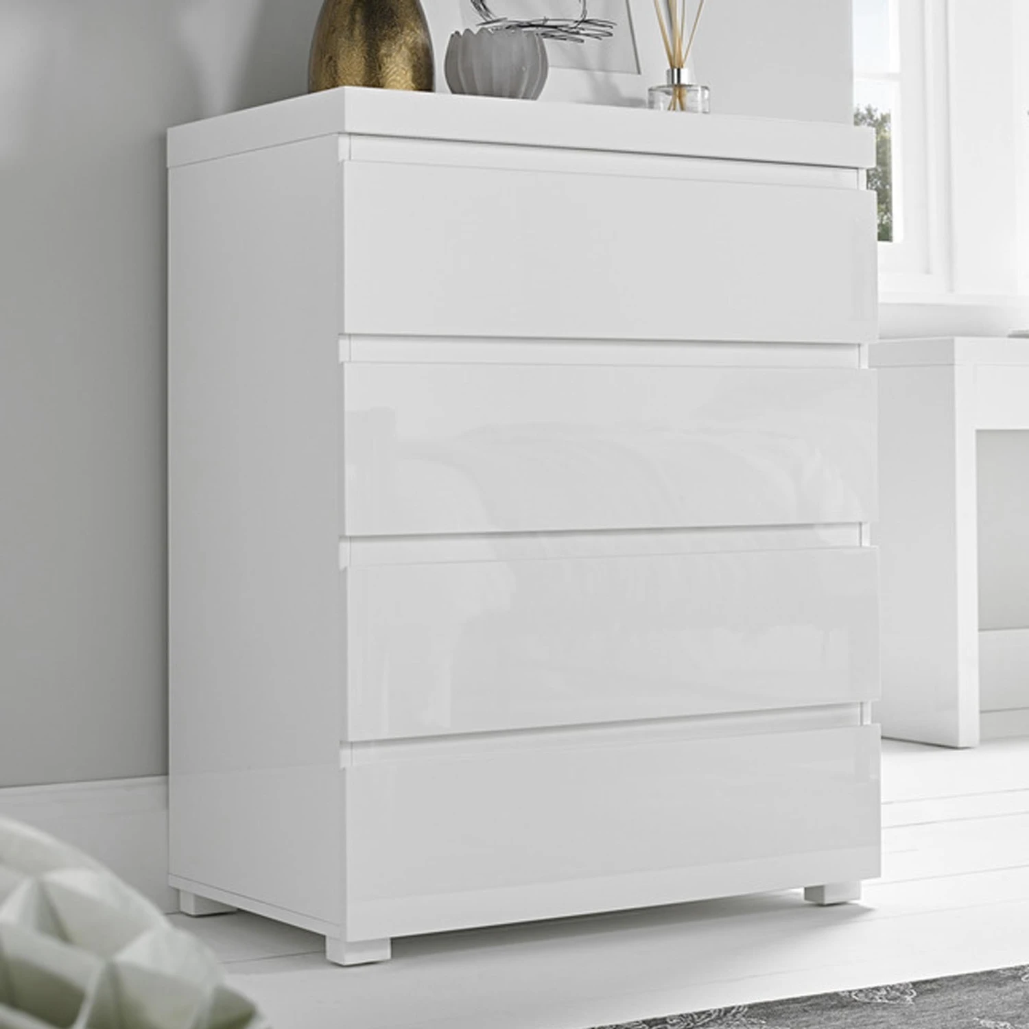 This stunning, modern chest of drawers would be the most perfect and practical new addition to your home, bringing in a modern, sleek style while providing plenty of storage space. This chest features a white sleek exterior and comes with four storage drawers, plenty of space to store things.