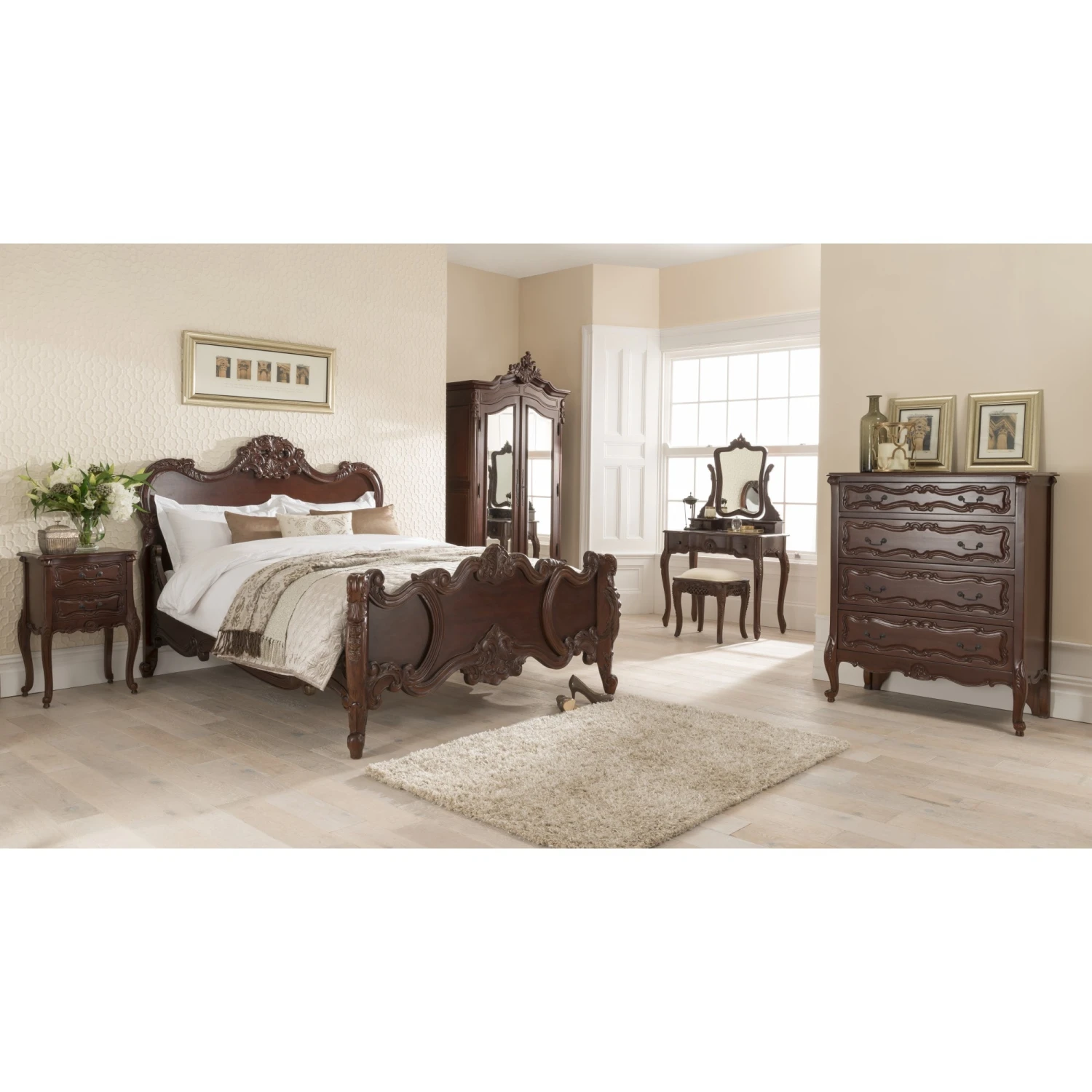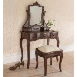 A delightful new addition to our range of French bedroom furniture comes this antique French style dressing table set, handcarved from mahogany. Soft curves and delicate carving are the features of the stunning Raphael range, as this furniture range is the ultimate in ‘boudoir elegance’. Inspired from the 18th century where elegance and luxury were the order of the day, this item is sure to impress, particularly working well with our fantastic shabby chic furniture.