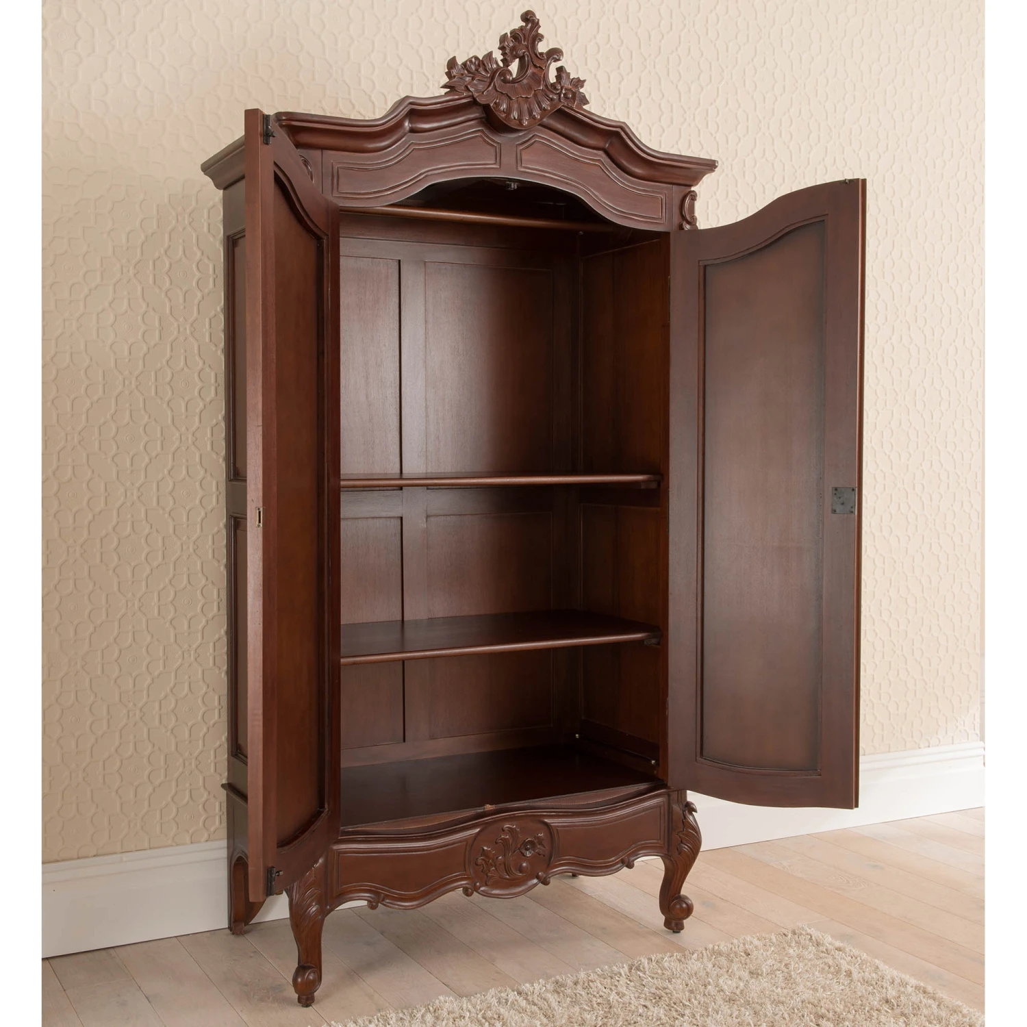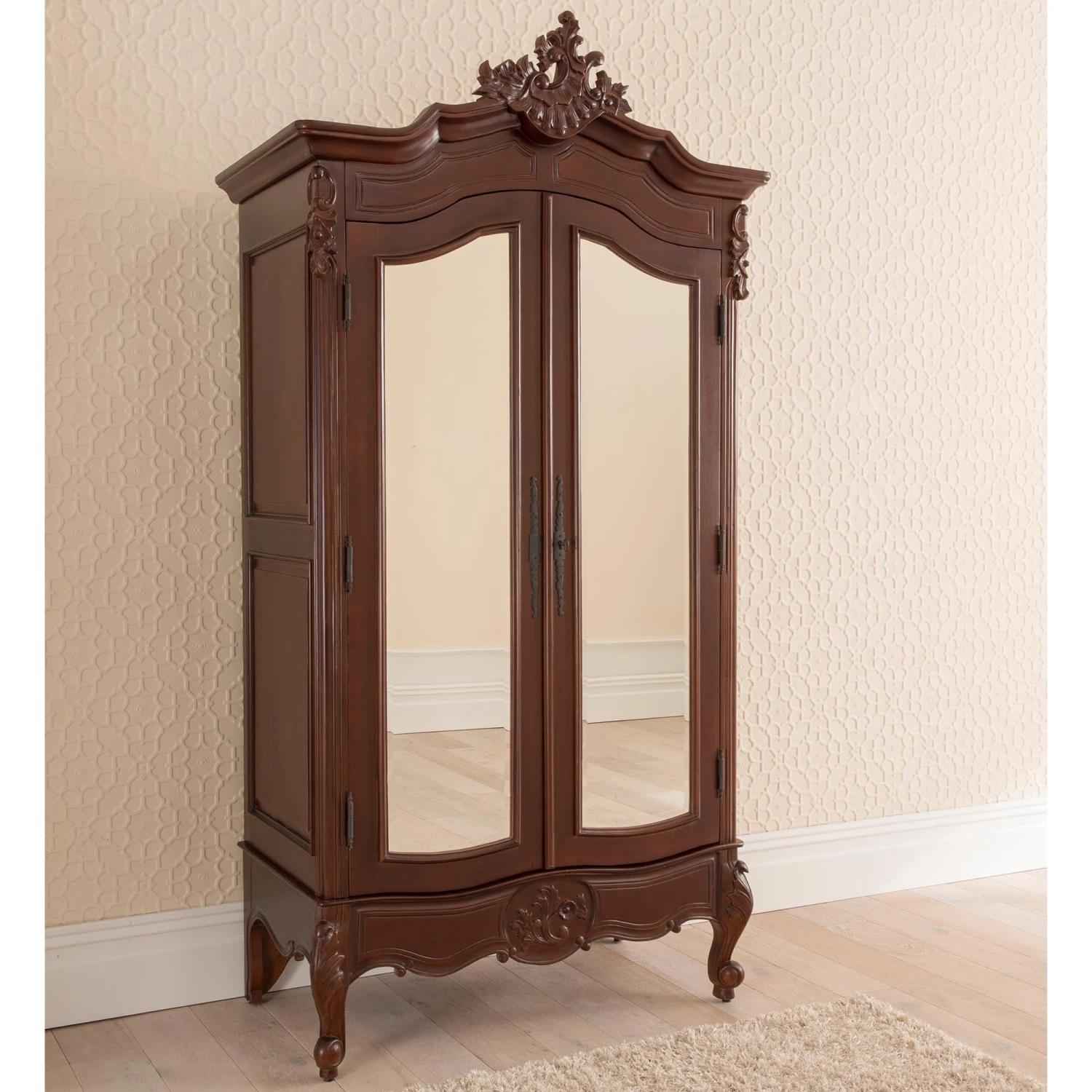 A delightful new addition to our range of French bedroom furniture comes this antique French wardrobe, handcarved from mahogany. Soft curves and delicate carving are the features of the stunning Raphael range, as this furniture range is the ultimate in ‘boudoir elegance’. Inspired from the 18th century where elegance and luxury were the order of the day, this item is sure to impress, particularly working well with our fantastic shabby chic furniture.