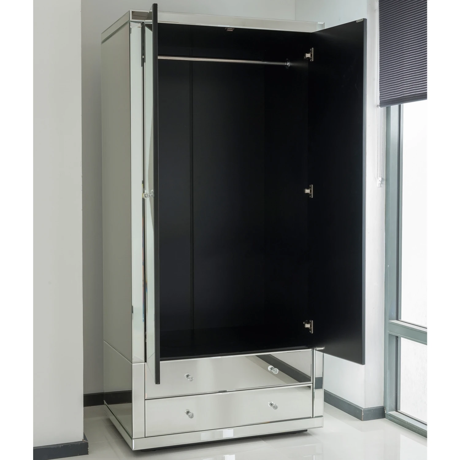 A brand new addition to our range of Venetian mirrored furniture, comes this the delightful mirrored wardrobe from the Romano crystal collection. Inspired by the Italian Venetian period, the versatile design of this range will sit comfortably in a modern or traditional setting making this mirrored wardrobe a welcomed addition to any home.
