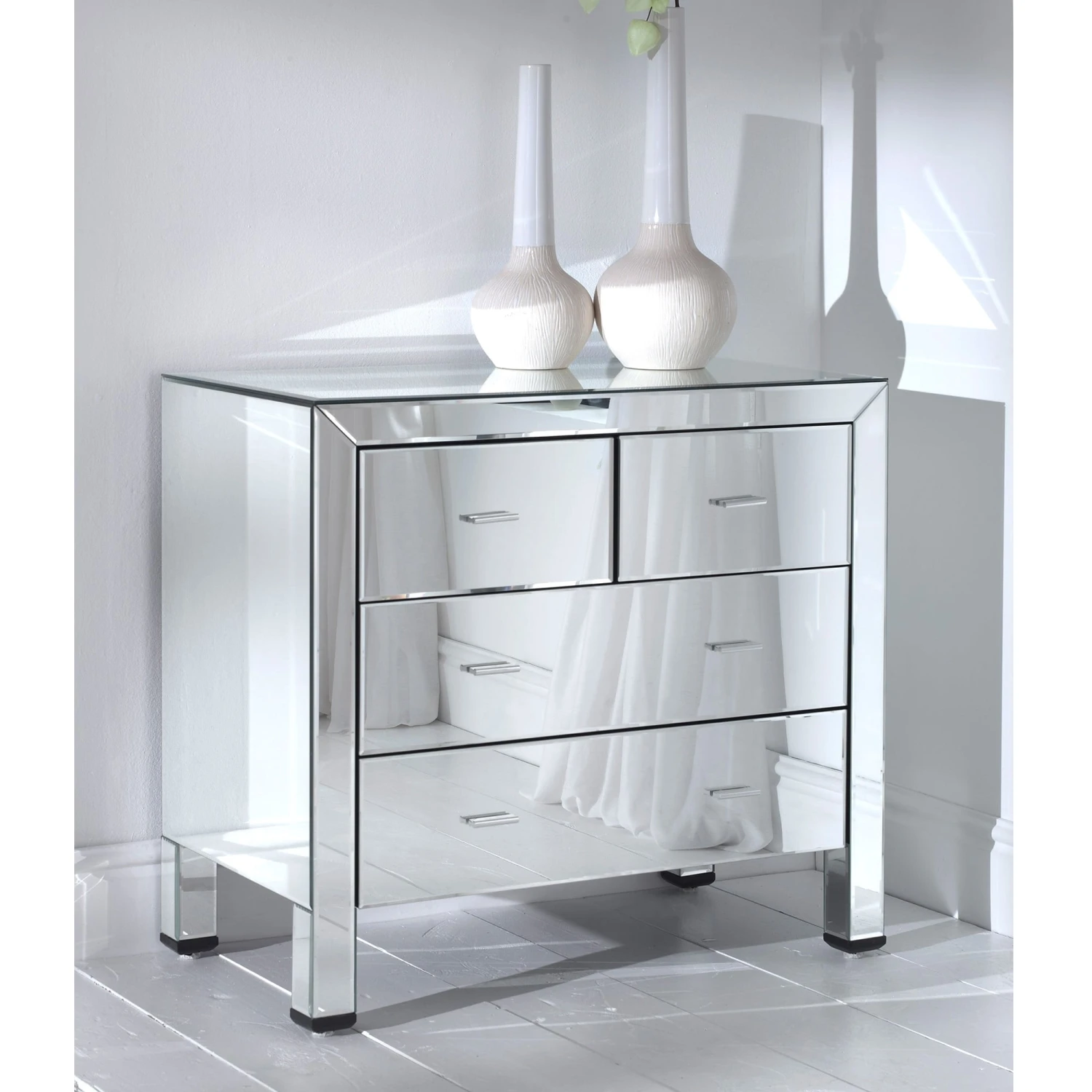 Romano Mirrored Chest 4 Drawer .This Romano Mirrored Chest 4 Drawer has been carefully built using a combination of mirror glass and wooden frames. It has been inspired by the Italian Venetian period, the versatile design of this range will sit comfortably in a modern or traditional setting making this mirrored furniture a welcome addition to any home.