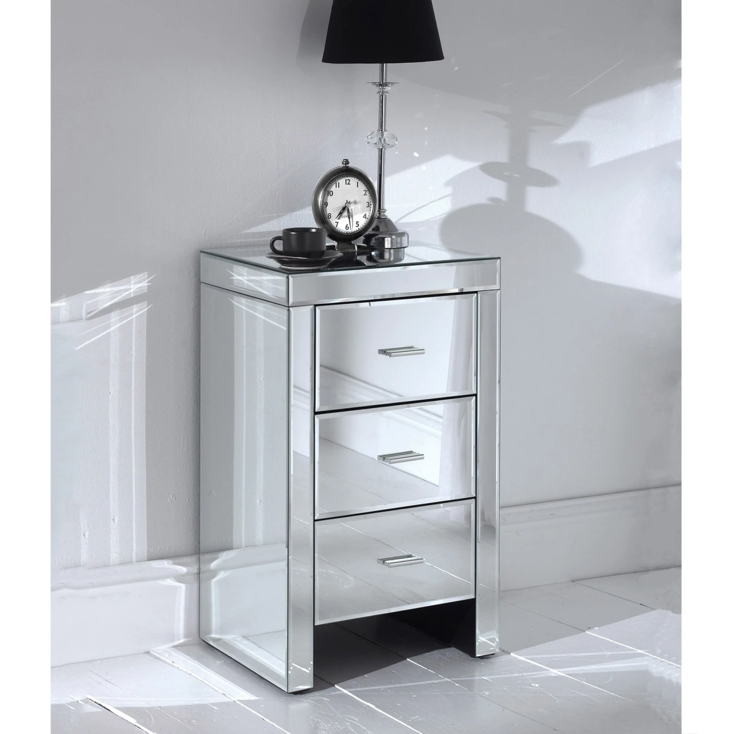 A breath-taking addition to our collection of Venetian mirrored furniture. This slim Romano mirrored bedside has been carefully built using a combination of mirror glass and wooden frames. It has been inspired by the Italian Venetian period, the versatile design of this range will sit comfortably in a modern or traditional setting making this mirrored slim bedside a wonderful addition in your home, perfect to give the appearance of a bigger brighter room.