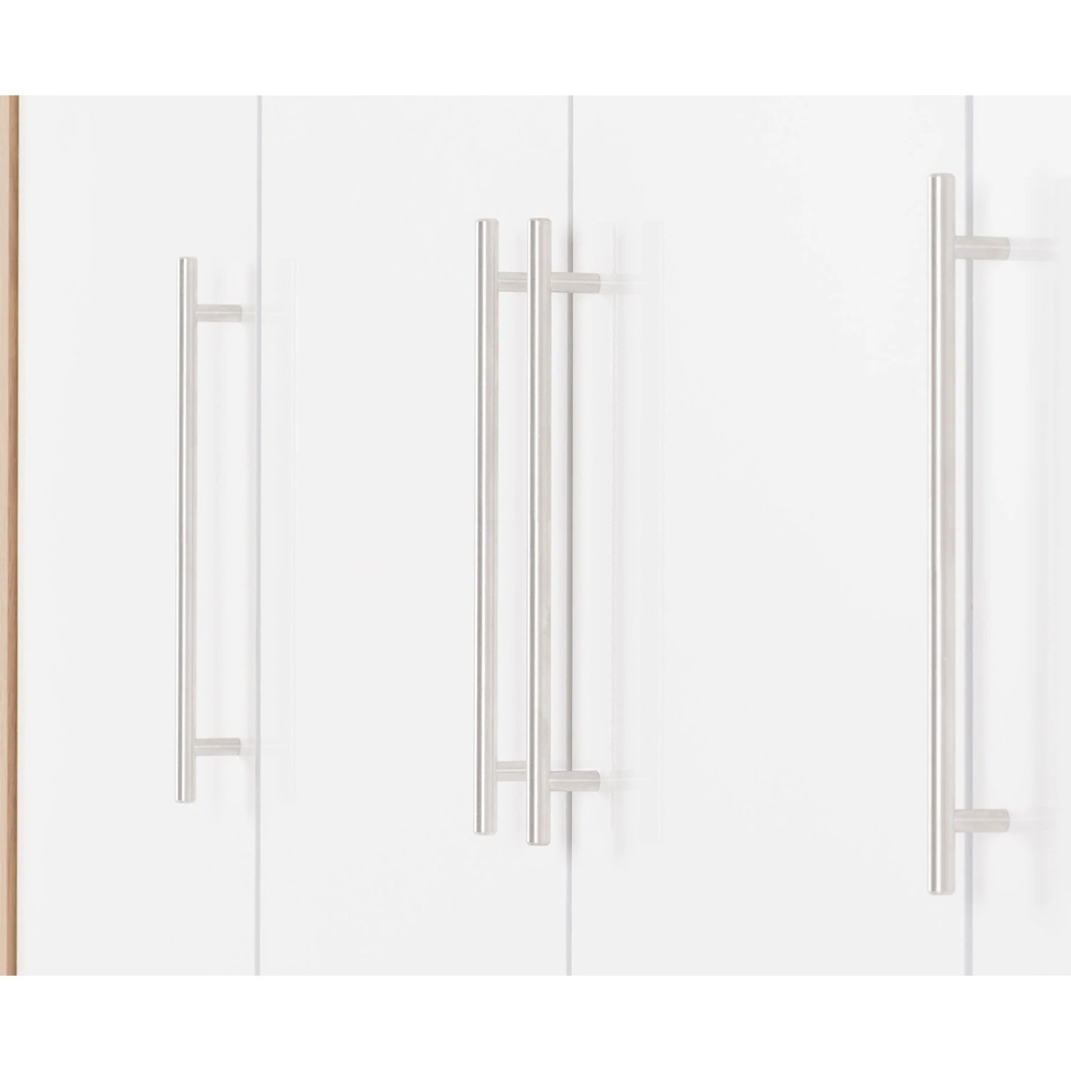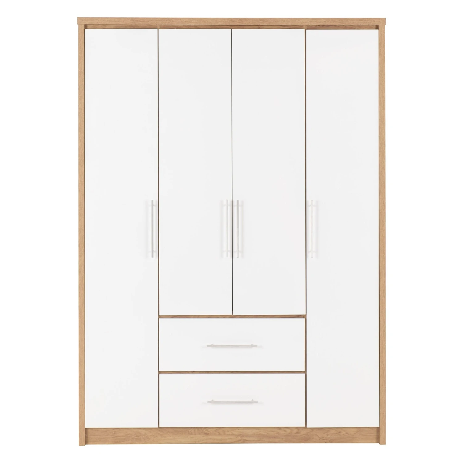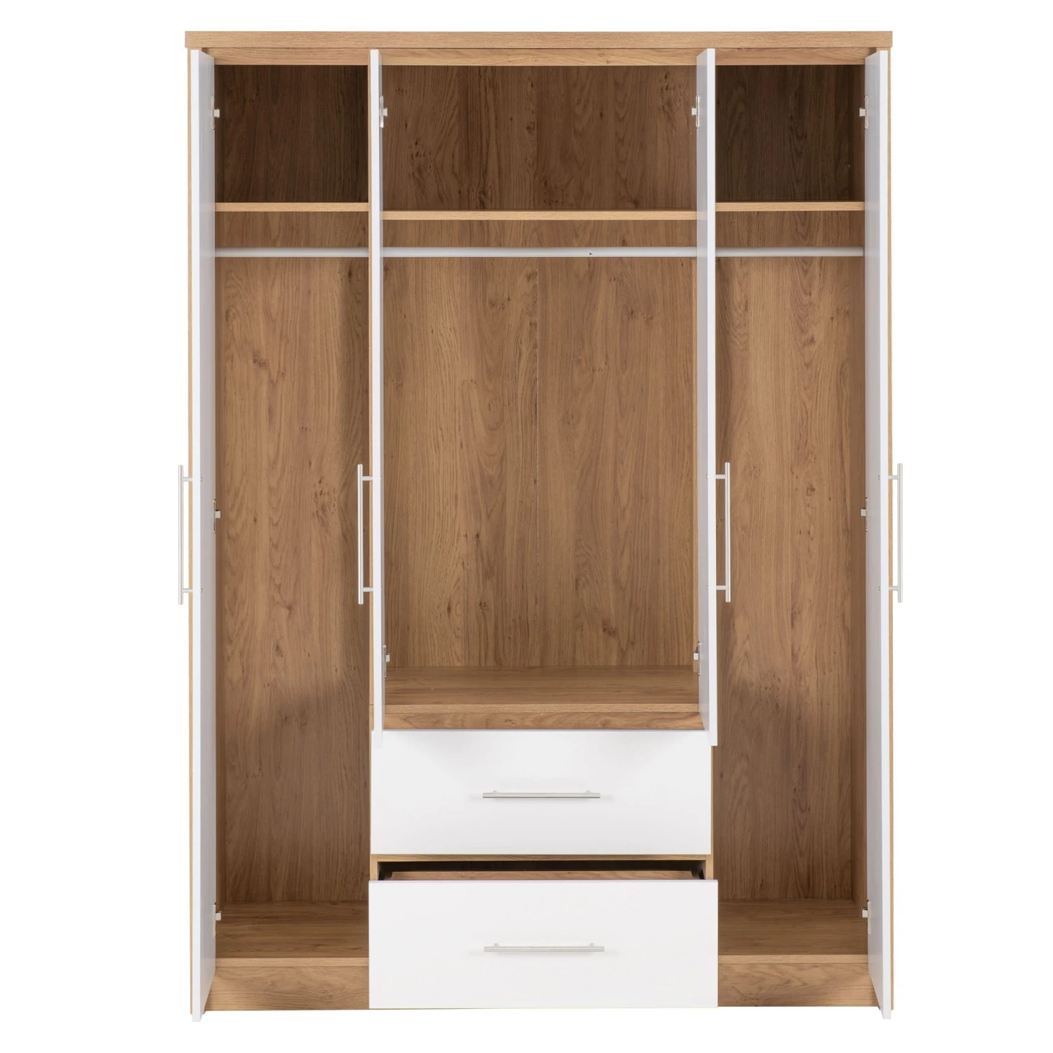 Designed to provide you with vast amounts of storage space for those who always seem to be running low, this Seville White Gloss & Light Oak 4 Door 2 Drawer Wardrobe is an ideal solution to that problem. Coming with 4 doors, featuring internal hanging rails and shelving with 2 drawers below, it allows you to store your shoes, clothes, accessories and much more. With a white high gloss and light oak finish, it brings an ultra stylish and contemporary look to your bedroom furniture, upgrading your decor in an instant. It’s use of light colours enables you to match against other furnishings, giving you a versatile product that is well-built and will last many years.