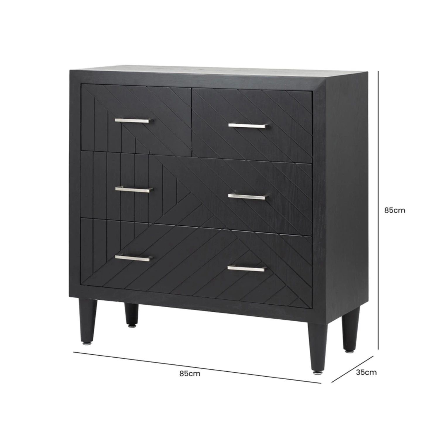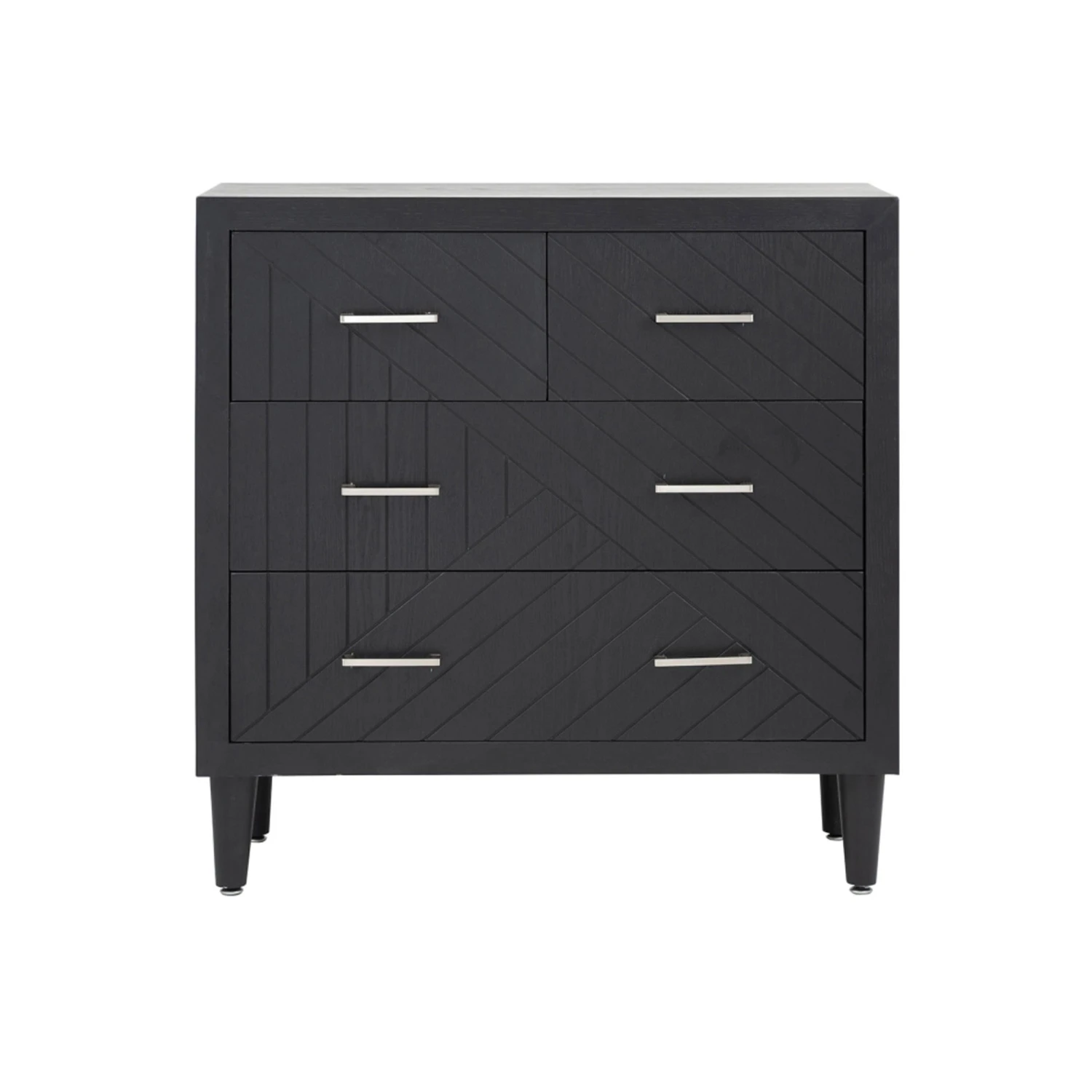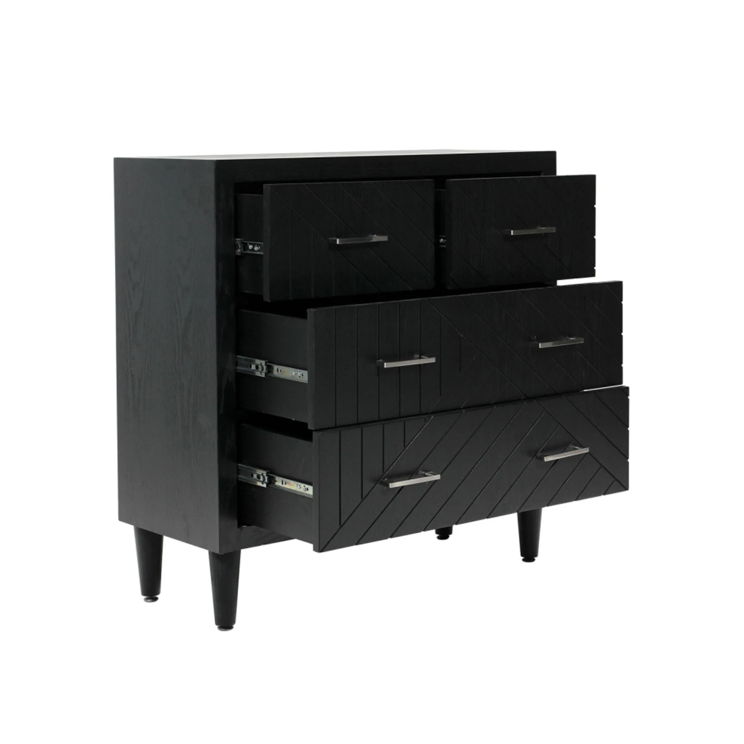 A versatile piece of furniture, the Solano Black 4 Drawer Chest can be used in bedrooms, hallways or even dining rooms with its super stylish contemporary design featuring a chevron pattern. Crafted from MDF and veneer, it has a bold black finish and is complimented with slim metal handles for a sleek and modern finish. With 4 drawers for storage space, it provides all you need for clothing garments, sheets, or towels.