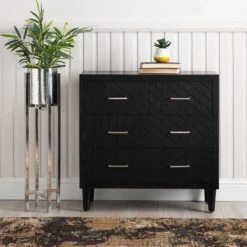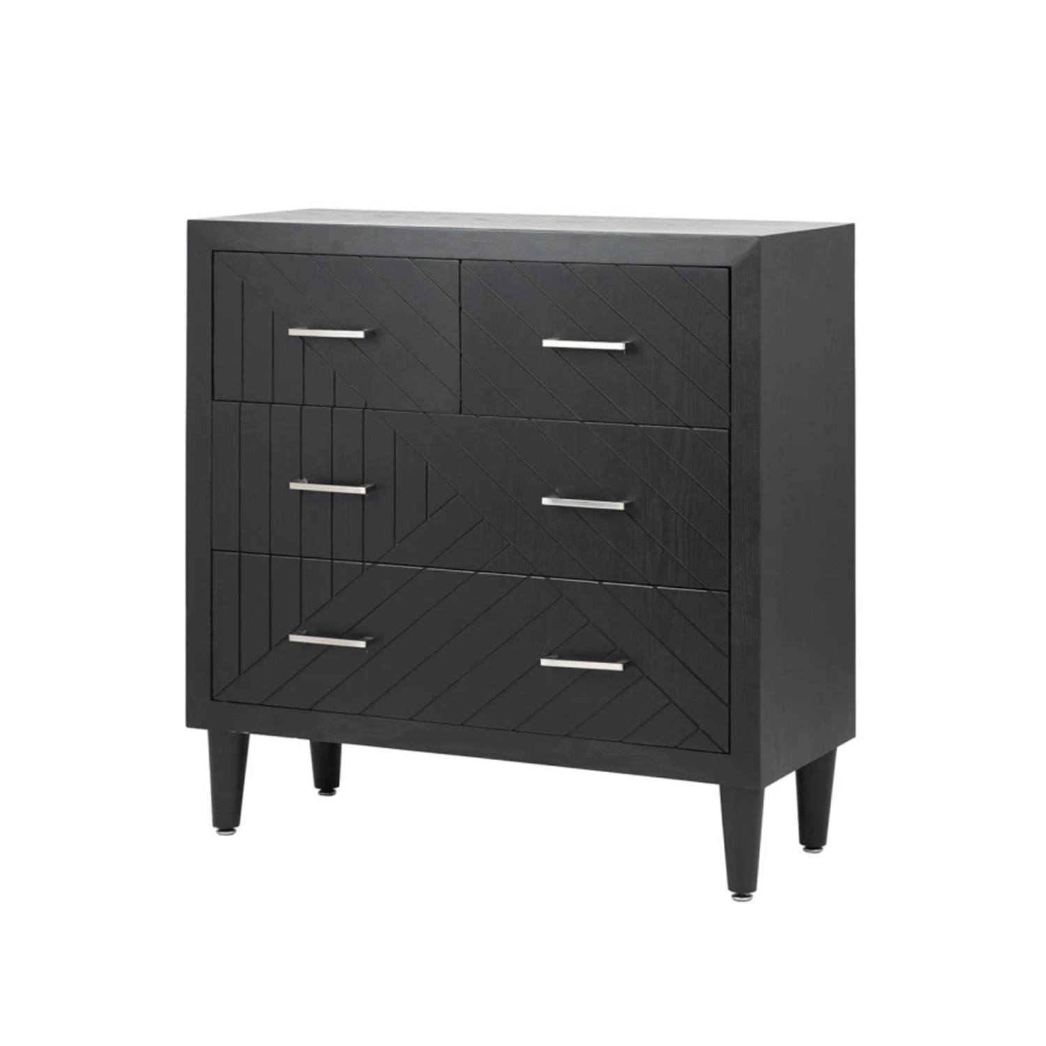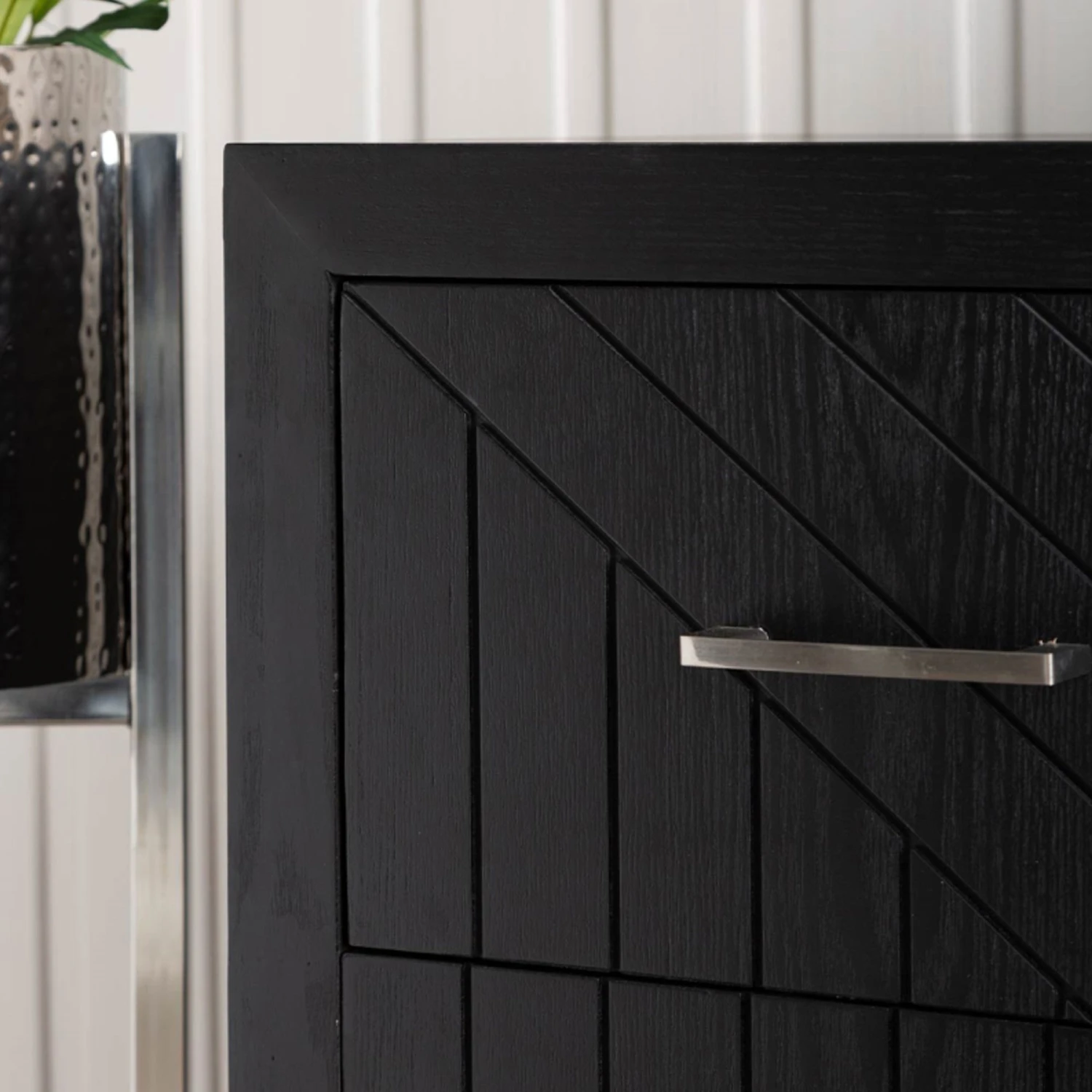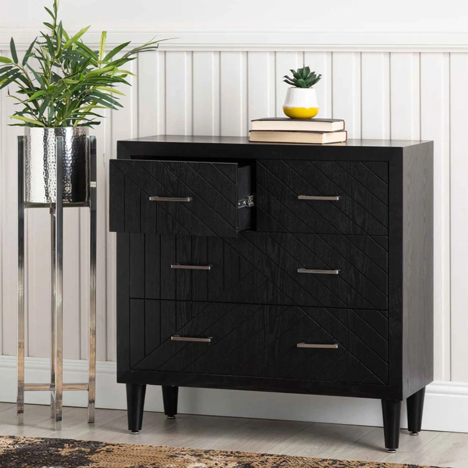 A versatile piece of furniture, the Solano Black 4 Drawer Chest can be used in bedrooms, hallways or even dining rooms with its super stylish contemporary design featuring a chevron pattern. Crafted from MDF and veneer, it has a bold black finish and is complimented with slim metal handles for a sleek and modern finish. With 4 drawers for storage space, it provides all you need for clothing garments, sheets, or towels.