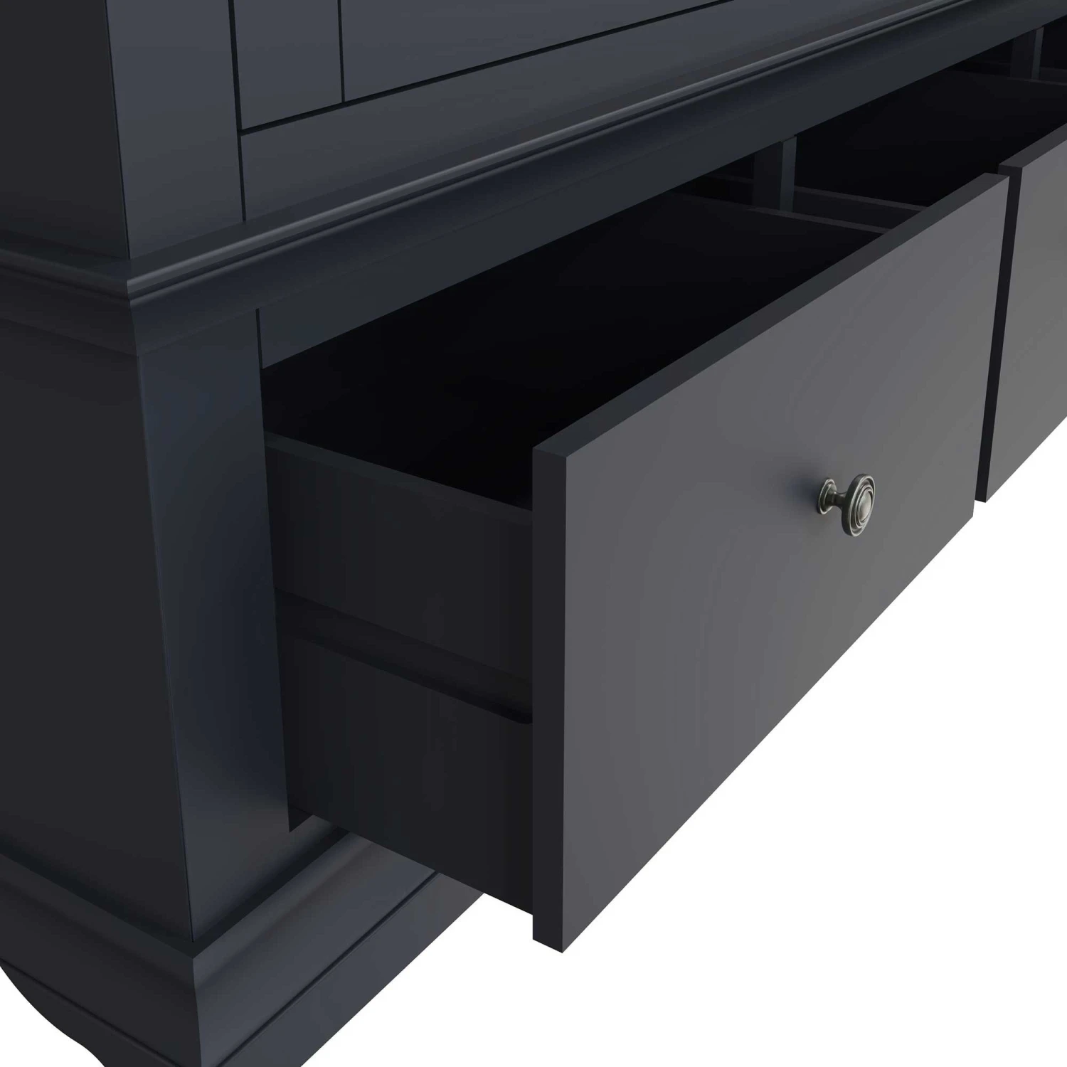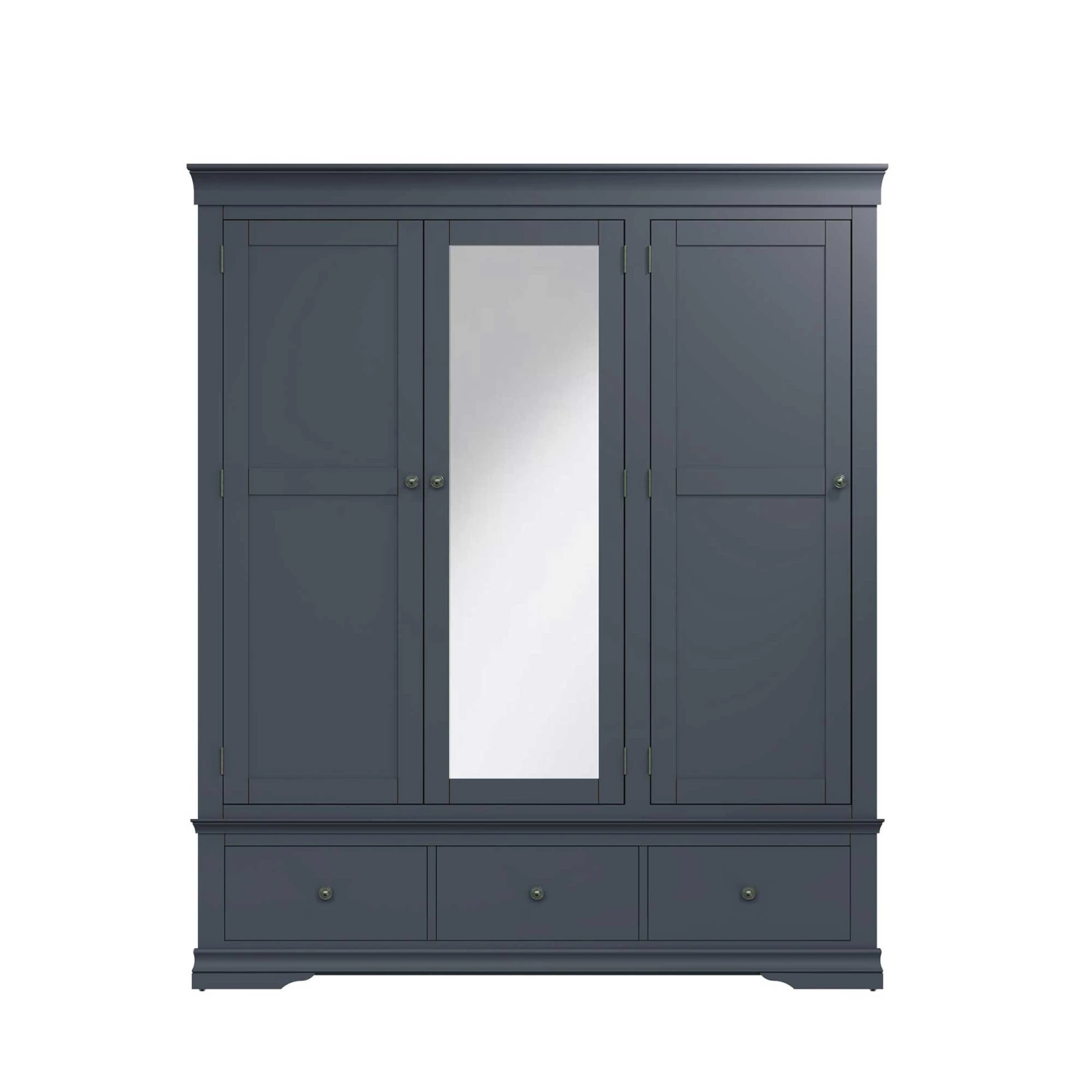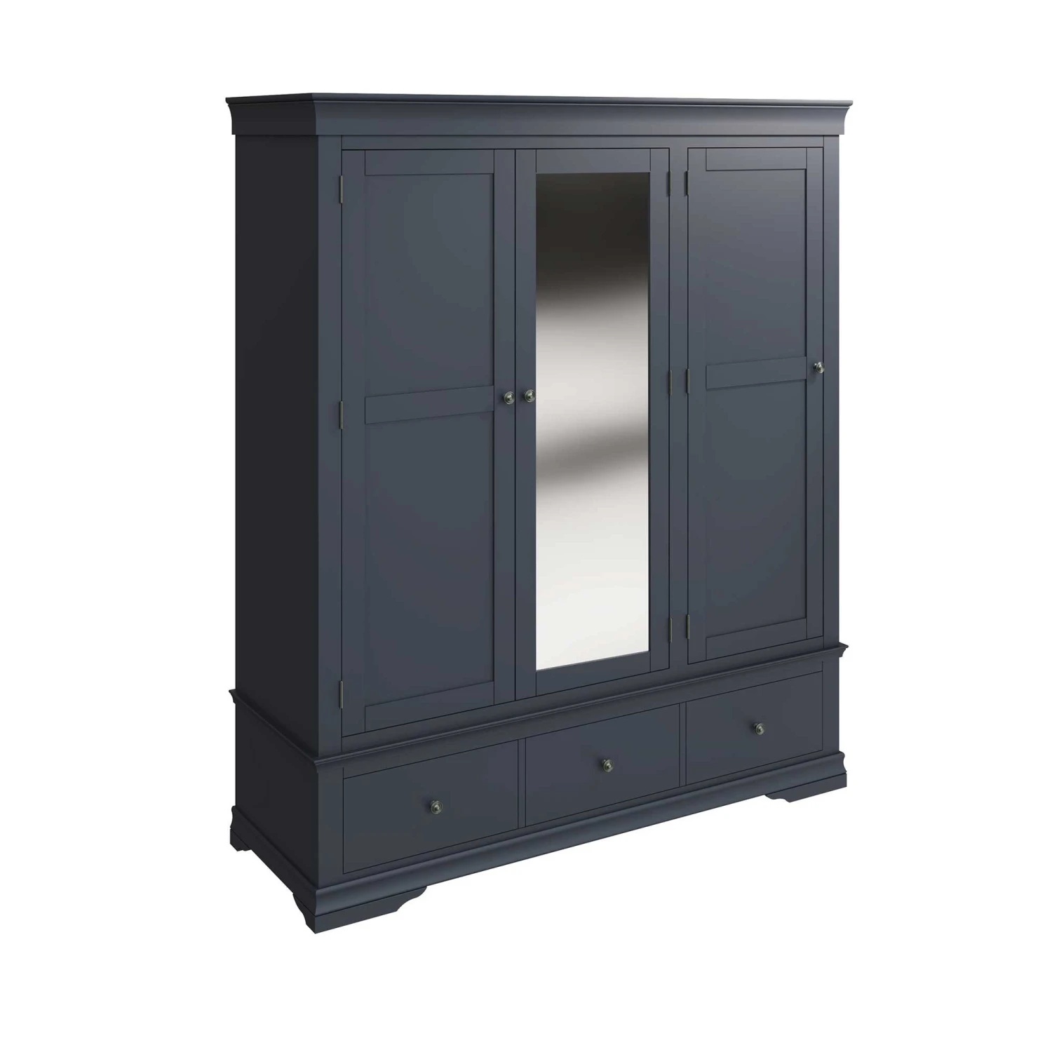Complete the new Swindon Midnight Grey Bedroom Collection with this Swindon Midnight Grey 3 Door 3 Drawer Wardrobe. This large wardrobe is finished in painted midnight grey and showcases a beautiful timeless look. The modern style wardrobe has 3 doors, with a mirrored panel on the central door to help you get ready for that special occasion! This wardrobe also features a large hanging area and 3 extra drawers for storing bedding and towels. Finished with pewter effect handles and unique shaped legs. Matching items available.