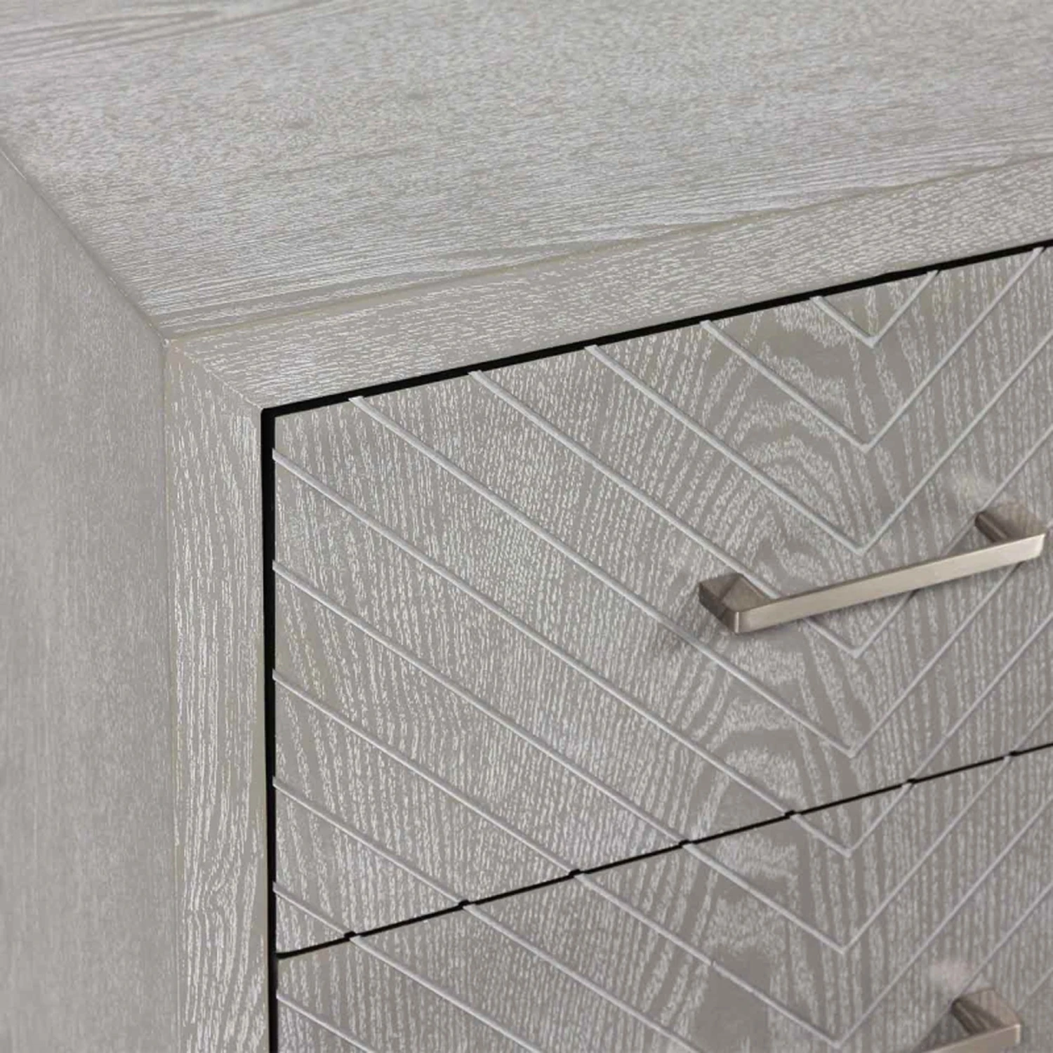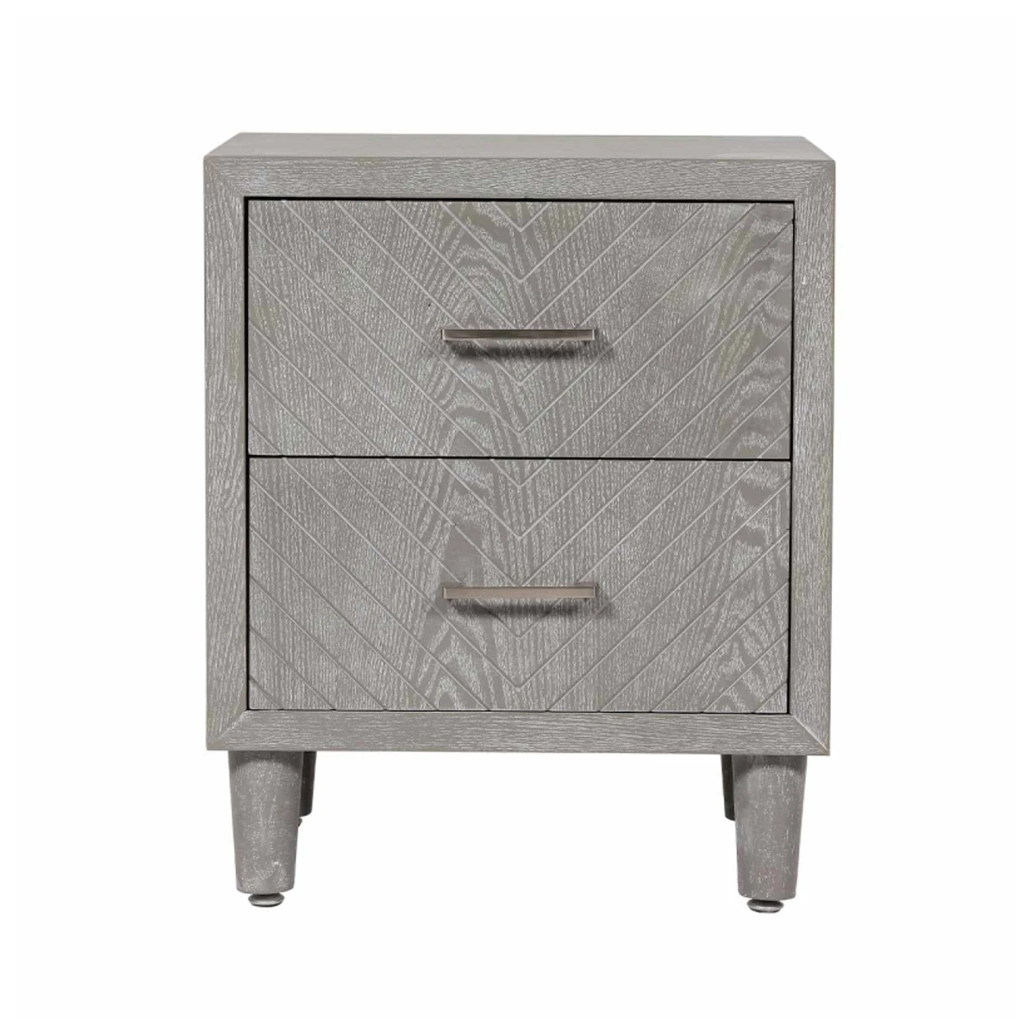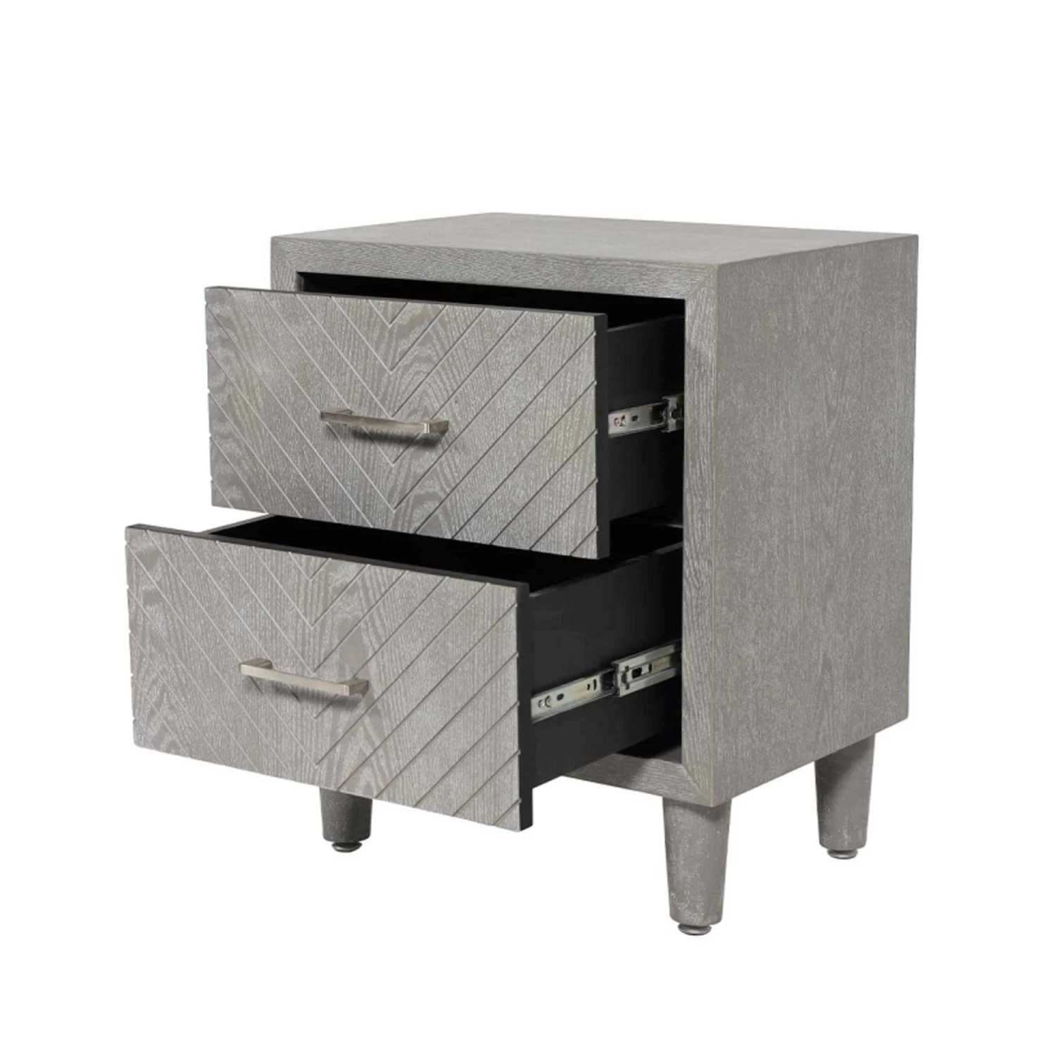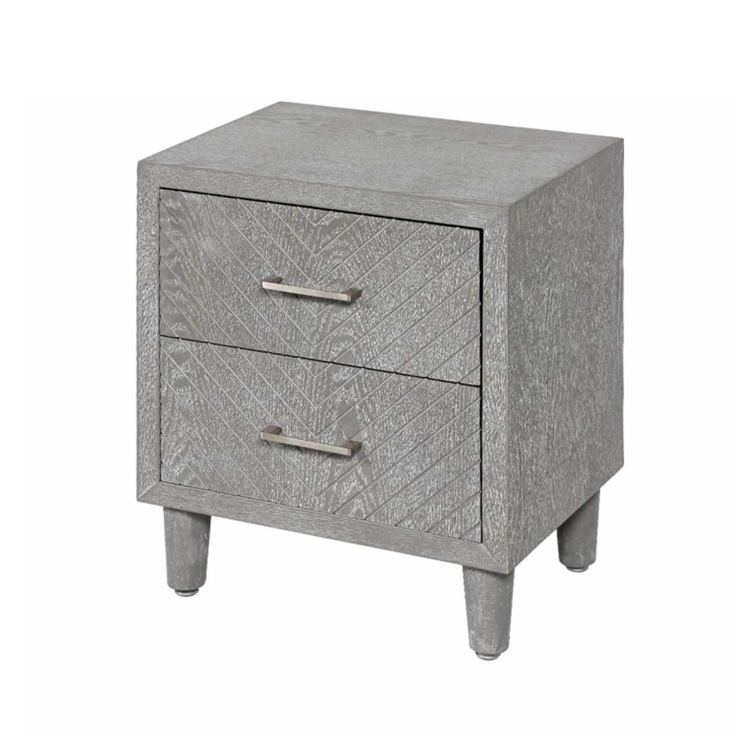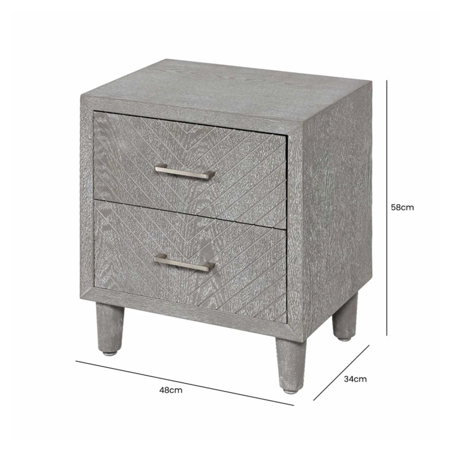 A functional piece of bedroom furniture that is not only stylish but provides practical storage space, comes this Venus 2 Drawer Grey Bedside Cabinet. Crafted with high quality materials for a long-lasting build, it has 2 drawers with a chevron detailing, complimented with slim metal handles and a grey-washed elm grain finish. Great for keeping your bedtime essentials to hand, it will be the perfect fit by the side of your bed.
