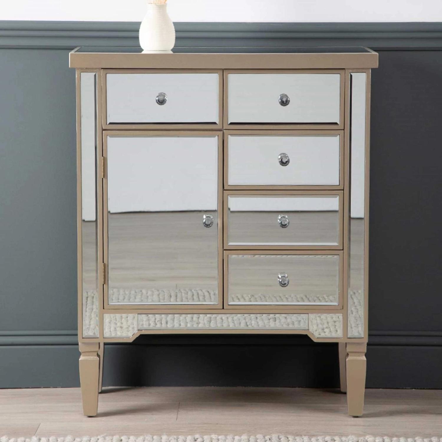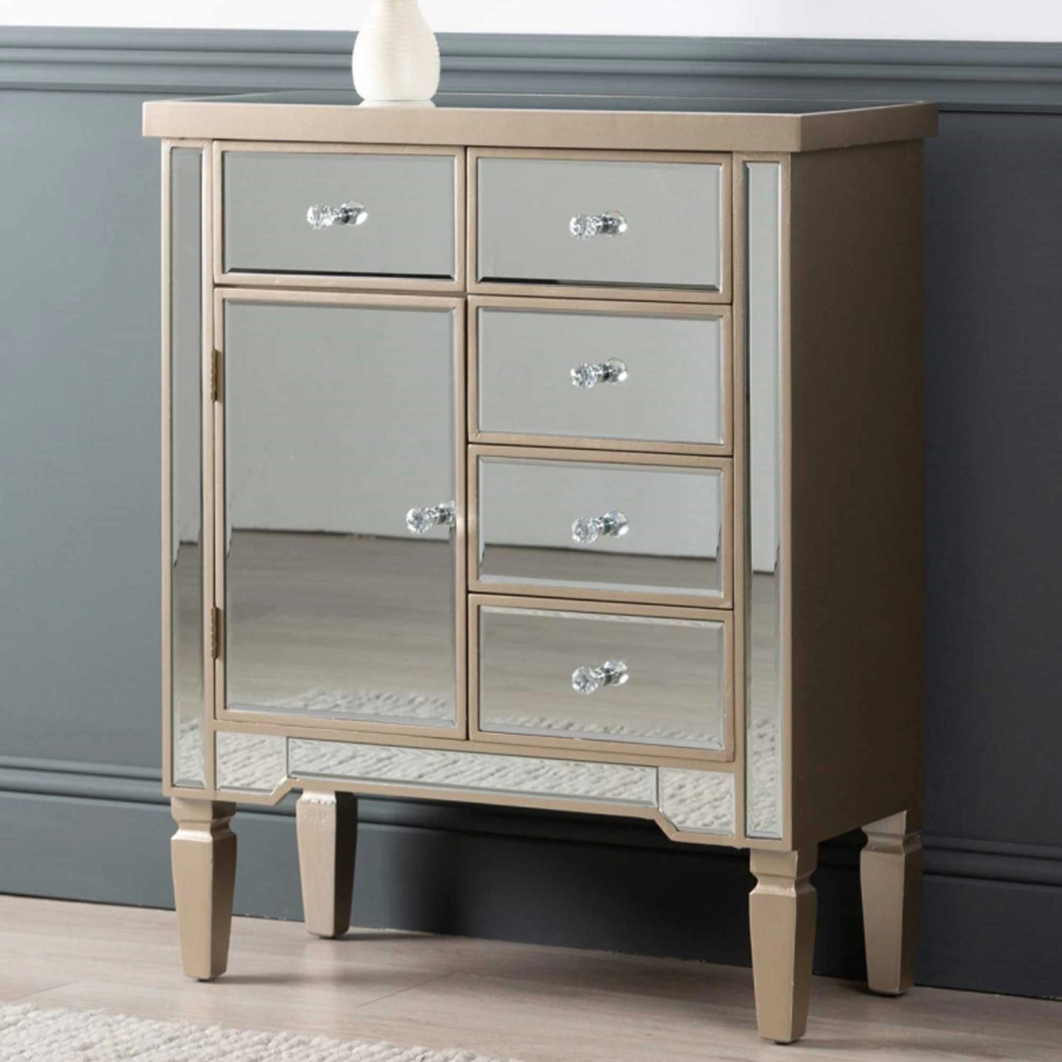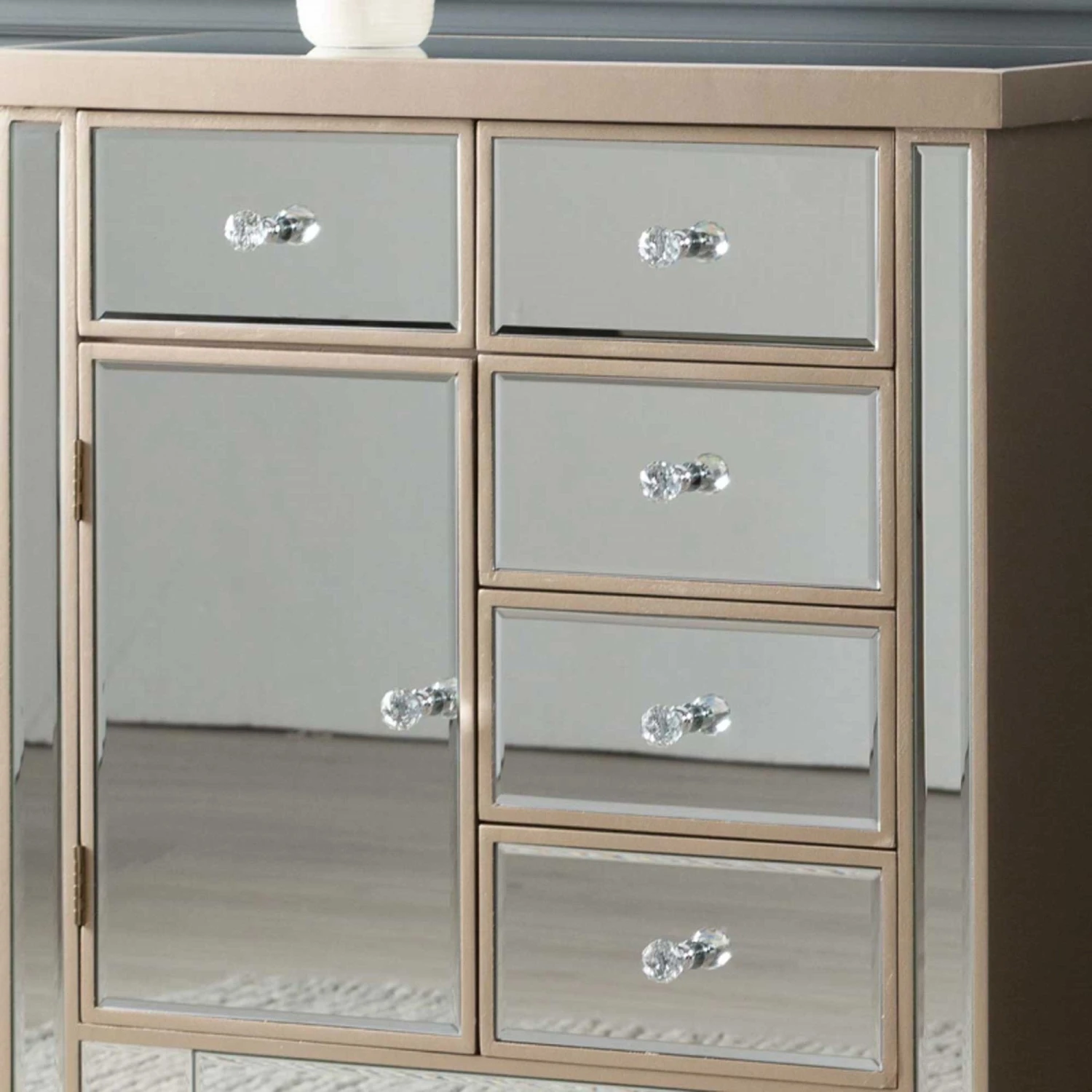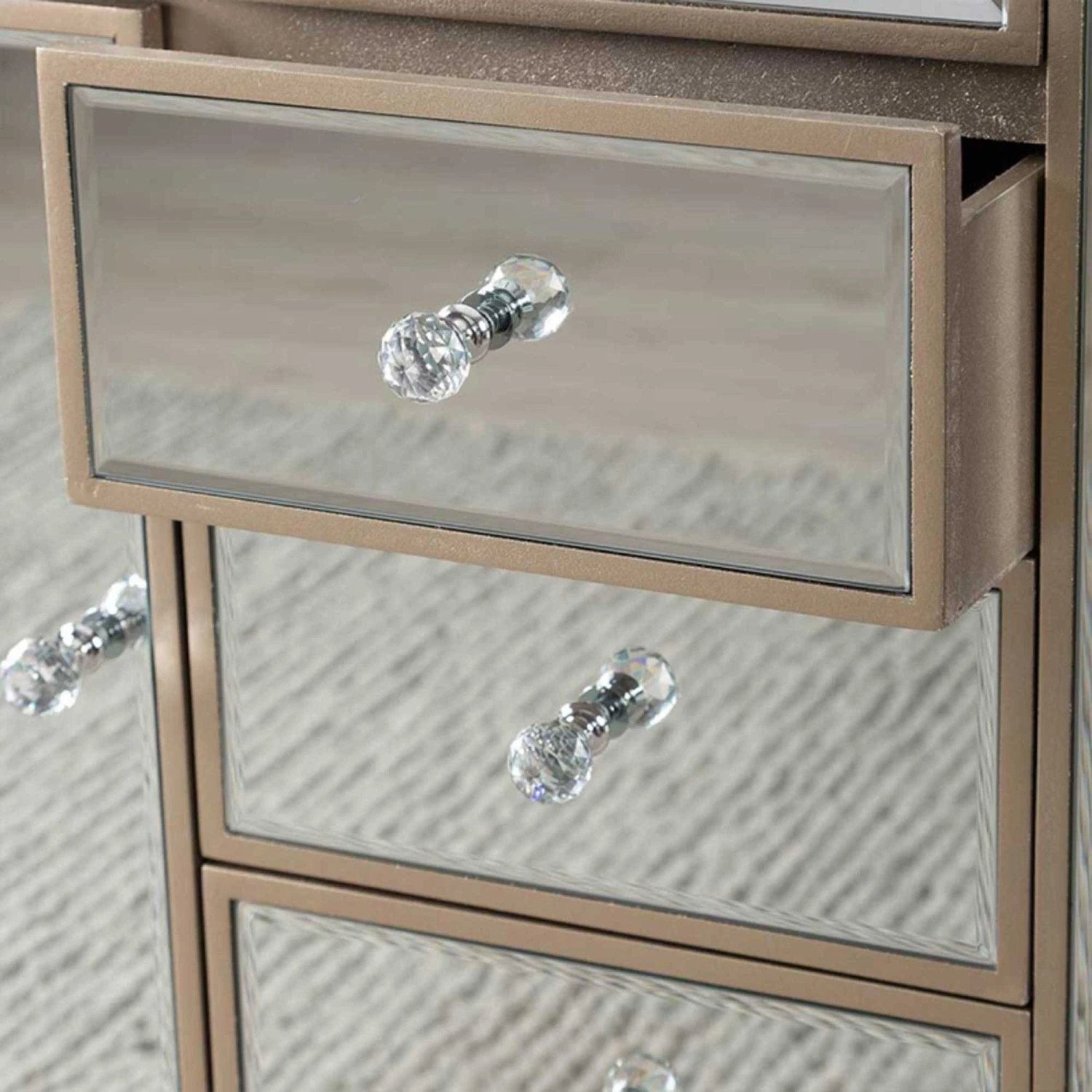 The delectable Vista Dark Champagne Bedside Cabinet is a stylish piece that has 5 storage drawers with crystal handles. This bedside table also features a mirrored table top and is finished in a divine dark champagne.