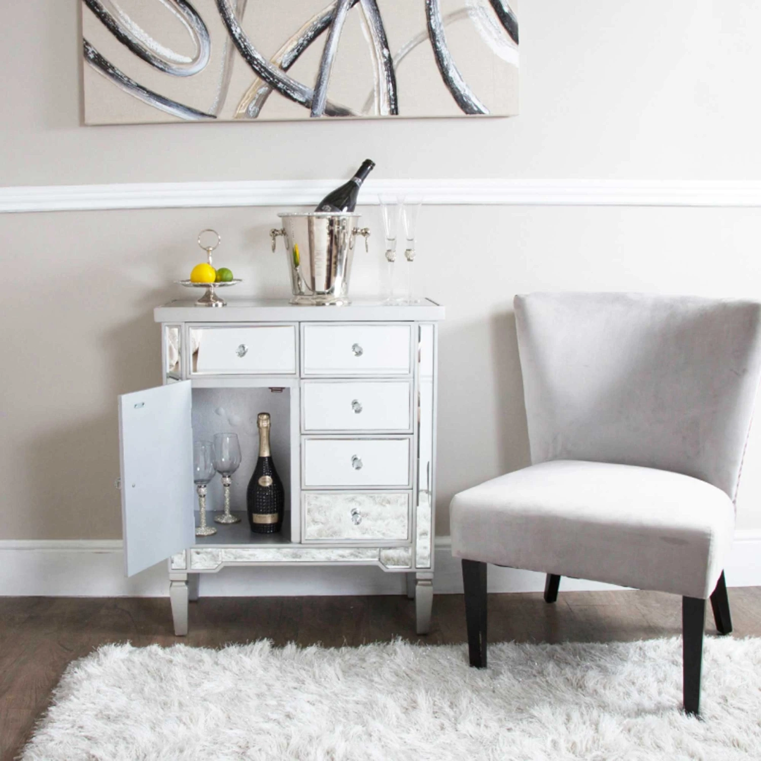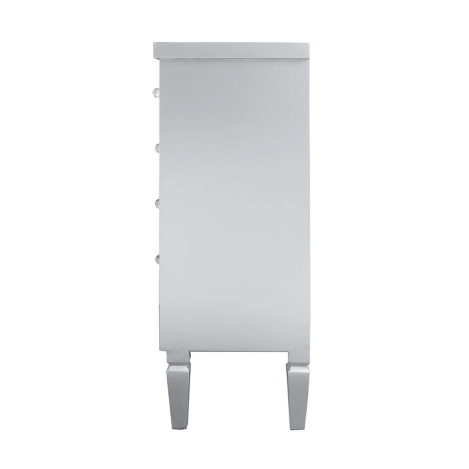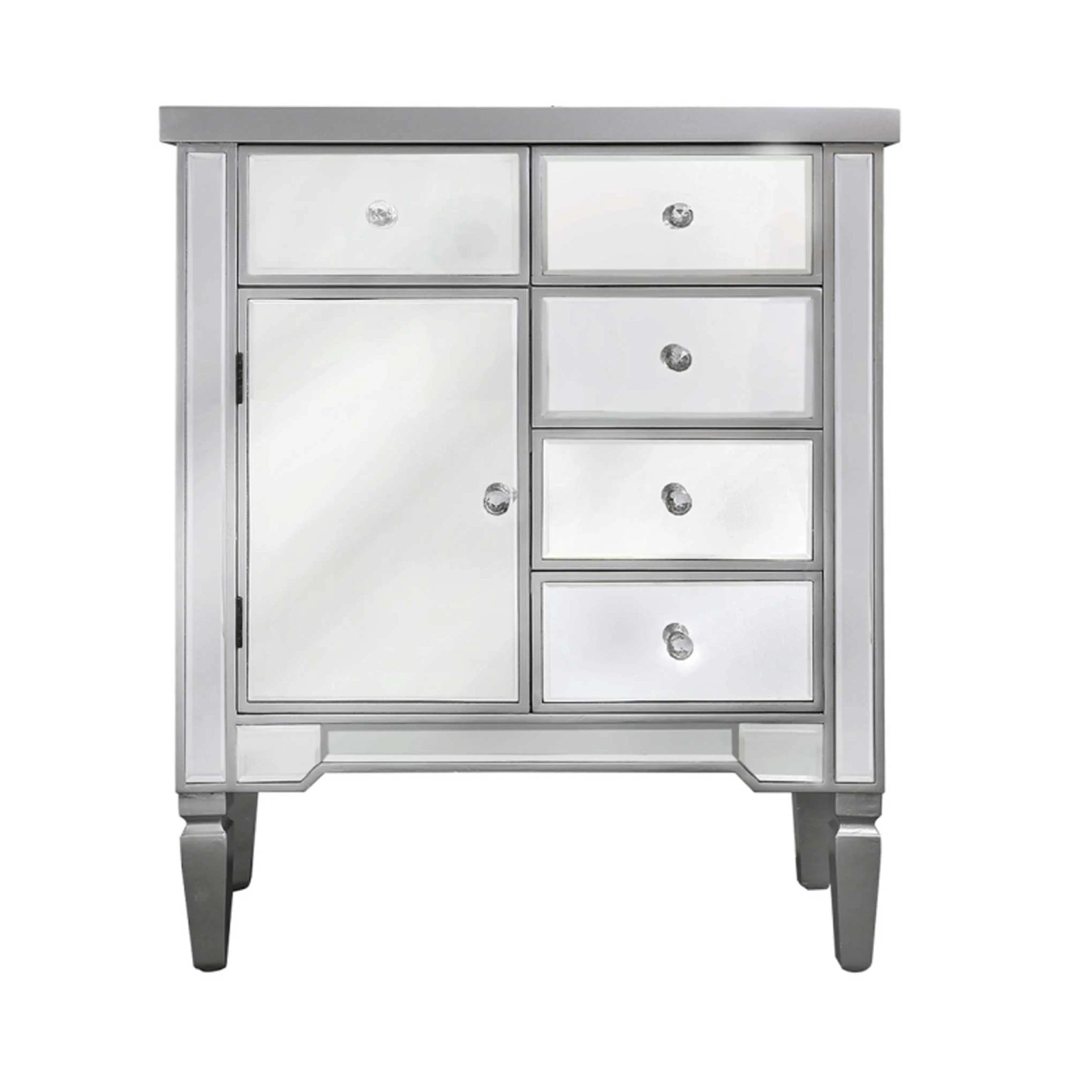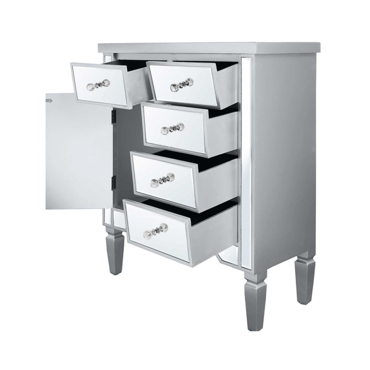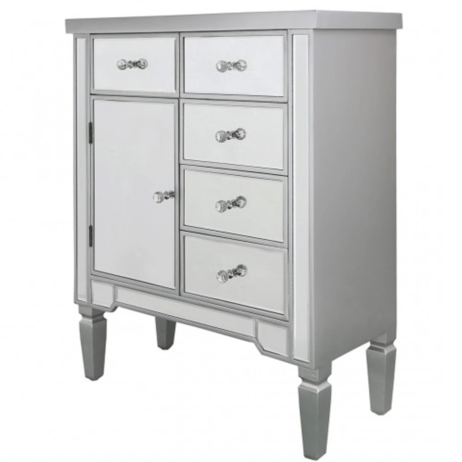 Introduce to your home this stunning wooden chest, this is coming with a silver wooden finish and is sure to impress. It also comes with 5 drawers and 1 cupboard giving you a lot of storage space to put everything that is needed. Also, the mirrored finish makes it a lot easier to brighten up any room and stand out, the crystal handles give it a real glamorous look.