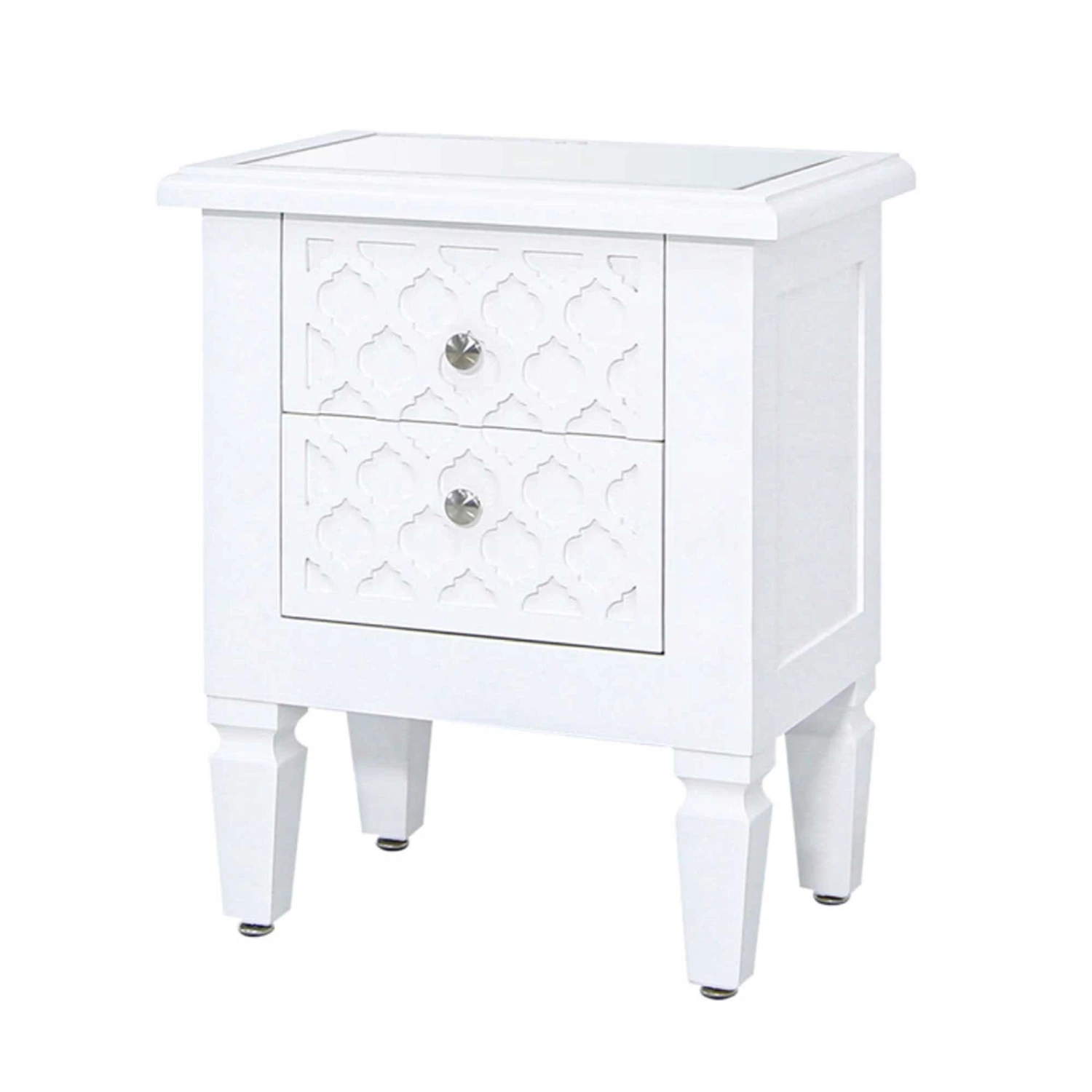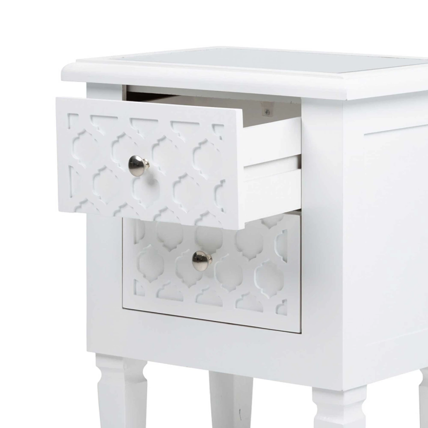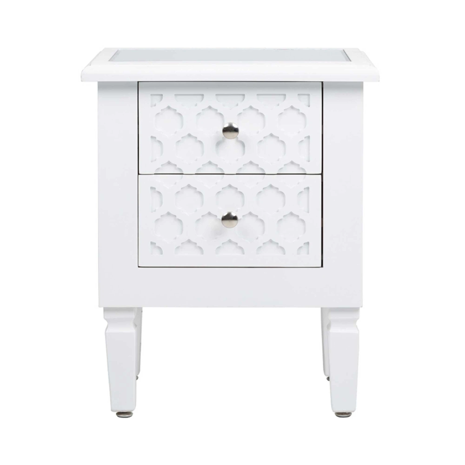 Add to your home interior with a simple splash of colour with the newest range to our collection of modern furniture, coming from the Benton Collection this beautiful White Benton Wooden Bedside is made from wood and features a mirrored top. Also having two spacious drawers for all your storage needs this Bedside table is a must have addition to add to your home interior and is ensured to last a lifetime.